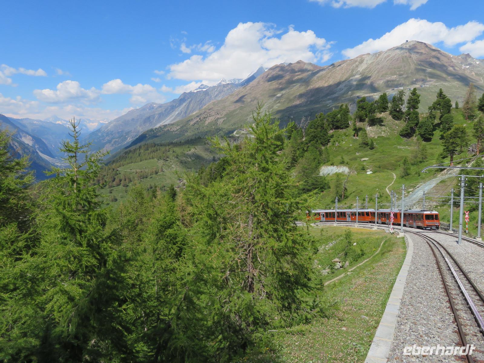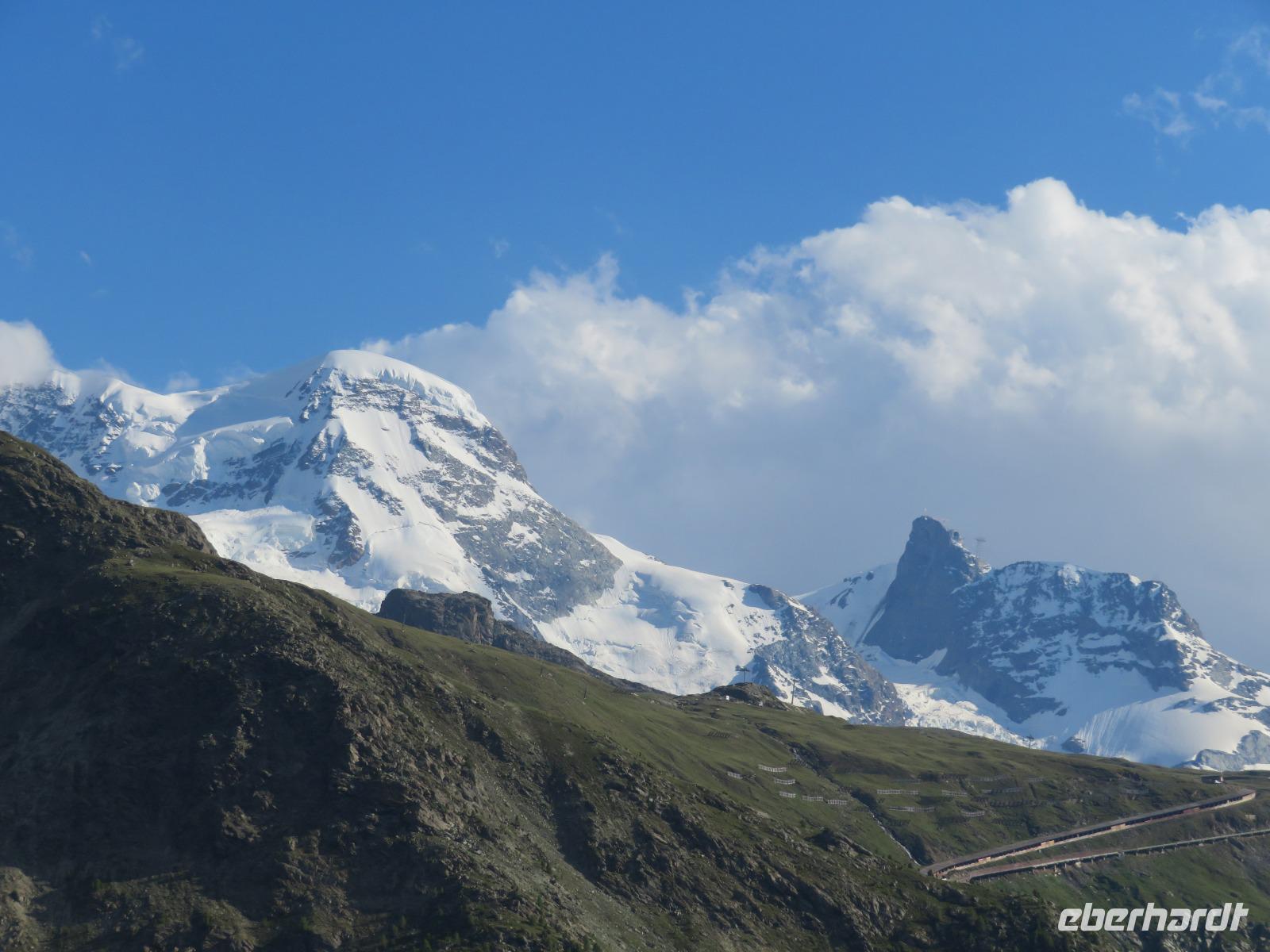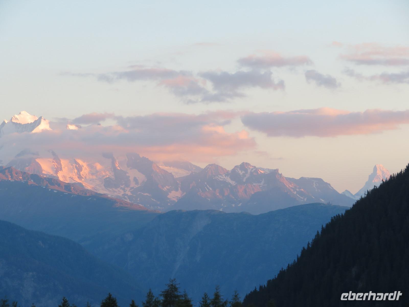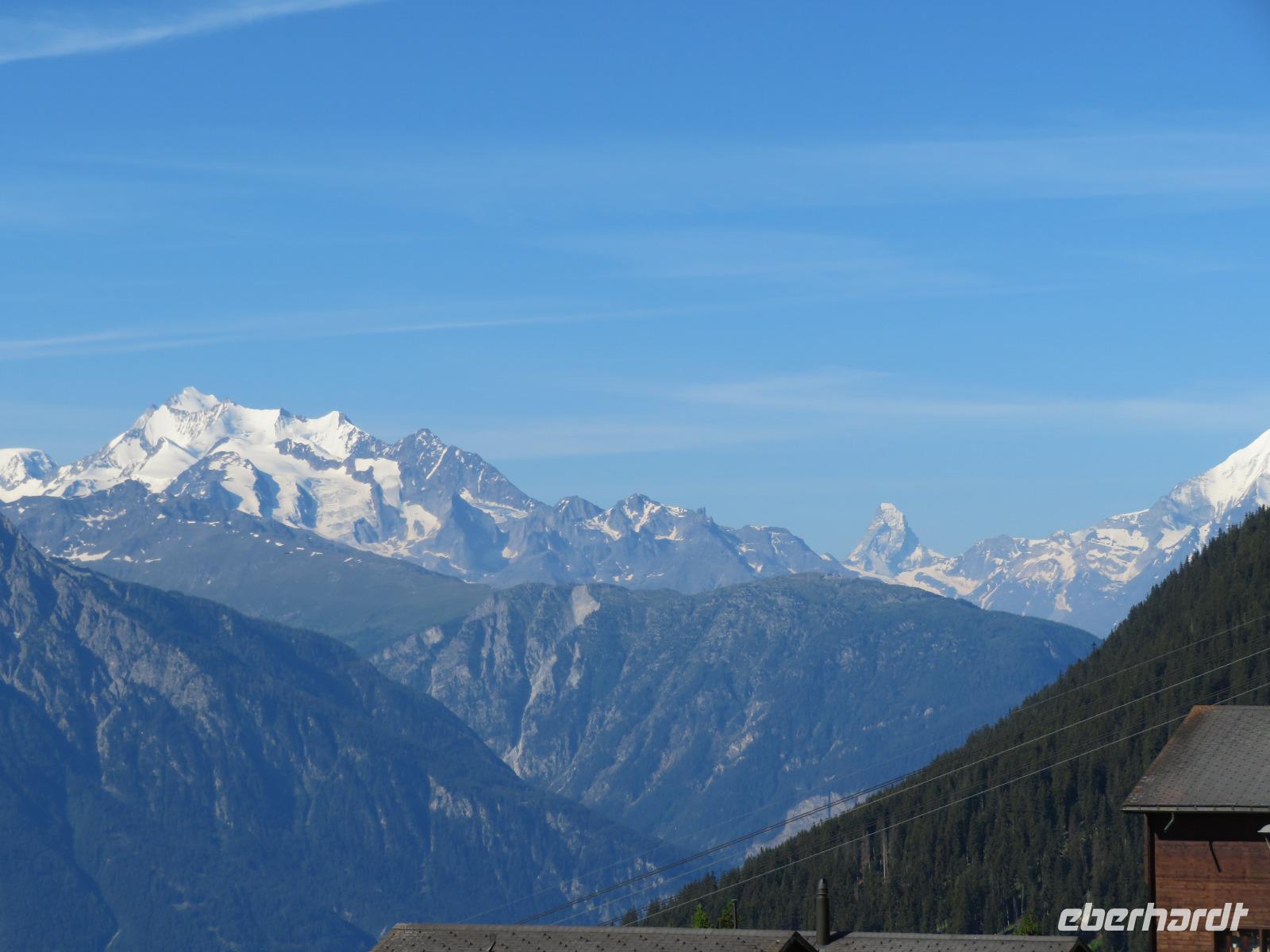 Am Morgen geniessen wir nochmals die einmalige Ruhe auf der Riederalp. Wir lassen unsere Blicke bei herrlichstem Sonnenschein wieder über das Panorama der Walliser Alpen schweifen. Heute heißt es Abschied nehmen von der Alp. Wir fahren mit der Seilbahn hinab ins Rhônetal. Ingo, unser Chauffeur hatten bereits das Gepäck verstaut und so starten wir in Richtung Brig, dem Hauptort im Oberwallis und wichtigem Verkehrsknotenpunkt. Das imposante Stockalperschloss prägt die Stadt. Kasper Joder Stockalper war im 17. Jahrhundert der mächtige Herrscher über die Stadt und die Region. Man nannte ihn auch „Fugger der Alpen". Sein Hauptgeschäft war der Handel mit allem was sich kaufen und verkaufen ließ. Er baute den Seidenhandel über den Simplonpass und den Salzhandel aus. Die Säumerpfade - frühere Handelspfade -wurden auf Weisung Stockalpers ausgebaut. Mit dem Stockalperschloss erschuf sich der Fugger und der Stadt ein Denkmal. Die drei Zwiebeltürme, sind benannt nach den heiligen drei Königen Kaspar, Melchior und Balthasar. Sie sind weithin zu sehen. Wir spazieren durch die Altstadt. Unsere Reise führt uns nun nach Raron. Hier befindet sich hoch auf einem Felsen die Burgkirche aus dem 16. Jahrhundert. An der Südwand der Kirche fand der bekannte deutsche Dichter Rainer Maria Rilke seine letzte Ruhe. Er lebte und arbeitete viele Jahre im Wallis und wollte hier auch seine letzte Ruhe finden. Unterhalb der Kirche entstand 1974 eine Felsenkirche . Dieser statten wir einen Besuch ab. Anschließend fahren wir durch das Mattertal nach Täsch. Unser Gepäck wird wieder in Container umgeladen und mit dem Zug erreichen wir den berühmten Ferienort Zermatt am Fuße des Matterhorns. Nur eine kleine Wolke liegt noch vor dem Berg der Berge. Wir bummeln zum Hotel Perren und beziehen unsere gemütlichen Zimmer. Da das Wetter so traumhaft ist, entschließen wir uns noch auf den Gornergrat zu fahren. Mit der Zahnradbahn geht es auf 3.089 Meter. Dabei zeigt sich uns das Matterhorn von seiner schönsten Seite. Wir sehen die Monte Rosa Gruppe mit Castor und Pollux, das Breithorn und das Kleine Matterhorn. Tief unter uns befindet sich der Gornergletscher und wir erkennen die Monte Rosa Hütte. Wir sind fasziniert von der herrlichen Bergwelt. Nur schwer können wir uns losreißen. Mit der Zahnradbahn geht es wieder nach Zermatt zurück. Den Tag beenden wir mit einem ausgezeichneten Abendessen.