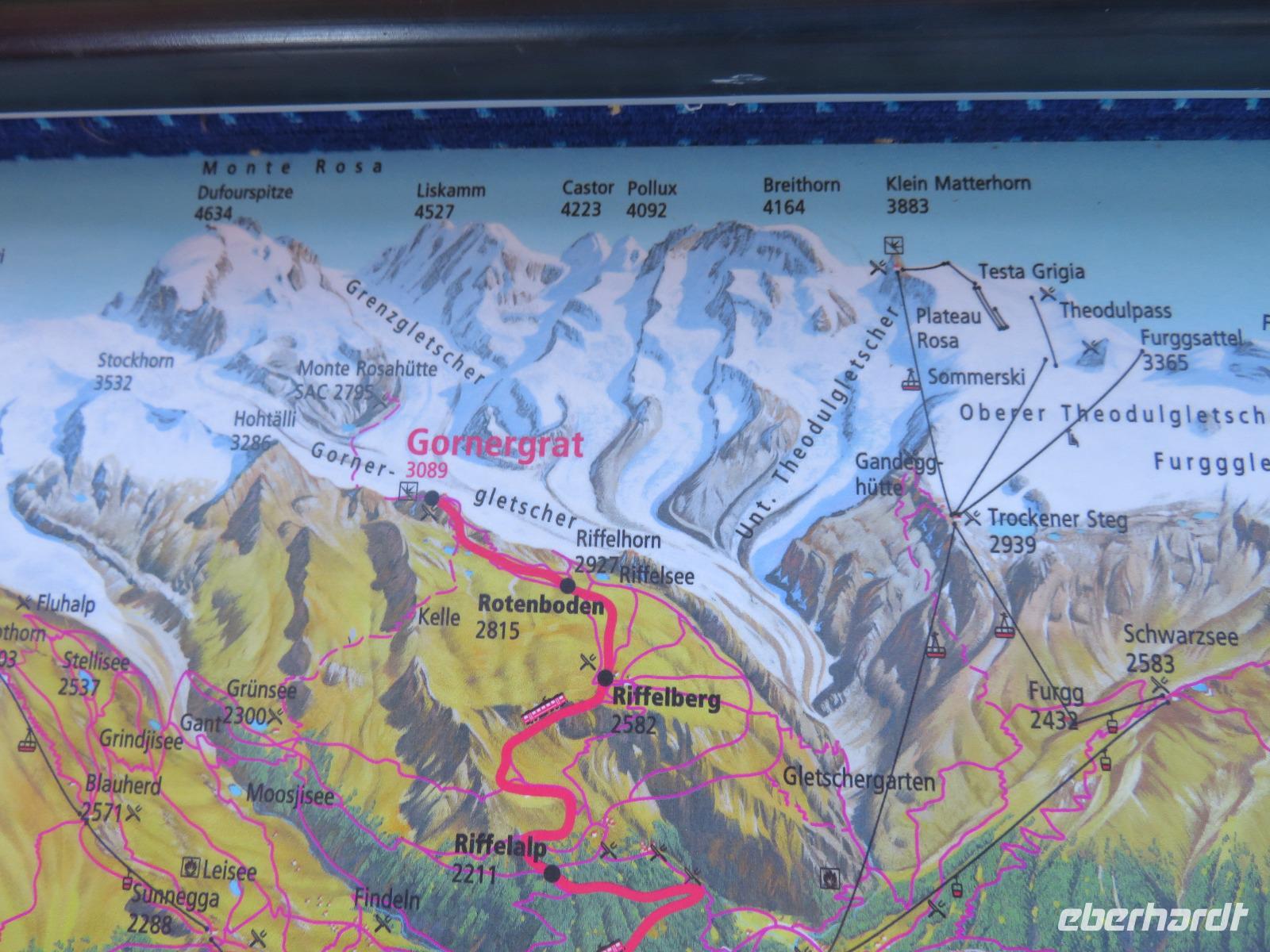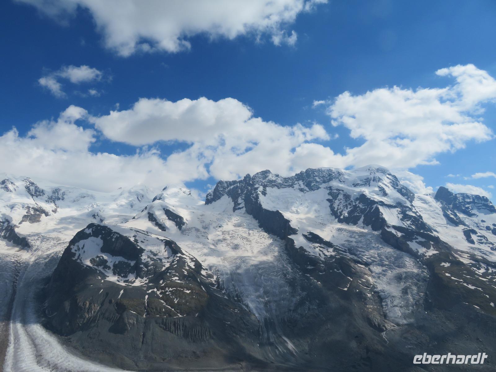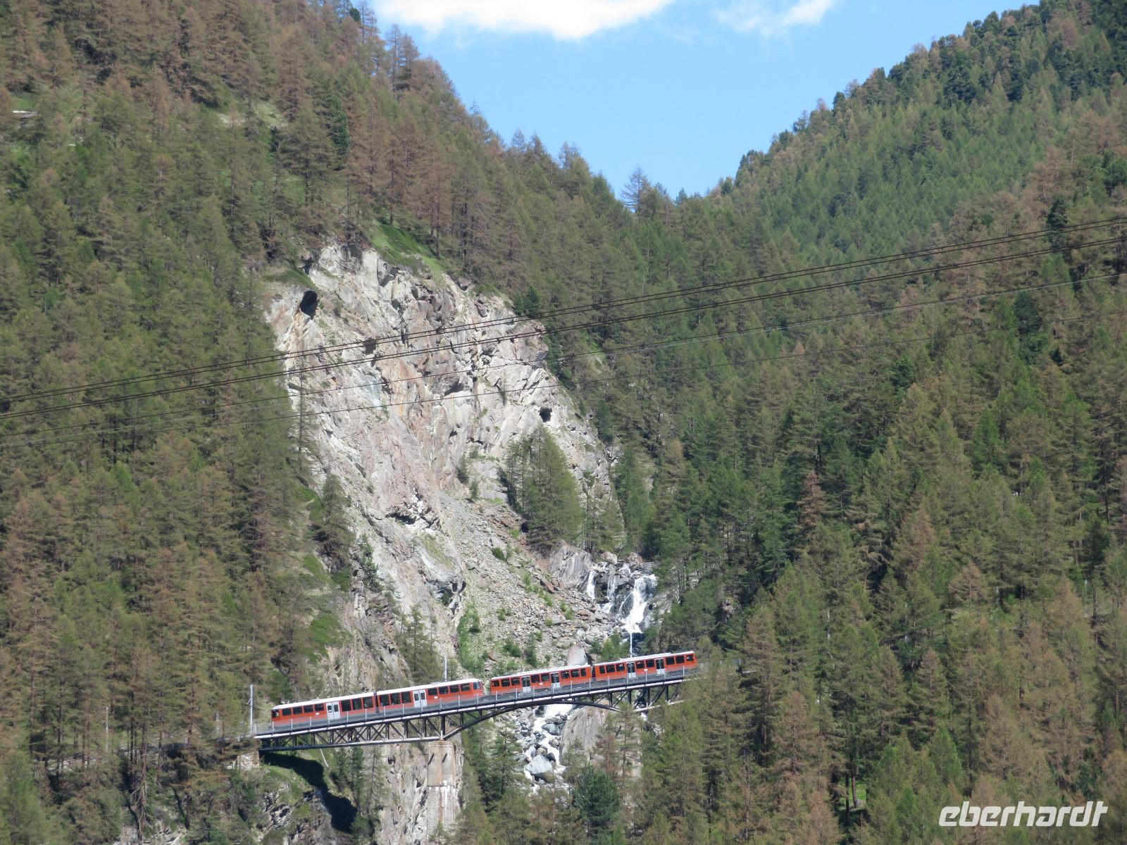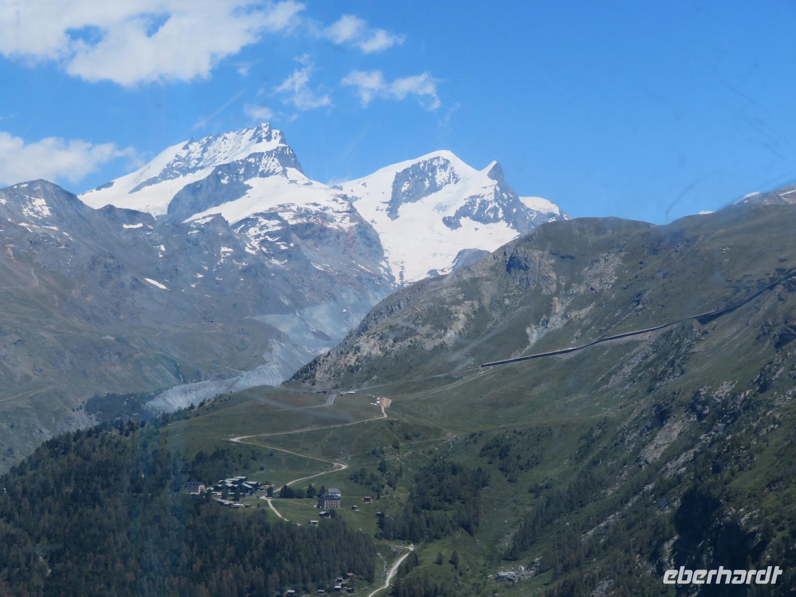 Am Morgen geniessen wir nochmals die einmalige Ruhe auf der Riederalp. Wir lassen unsere Blicke bei herrlichstem Sonnenschein wieder über das Panorama der Walliser Alpen schweifen. Heute heißt es Abschied nehmen von der Alp. Wir fahren mit der Seilbahn hinab ins Rhônetal. Ingo, unser Chauffeur hatten bereits das Gepäck verstaut und so starten wir in Richtung Brig, dem Hauptort im Oberwallis und wichtigem Verkehrsknotenpunkt. Das imposante Stockalperschloss prägt die Stadt. Kasper Joder Stockalper war im 17. Jahrhundert der mächtige Herrscher über die Stadt und die Region. Man nannte ihn auch „Fugger der Alpen". Sein Hauptgeschäft war der Handel mit allem was sich kaufen und verkaufen ließ. Er baute den Seidenhandel über den Simplonpass und den Salzhandel aus. Die Säumerpfade - frühere Handelspfade -wurden auf Weisung Stockalpers ausgebaut. Mit dem Stockalperschloss erschuf sich der Fugger und der Stadt ein Denkmal. Die drei Zwiebeltürme, sind benannt nach den heiligen drei Königen Kaspar, Melchior und Balthasar. Sie sind weithin zu sehen. Wir spazieren durch die Altstadt. Unsere Reise führt uns nun nach Raron. Hier befindet sich hoch auf einem Felsen die Burgkirche aus dem 16. Jahrhundert. An der Südwand der Kirche fand der bekannte deutsche Dichter Rainer Maria Rilke seine letzte Ruhe. Er lebte und arbeitete viele Jahre im Wallis und wollte hier auch seine letzte Ruhe finden. Unterhalb der Kirche entstand 1974 eine Felsenkirche . Dieser statten wir einen Besuch ab. Anschließend fahren wir durch das Mattertal nach Täsch. Unser Gepäck wird wieder in Container umgeladen und mit dem Zug erreichen wir den berühmten Ferienort Zermatt am Fuße des Matterhorns. Nur eine kleine Wolke liegt noch vor dem Berg der Berge. Wir bummeln zum Hotel Perren und beziehen unsere gemütlichen Zimmer. Da das Wetter so traumhaft ist, entschließen wir uns noch auf den Gornergrat zu fahren. Mit der Zahnradbahn geht es auf 3.089 Meter. Dabei zeigt sich uns das Matterhorn von seiner schönsten Seite. Wir sehen die Monte Rosa Gruppe mit Castor und Pollux, das Breithorn und das Kleine Matterhorn. Tief unter uns befindet sich der Gornergletscher und wir erkennen die Monte Rosa Hütte. Wir sind fasziniert von der herrlichen Bergwelt. Nur schwer können wir uns losreißen. Mit der Zahnradbahn geht es wieder nach Zermatt zurück. Den Tag beenden wir mit einem ausgezeichneten Abendessen.