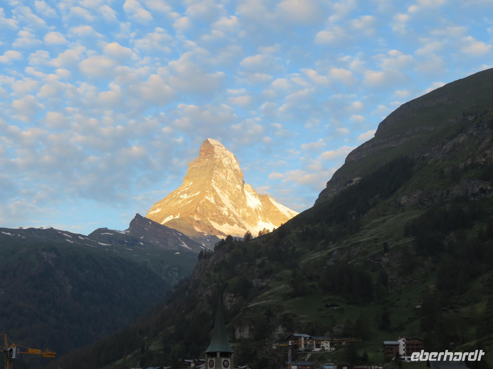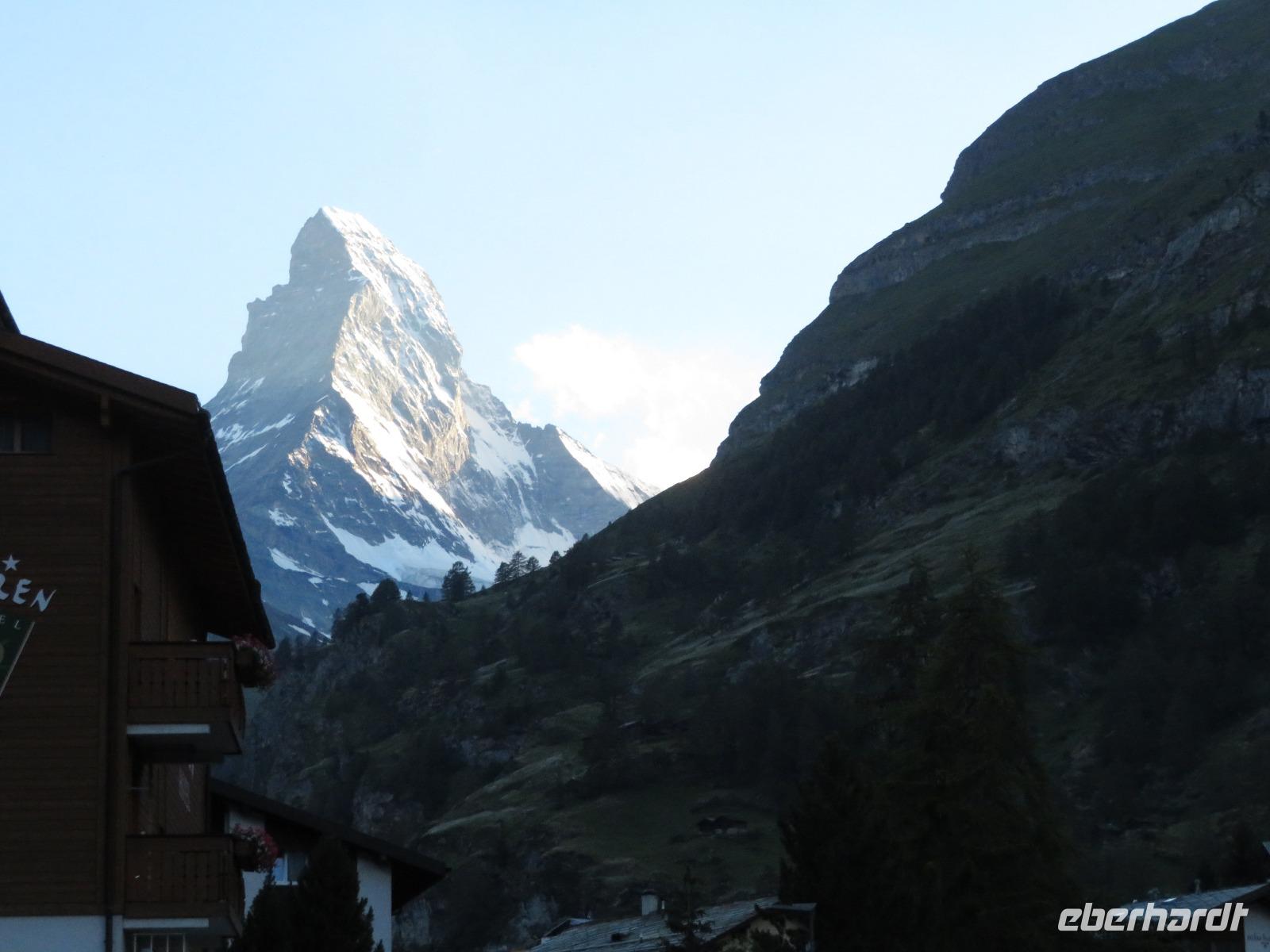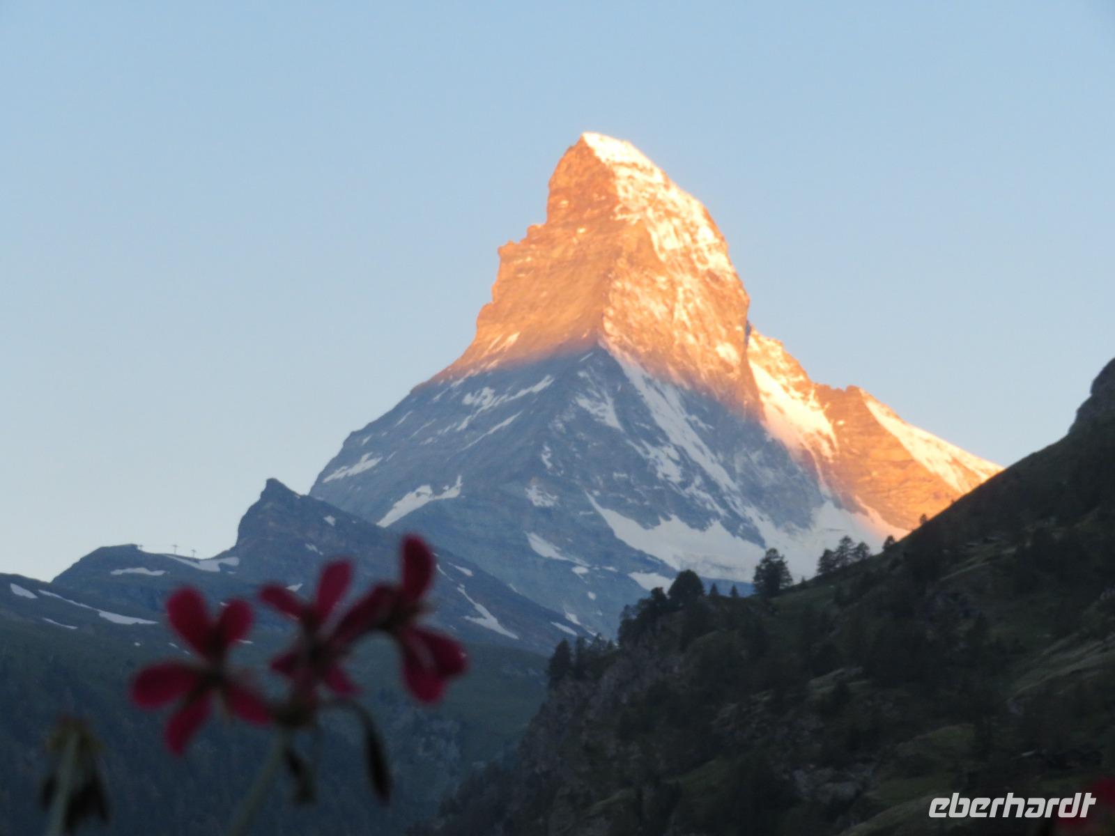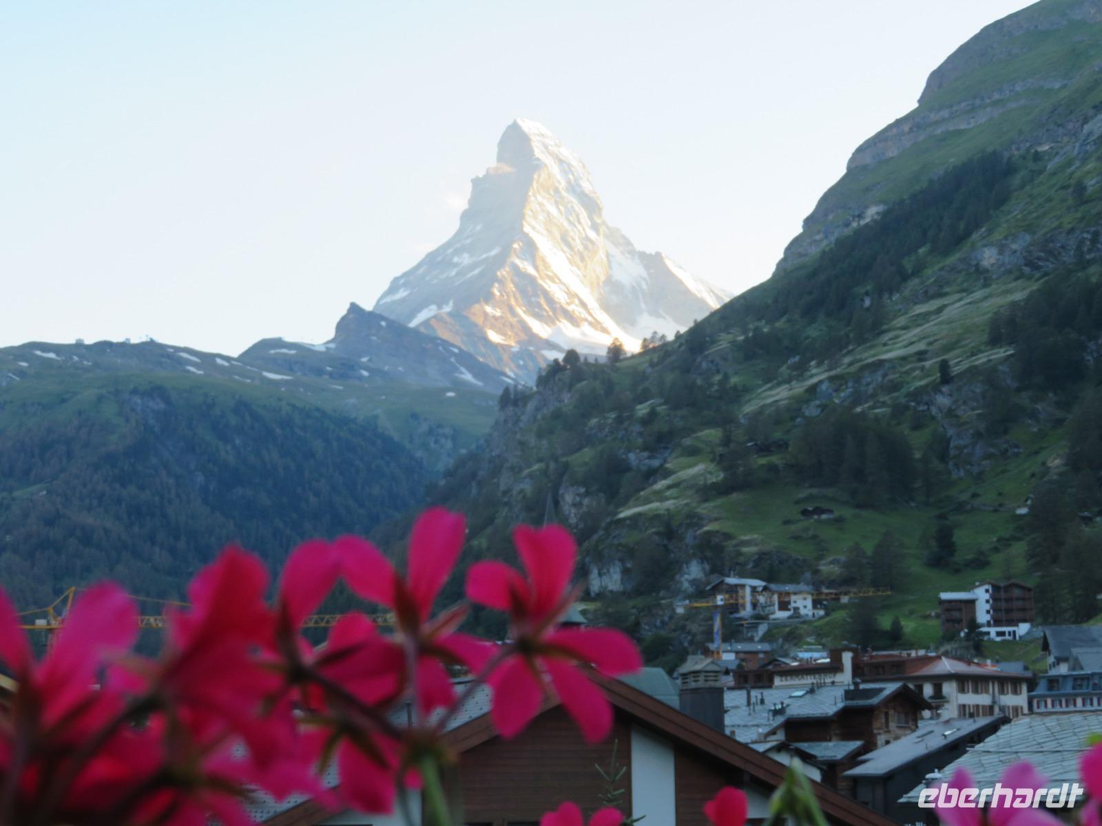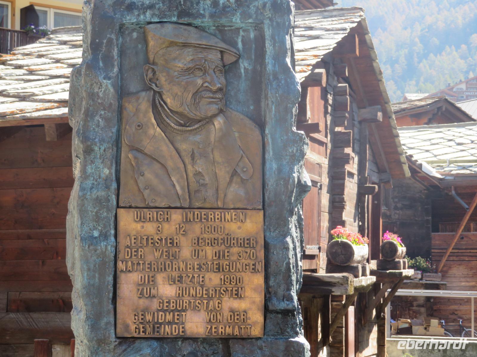 Am Morgen zeigt sich uns das Matterhorn in voller Pracht. Mit guter Laune starten wir in den Tag. Nach dem Frühstück spazieren wir gemeinsam durch Zermatt. Wir besuchen die Englische Kirche. Ich zeige meinen Gästen das alte Zermatt mit den dunklen wettergegerbten Holzhäusern und Spychern., welche teilweise über 500 Jahre alt sind. Wir sehen den Brunnen, der zu Ehren von Ullrich Inderbinen errichtet wurde. Er war der älteste Bergführer der Welt. Im Alter von 104 Jahren verstarb 2004 er. Das Matterhorn bestieg er ca. 370 Mal und letztmalig zu seinem neunzigsten Geburtstag im Jahr 1990. Wir sehen den Bergsteigerfriedhof und gehen auf den Kirchplatz. Natürlich streicheln wir die Murmeltiere am Murmeltierbrunnen. Die Legende besagt, wenn man die Murmeltiere streichelt , kehrt man immer wieder nach Zermatt zurück. Bei mir funktioniert es jedenfalls immer wieder. Die Geschichte Zermatts ist untrennbar mit dem Matterhorn und seiner Erstbesteigung im Jahre 1865 verknüpft. Immer wieder entdecken wir Spuren dieser Bergbesteigung, ob in der Englischen Kirche, auf dem Friedhof oder am heutigen Hotel Monte Rosa. Nach unserem kleinen Rundgang erkunden wir noch ganz individuell den berühmten Bergsteiger- und Ferienort.