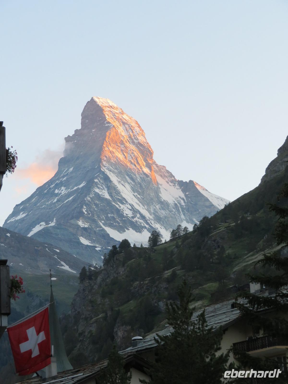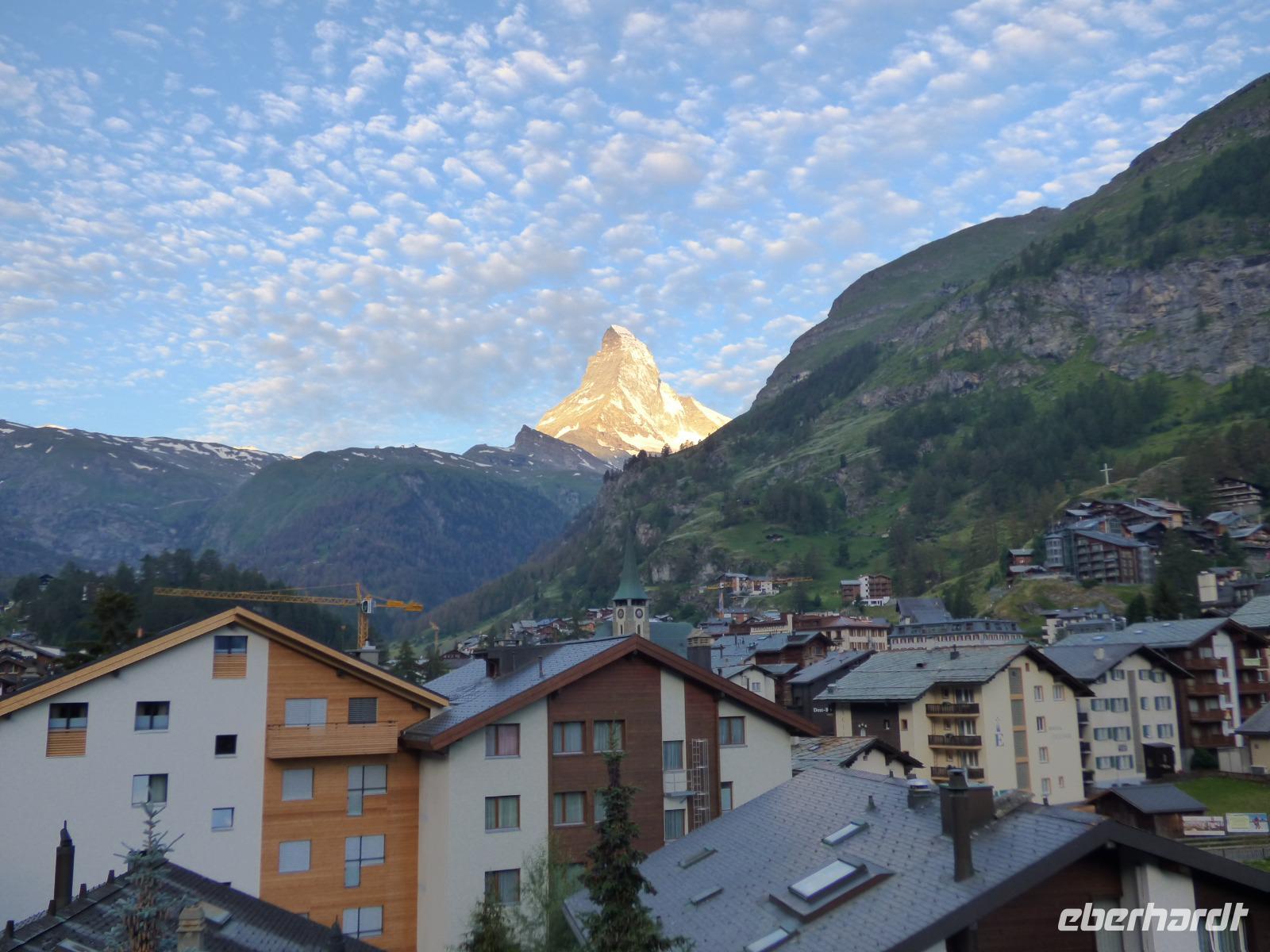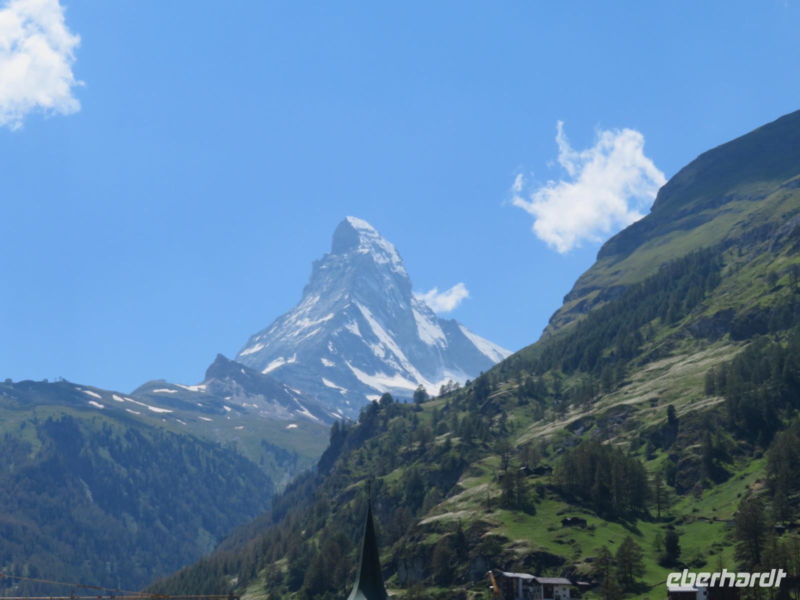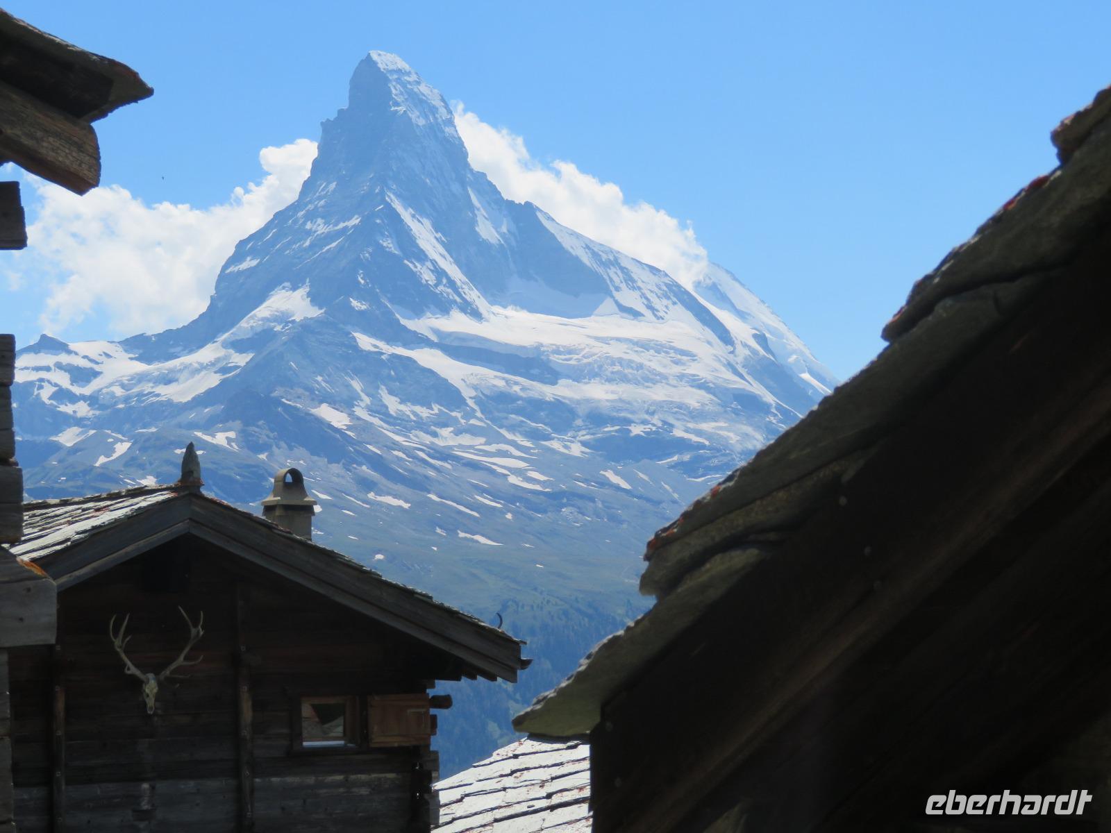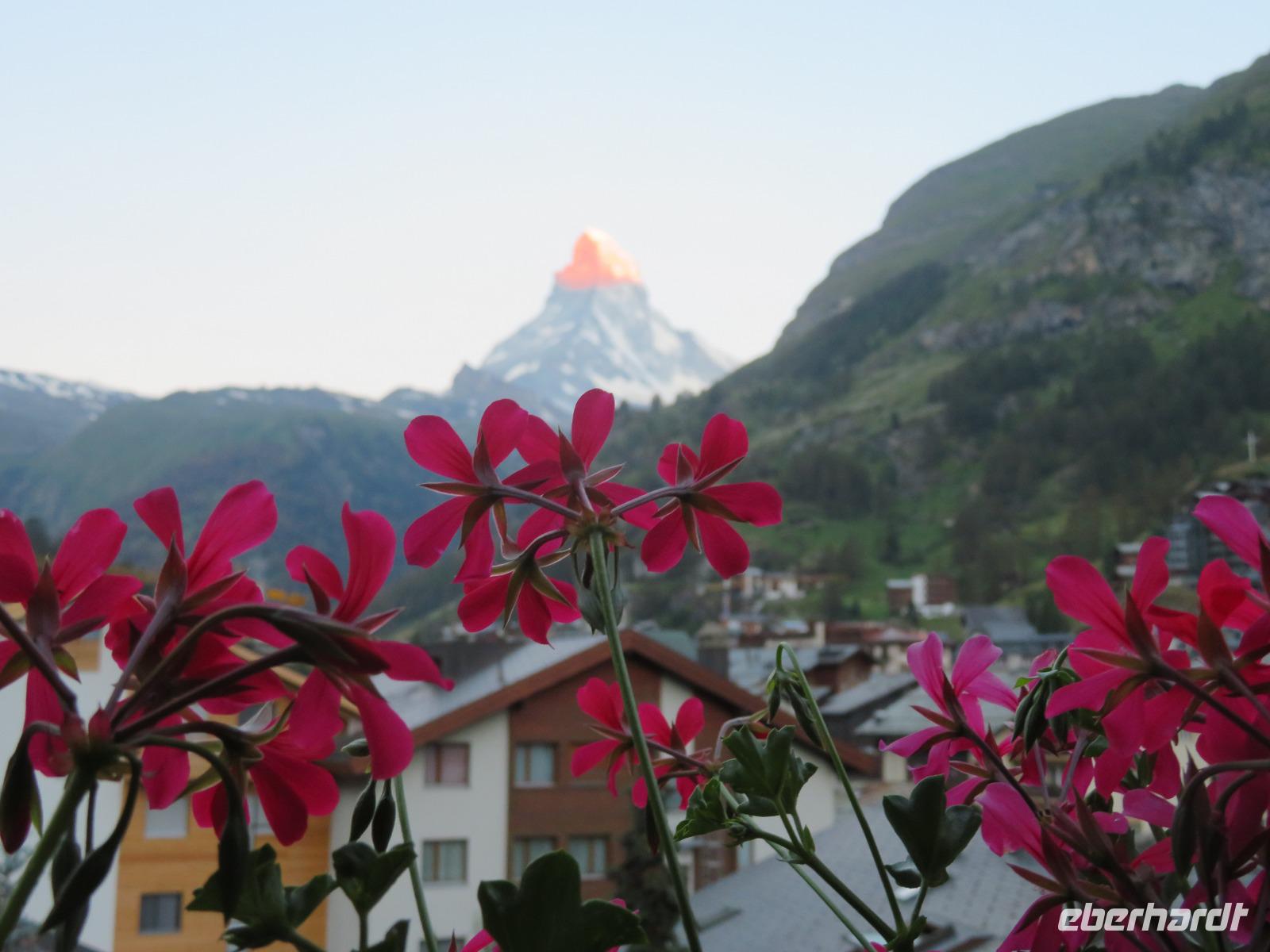 Am Morgen zeigt sich uns das Matterhorn in voller Pracht. Mit guter Laune starten wir in den Tag. Nach dem Frühstück spazieren wir gemeinsam durch Zermatt. Wir besuchen die Englische Kirche. Ich zeige meinen Gästen das alte Zermatt mit den dunklen wettergegerbten Holzhäusern und Spychern., welche teilweise über 500 Jahre alt sind. Wir sehen den Brunnen, der zu Ehren von Ullrich Inderbinen errichtet wurde. Er war der älteste Bergführer der Welt. Im Alter von 104 Jahren verstarb 2004 er. Das Matterhorn bestieg er ca. 370 Mal und letztmalig zu seinem neunzigsten Geburtstag im Jahr 1990. Wir sehen den Bergsteigerfriedhof und gehen auf den Kirchplatz. Natürlich streicheln wir die Murmeltiere am Murmeltierbrunnen. Die Legende besagt, wenn man die Murmeltiere streichelt , kehrt man immer wieder nach Zermatt zurück. Bei mir funktioniert es jedenfalls immer wieder. Die Geschichte Zermatts ist untrennbar mit dem Matterhorn und seiner Erstbesteigung im Jahre 1865 verknüpft. Immer wieder entdecken wir Spuren dieser Bergbesteigung, ob in der Englischen Kirche, auf dem Friedhof oder am heutigen Hotel Monte Rosa. Nach unserem kleinen Rundgang erkunden wir noch ganz individuell den berühmten Bergsteiger- und Ferienort.