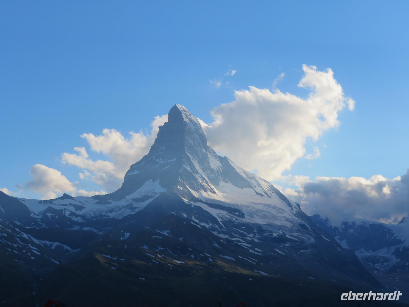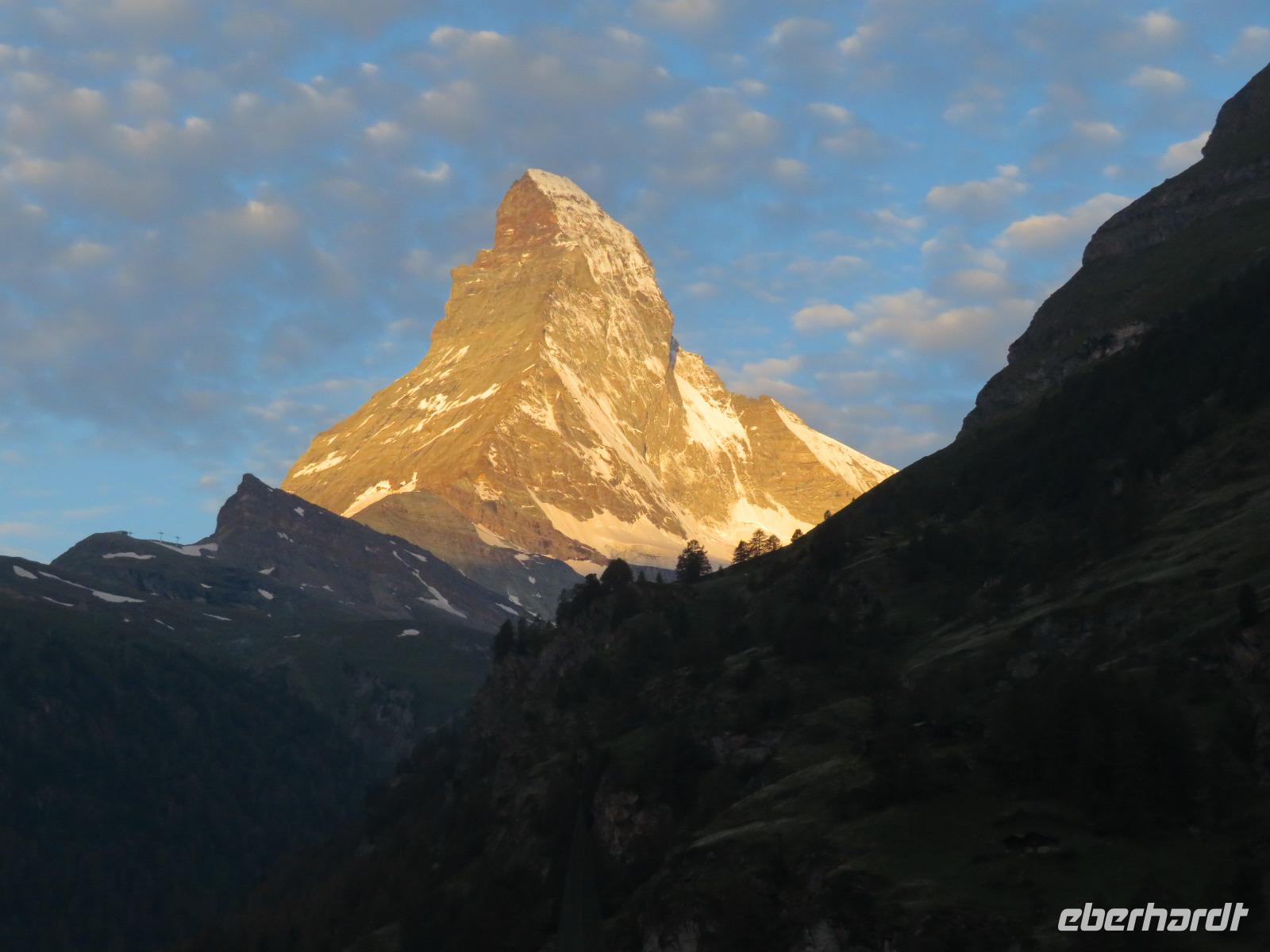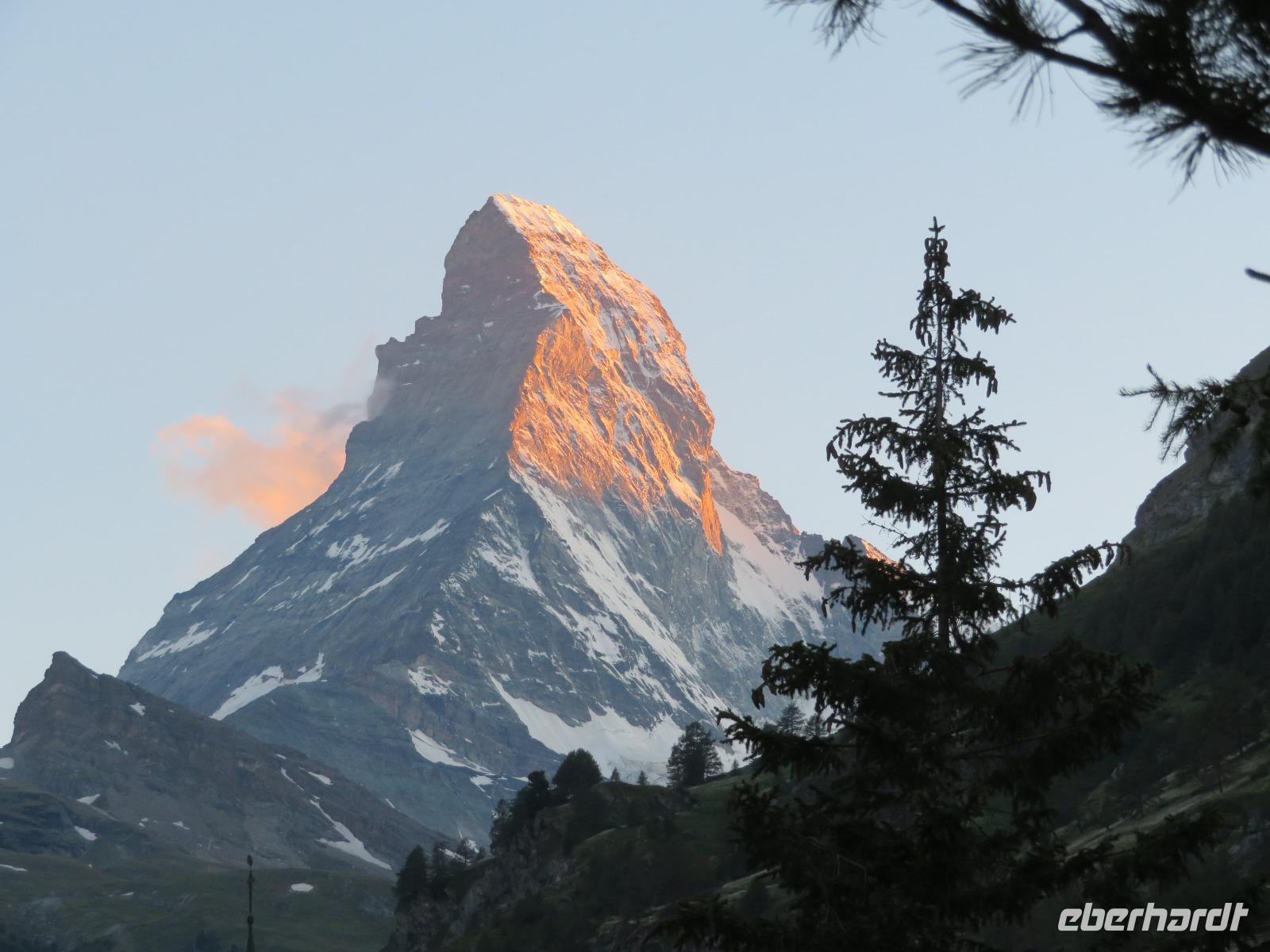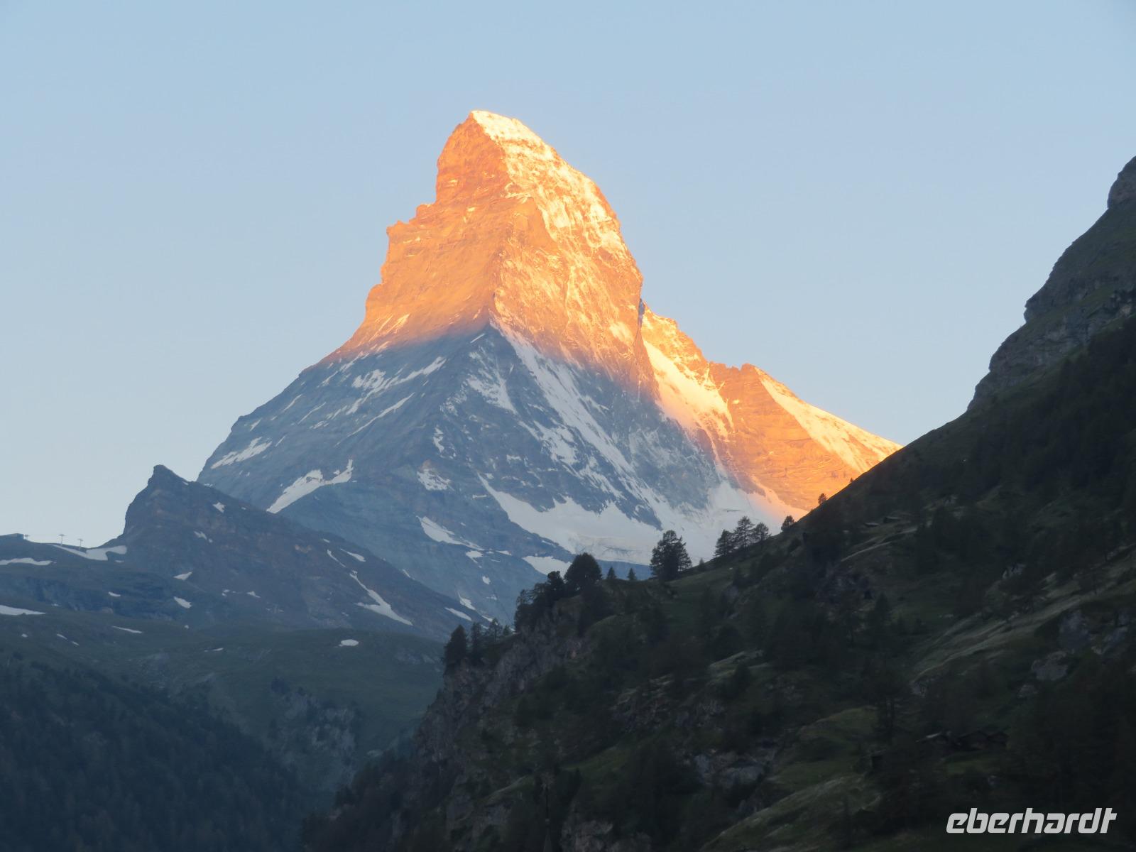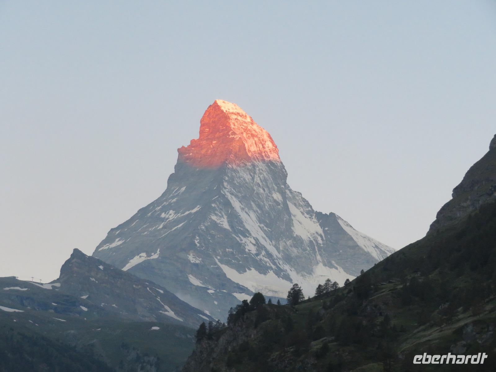 Am Morgen zeigt sich uns das Matterhorn in voller Pracht. Mit guter Laune starten wir in den Tag. Nach dem Frühstück spazieren wir gemeinsam durch Zermatt. Wir besuchen die Englische Kirche. Ich zeige meinen Gästen das alte Zermatt mit den dunklen wettergegerbten Holzhäusern und Spychern., welche teilweise über 500 Jahre alt sind. Wir sehen den Brunnen, der zu Ehren von Ullrich Inderbinen errichtet wurde. Er war der älteste Bergführer der Welt. Im Alter von 104 Jahren verstarb 2004 er. Das Matterhorn bestieg er ca. 370 Mal und letztmalig zu seinem neunzigsten Geburtstag im Jahr 1990. Wir sehen den Bergsteigerfriedhof und gehen auf den Kirchplatz. Natürlich streicheln wir die Murmeltiere am Murmeltierbrunnen. Die Legende besagt, wenn man die Murmeltiere streichelt , kehrt man immer wieder nach Zermatt zurück. Bei mir funktioniert es jedenfalls immer wieder. Die Geschichte Zermatts ist untrennbar mit dem Matterhorn und seiner Erstbesteigung im Jahre 1865 verknüpft. Immer wieder entdecken wir Spuren dieser Bergbesteigung, ob in der Englischen Kirche, auf dem Friedhof oder am heutigen Hotel Monte Rosa. Nach unserem kleinen Rundgang erkunden wir noch ganz individuell den berühmten Bergsteiger- und Ferienort.