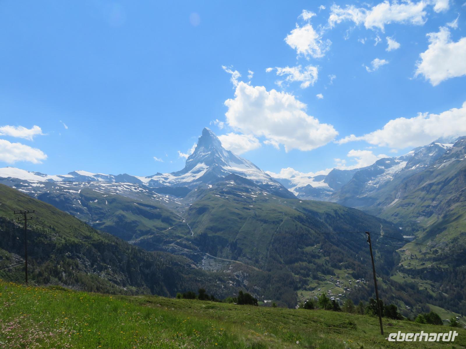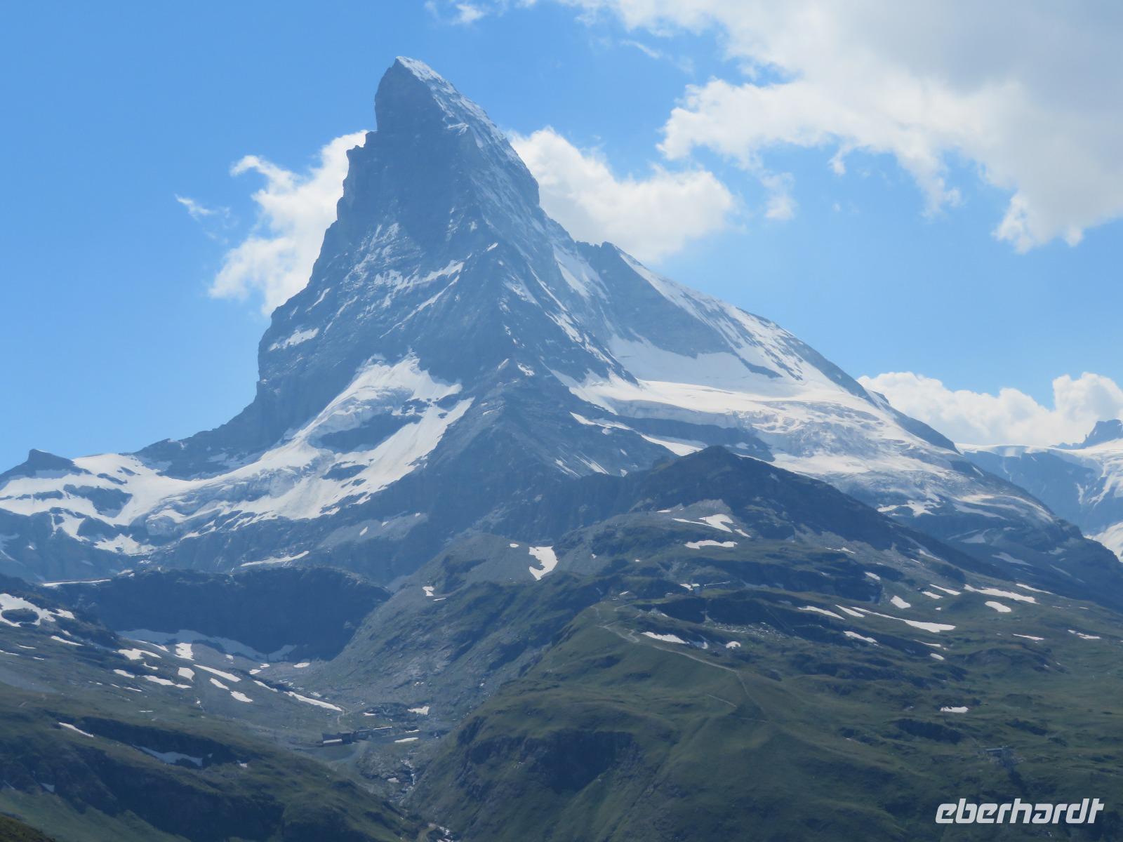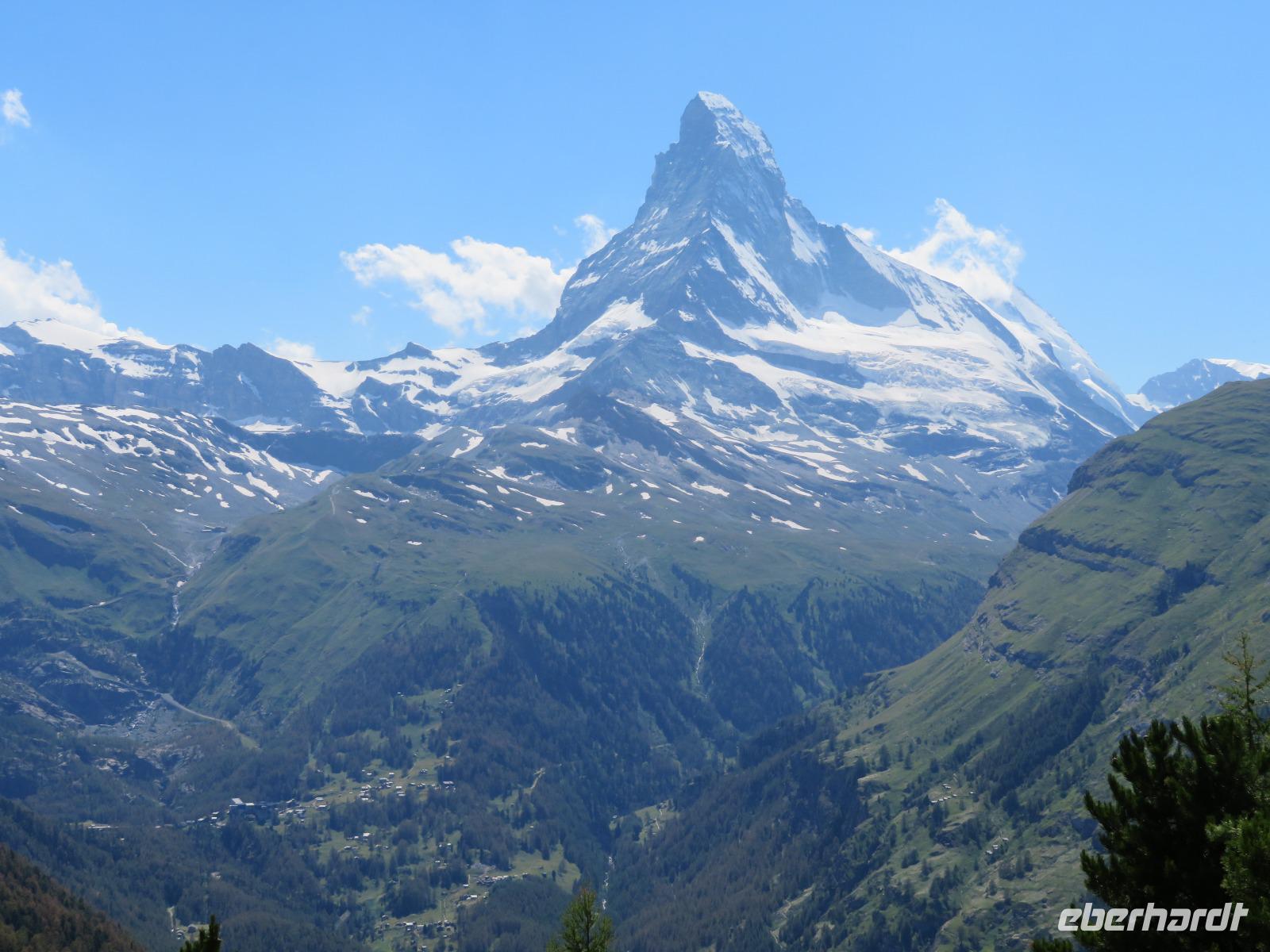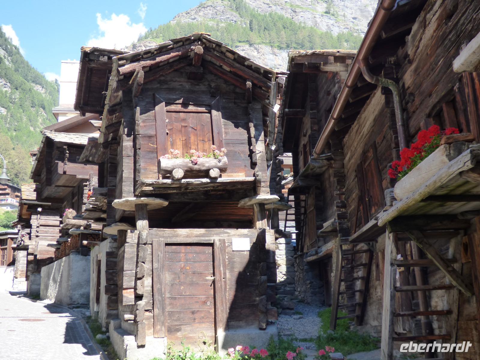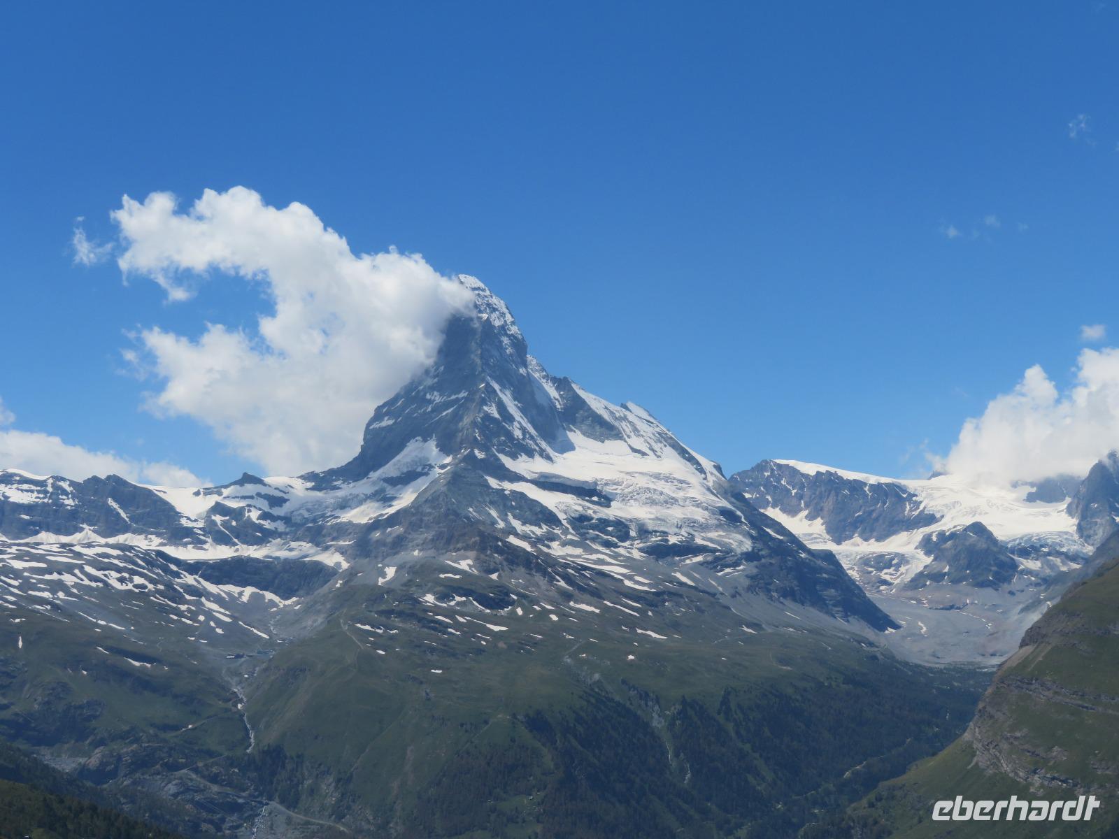 Am Morgen zeigt sich uns das Matterhorn in voller Pracht. Mit guter Laune starten wir in den Tag. Nach dem Frühstück spazieren wir gemeinsam durch Zermatt. Wir besuchen die Englische Kirche. Ich zeige meinen Gästen das alte Zermatt mit den dunklen wettergegerbten Holzhäusern und Spychern., welche teilweise über 500 Jahre alt sind. Wir sehen den Brunnen, der zu Ehren von Ullrich Inderbinen errichtet wurde. Er war der älteste Bergführer der Welt. Im Alter von 104 Jahren verstarb 2004 er. Das Matterhorn bestieg er ca. 370 Mal und letztmalig zu seinem neunzigsten Geburtstag im Jahr 1990. Wir sehen den Bergsteigerfriedhof und gehen auf den Kirchplatz. Natürlich streicheln wir die Murmeltiere am Murmeltierbrunnen. Die Legende besagt, wenn man die Murmeltiere streichelt , kehrt man immer wieder nach Zermatt zurück. Bei mir funktioniert es jedenfalls immer wieder. Die Geschichte Zermatts ist untrennbar mit dem Matterhorn und seiner Erstbesteigung im Jahre 1865 verknüpft. Immer wieder entdecken wir Spuren dieser Bergbesteigung, ob in der Englischen Kirche, auf dem Friedhof oder am heutigen Hotel Monte Rosa. Nach unserem kleinen Rundgang erkunden wir noch ganz individuell den berühmten Bergsteiger- und Ferienort.