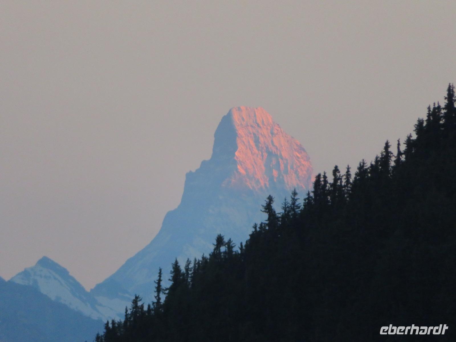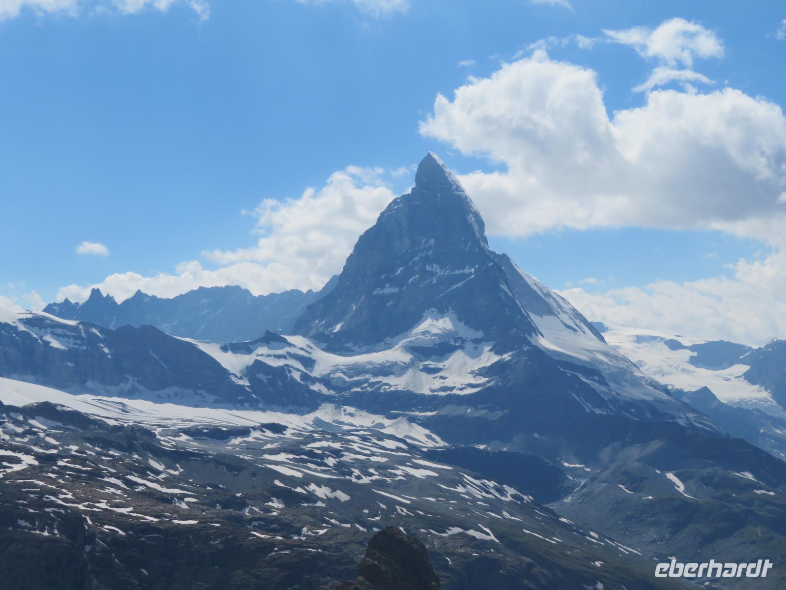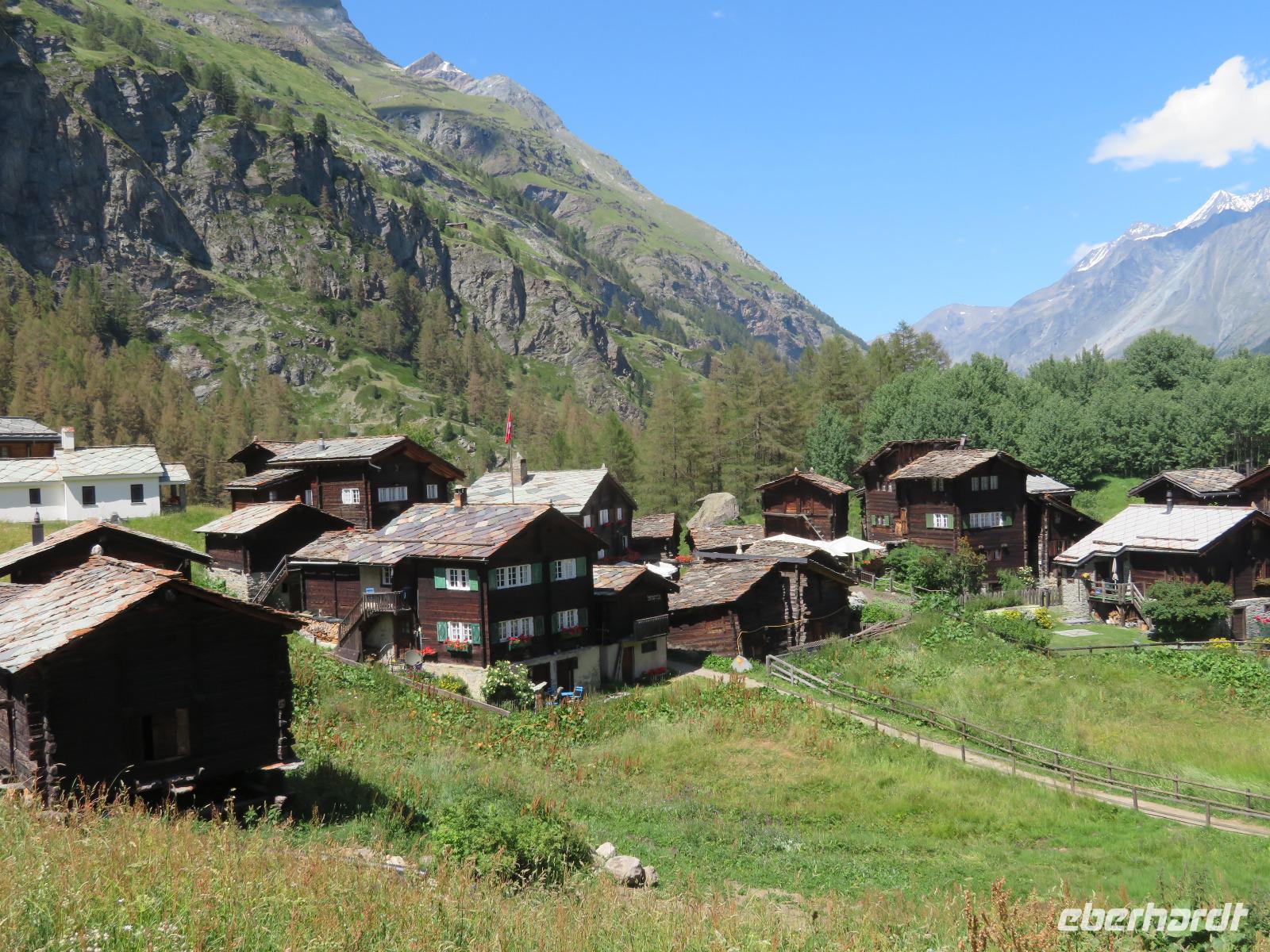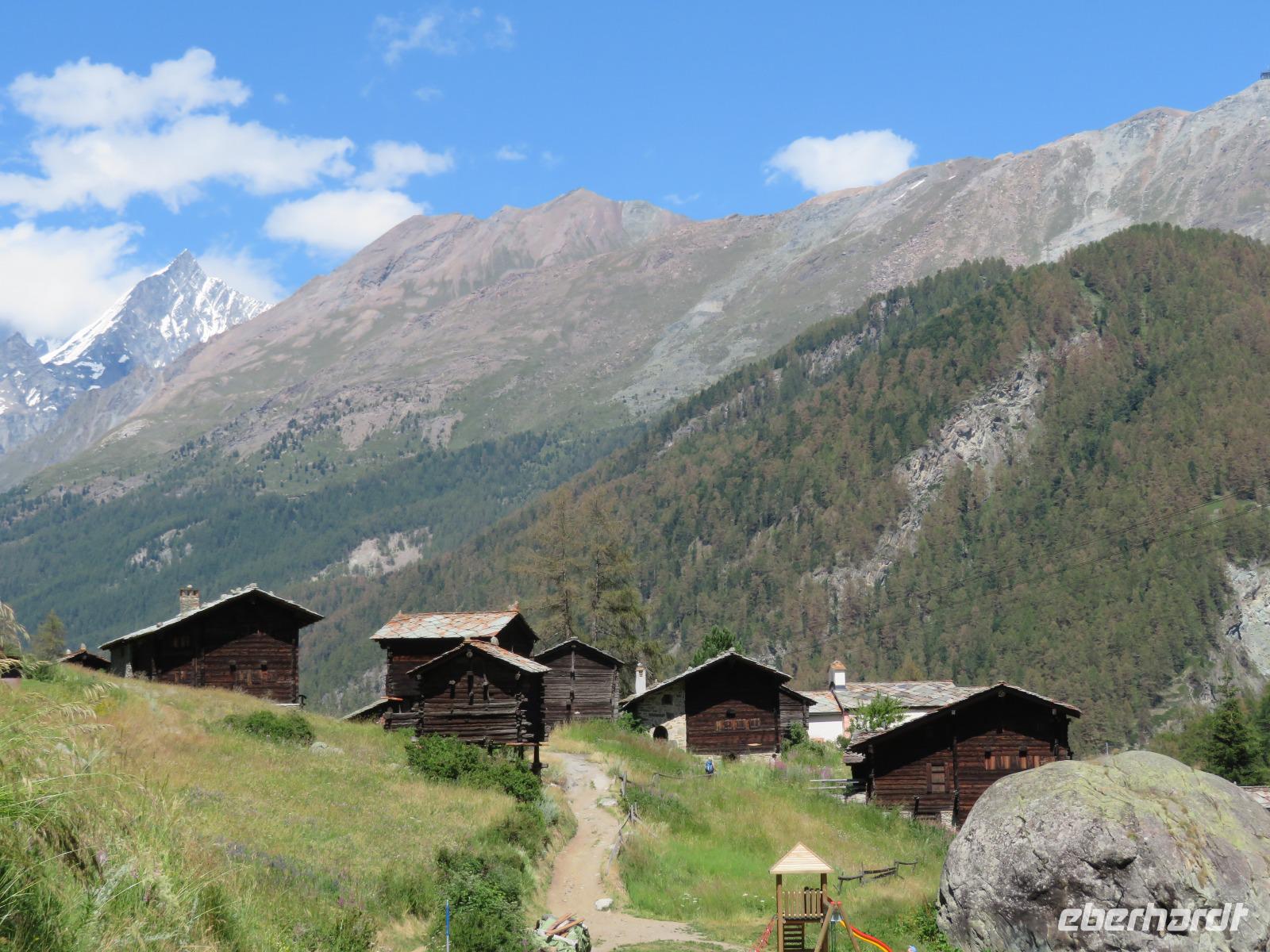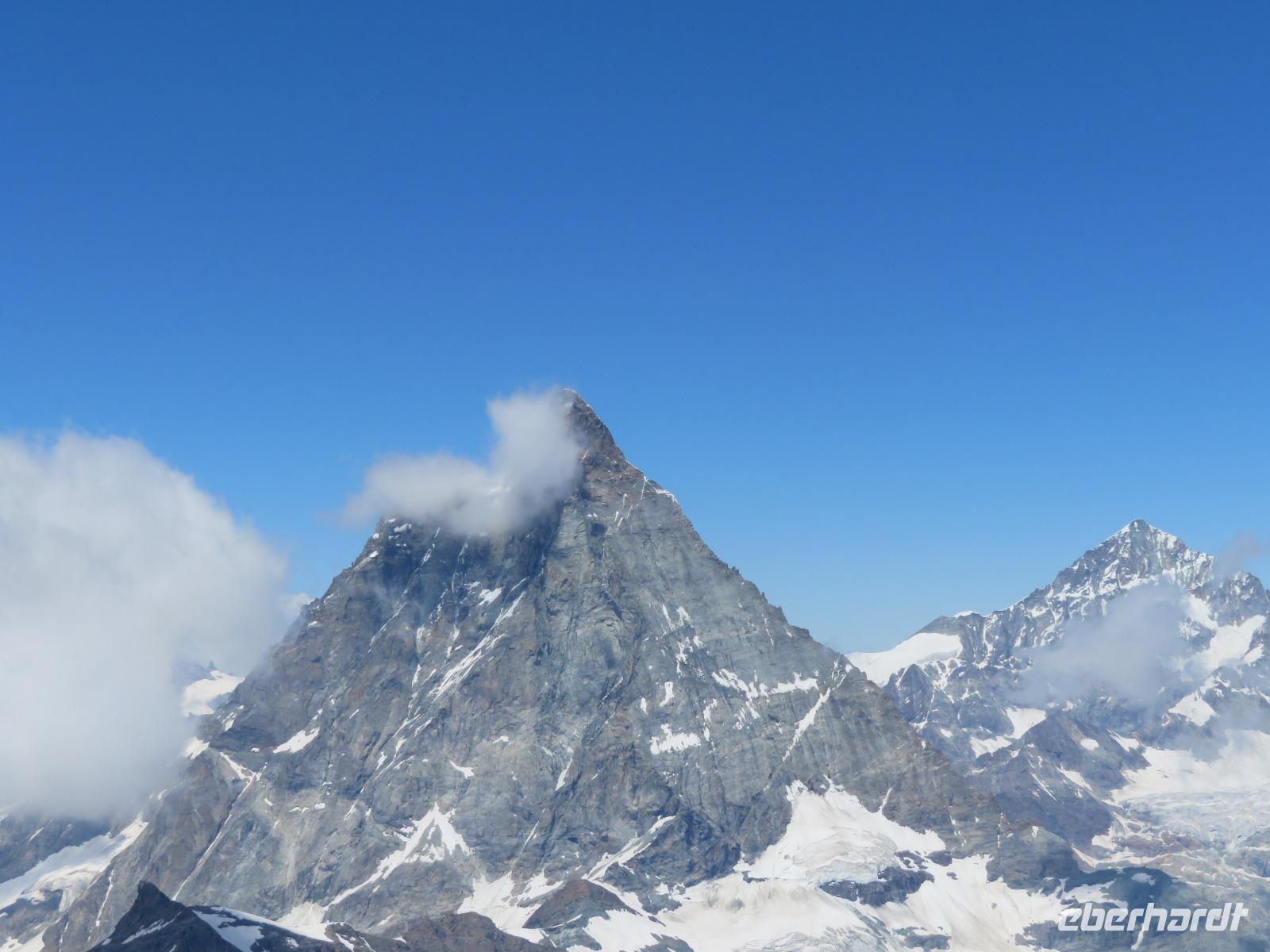 Am Morgen zeigt sich uns das Matterhorn in voller Pracht. Mit guter Laune starten wir in den Tag. Nach dem Frühstück spazieren wir gemeinsam durch Zermatt. Wir besuchen die Englische Kirche. Ich zeige meinen Gästen das alte Zermatt mit den dunklen wettergegerbten Holzhäusern und Spychern., welche teilweise über 500 Jahre alt sind. Wir sehen den Brunnen, der zu Ehren von Ullrich Inderbinen errichtet wurde. Er war der älteste Bergführer der Welt. Im Alter von 104 Jahren verstarb 2004 er. Das Matterhorn bestieg er ca. 370 Mal und letztmalig zu seinem neunzigsten Geburtstag im Jahr 1990. Wir sehen den Bergsteigerfriedhof und gehen auf den Kirchplatz. Natürlich streicheln wir die Murmeltiere am Murmeltierbrunnen. Die Legende besagt, wenn man die Murmeltiere streichelt , kehrt man immer wieder nach Zermatt zurück. Bei mir funktioniert es jedenfalls immer wieder. Die Geschichte Zermatts ist untrennbar mit dem Matterhorn und seiner Erstbesteigung im Jahre 1865 verknüpft. Immer wieder entdecken wir Spuren dieser Bergbesteigung, ob in der Englischen Kirche, auf dem Friedhof oder am heutigen Hotel Monte Rosa. Nach unserem kleinen Rundgang erkunden wir noch ganz individuell den berühmten Bergsteiger- und Ferienort.