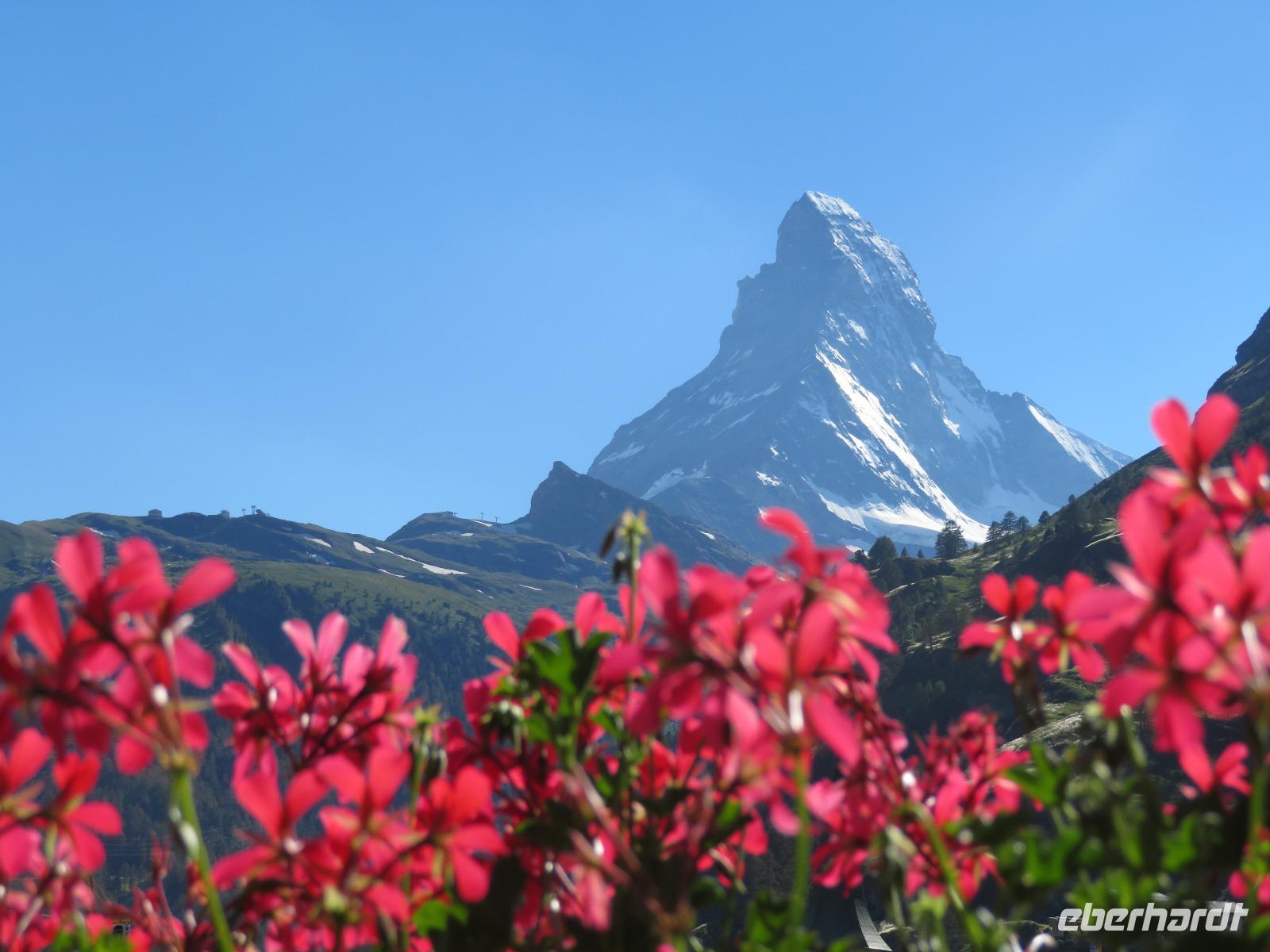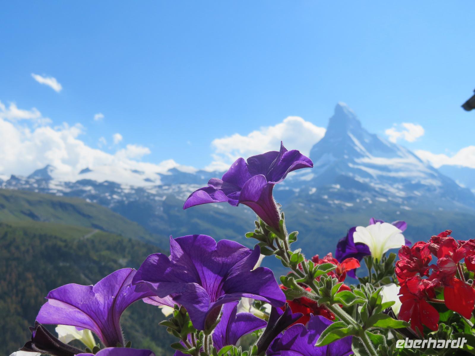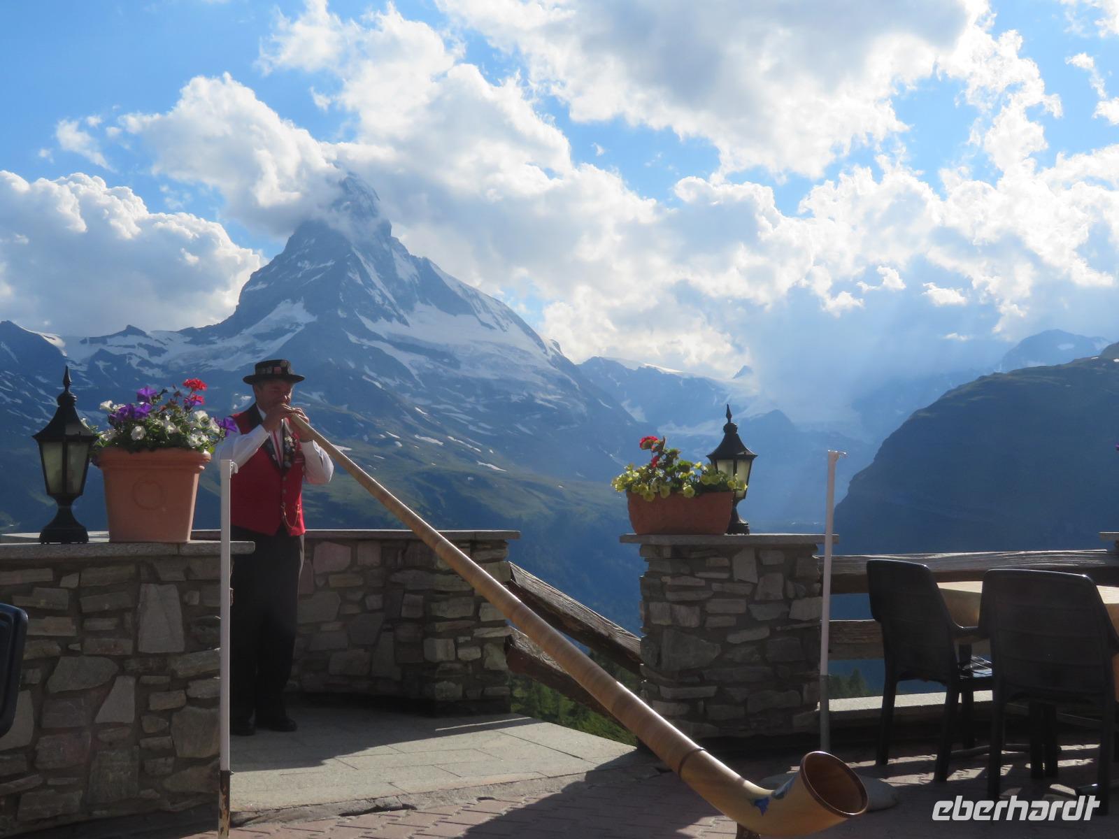 Am Mittag treffen wir uns und spazieren zur Talstation der Rothornbahn. Zunächst bringt uns die unterirdische Standseilbahn auf 2.288 Meter Höhe auf die Zwischenstation Sunnegga. Anschließend besteigen wir die Gondelbahn mit der wir die Station Blauherd in 2.571 Metern Höhe erreichen. Wir genießen die Aussicht zum Matterhorn, zur Monte Rosa Gruppe und den anderen Viertausendern. Mit den meisten Gästen wandern wir auf dem Blumenweg nach Sunnegga. Der Weg führt uns durch herrliche Wiesen und bietet uns immer wieder tolle Blicke auf das Matterhorn und die umliegenden Berge. Auf dem Weg sind Tafeln aufgestellt, auf denen die Alpenpflanzen erklärt werden. Wir entdecken unter anderem Bergsteinbrecht, Feldthymian, Arnika, Schnee-Enzian und viele weitere interessante Pflanzen. Unterwegs legen wir im kleinen Weiler Tufteren noch eine Rast ein und stärken uns mit Apelkuchen und Kaffee. Ingo unser Chauffeur, kommt mit den Gästen die nicht so viel wandern möchten, etwas später auf Sunnegga und wandert nach Tufteren. Dort treffen wir uns. Nun geht es über den Fahrweg nach Sunnegga. Hier erwartet uns immer noch eine tolle Aussicht auf der Aussichtsterrasse. Anschließend erleben wir einen wunderschönen Abend bei Raclette und Folkloremusik. Ein Gänsehautmoment ist für uns alle der Auftritt des Alphornspileres auf der Terrasse vor dem Panorama des Matterhorns und der anderen Berge. Mit der Standseilbahn kehren wir nach Zermatt zurück. Der perfekte Tag geht für uns zu Ende!