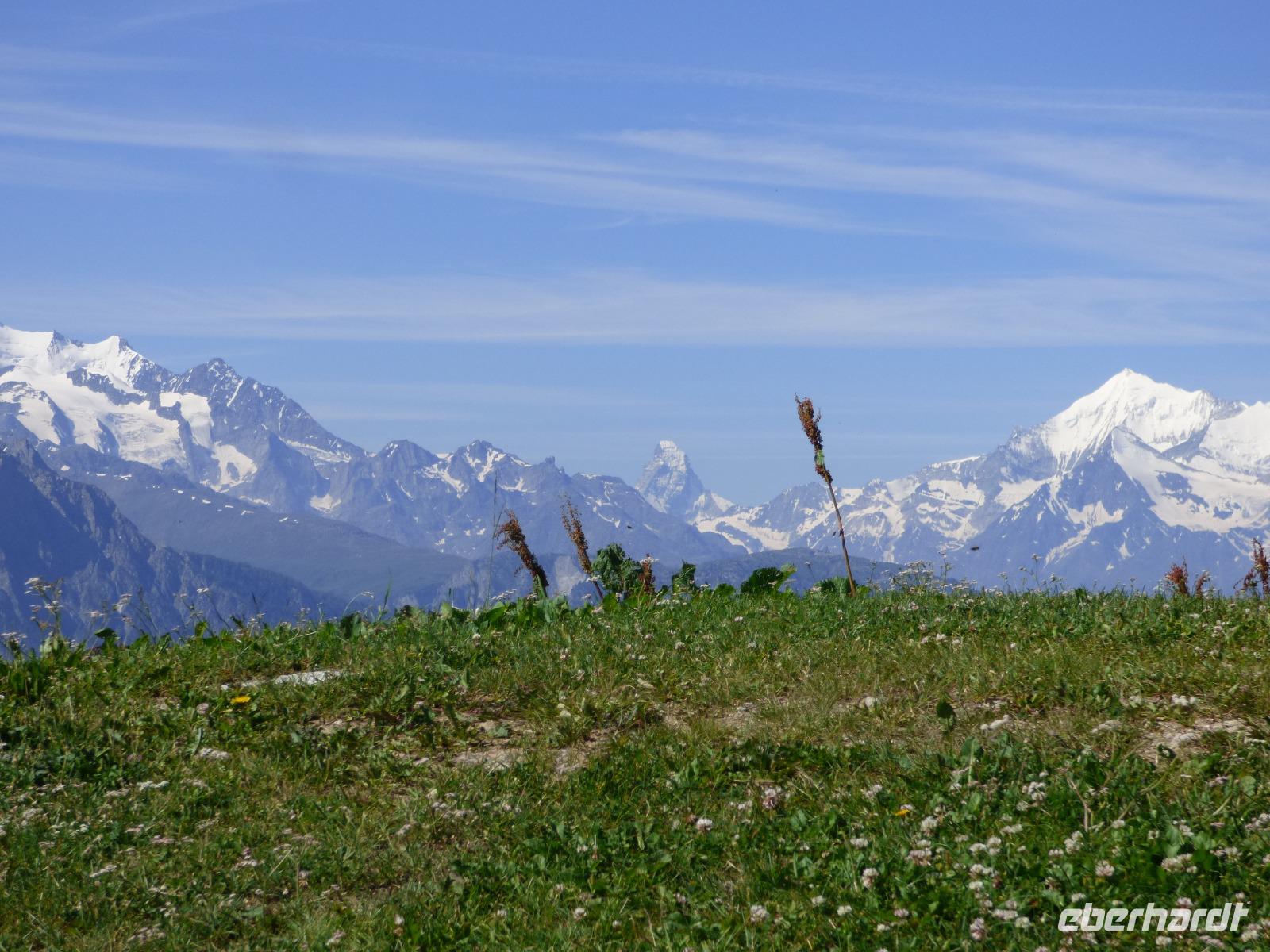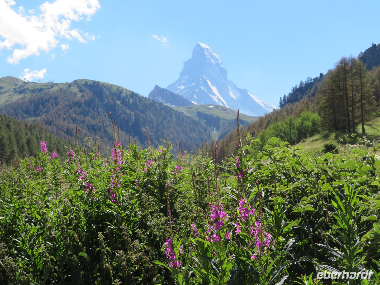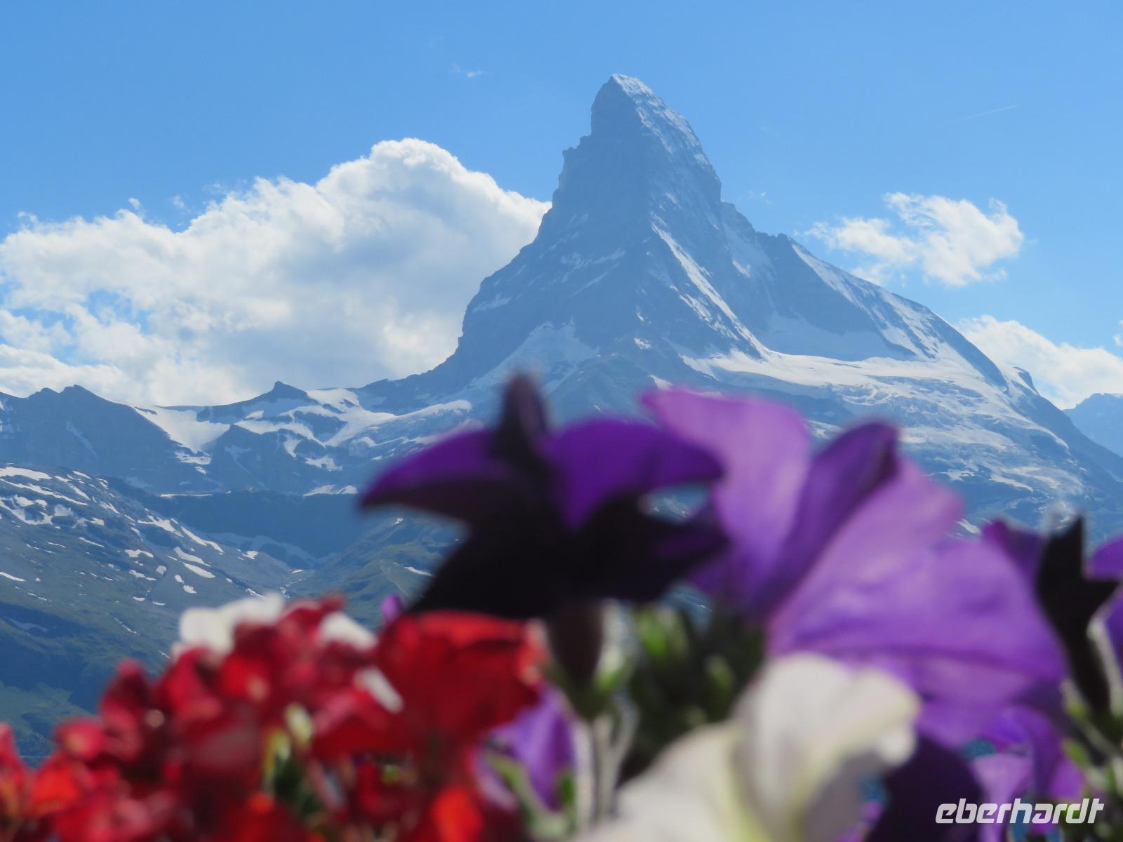 Am Mittag treffen wir uns und spazieren zur Talstation der Rothornbahn. Zunächst bringt uns die unterirdische Standseilbahn auf 2.288 Meter Höhe auf die Zwischenstation Sunnegga. Anschließend besteigen wir die Gondelbahn mit der wir die Station Blauherd in 2.571 Metern Höhe erreichen. Wir genießen die Aussicht zum Matterhorn, zur Monte Rosa Gruppe und den anderen Viertausendern. Mit den meisten Gästen wandern wir auf dem Blumenweg nach Sunnegga. Der Weg führt uns durch herrliche Wiesen und bietet uns immer wieder tolle Blicke auf das Matterhorn und die umliegenden Berge. Auf dem Weg sind Tafeln aufgestellt, auf denen die Alpenpflanzen erklärt werden. Wir entdecken unter anderem Bergsteinbrecht, Feldthymian, Arnika, Schnee-Enzian und viele weitere interessante Pflanzen. Unterwegs legen wir im kleinen Weiler Tufteren noch eine Rast ein und stärken uns mit Apelkuchen und Kaffee. Ingo unser Chauffeur, kommt mit den Gästen die nicht so viel wandern möchten, etwas später auf Sunnegga und wandert nach Tufteren. Dort treffen wir uns. Nun geht es über den Fahrweg nach Sunnegga. Hier erwartet uns immer noch eine tolle Aussicht auf der Aussichtsterrasse. Anschließend erleben wir einen wunderschönen Abend bei Raclette und Folkloremusik. Ein Gänsehautmoment ist für uns alle der Auftritt des Alphornspileres auf der Terrasse vor dem Panorama des Matterhorns und der anderen Berge. Mit der Standseilbahn kehren wir nach Zermatt zurück. Der perfekte Tag geht für uns zu Ende!