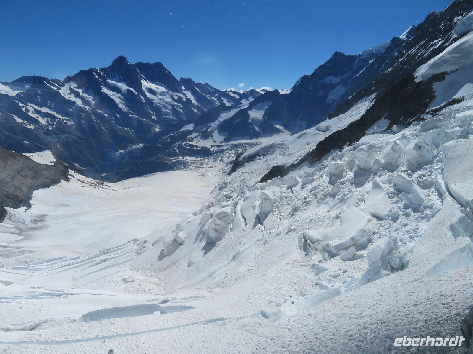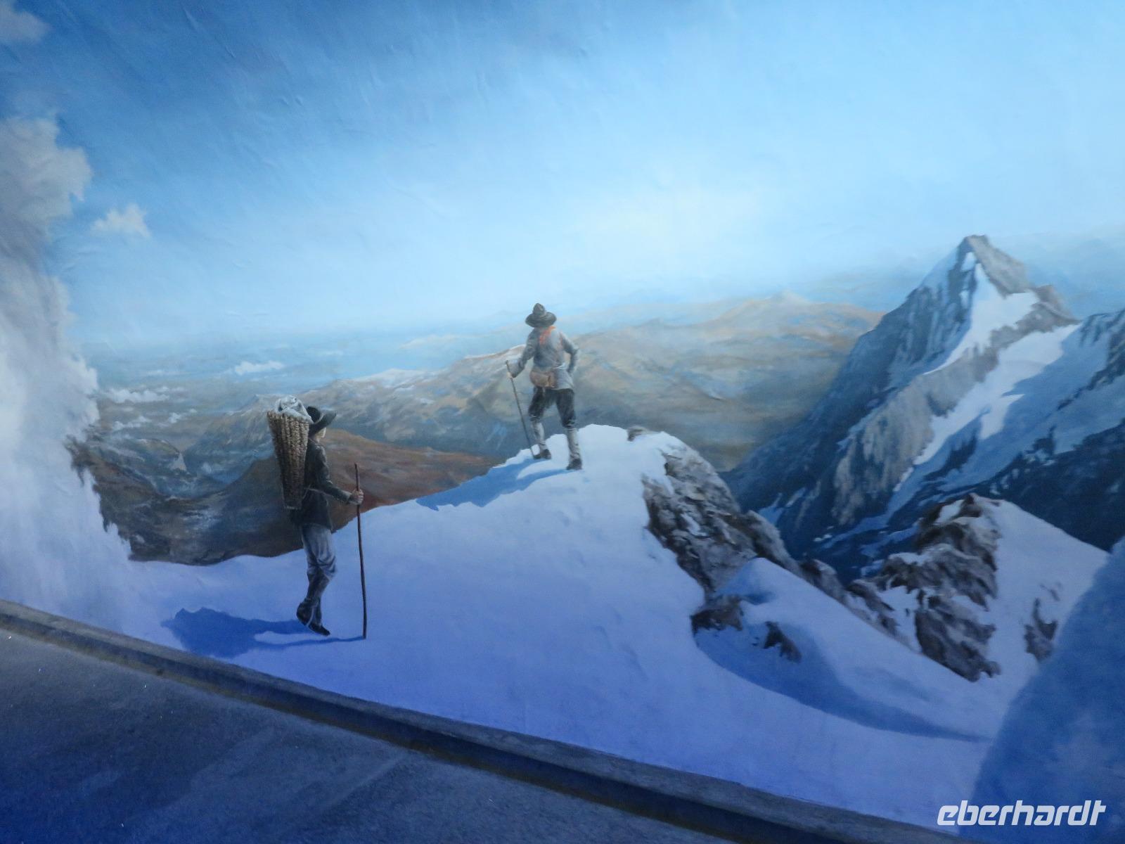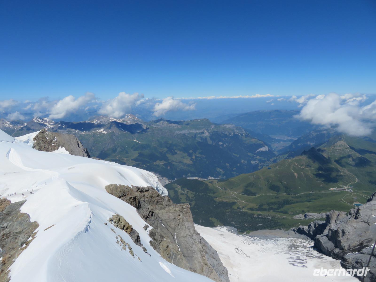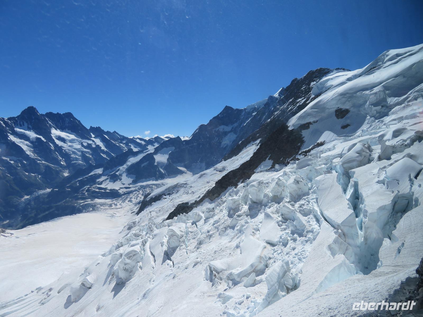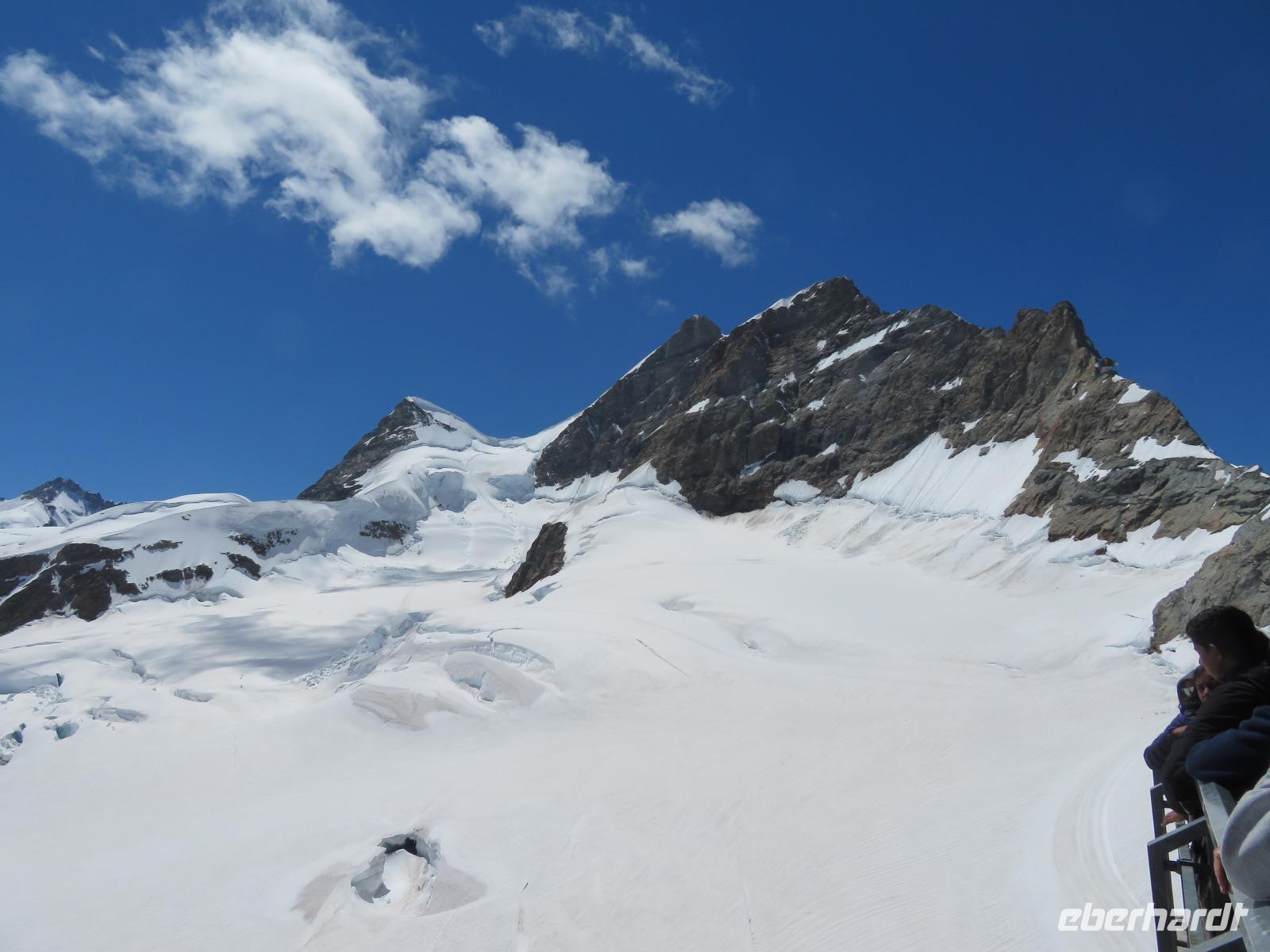 Der heutige Tag verspricht wieder Traumwetter. Mit dem Bus fahren wir zunächst nach Grindelwald-Grund. Wir besteigen die Wengeralp-Bahn zur Kleinen Scheidegg. Während der Fahrt sehen wir den Männlichen, die Schynige Platte und das Dreigestirn Eiger, Mönch und Jungfrau bereits bei strahlendem Sonnenschein. Auf der Kleinen Scheidegg haben wir etwas Zeit, um uns an die Höhe zu gewöhnen und bereits die Bergwelt genießen. Weiter reisen wir mit der Jungfraubahn durch den Eiger. Bei einem Stopp schauen wir zum Eismeer, einem riesigen Gletscherabbruch. Auf dem Jungfraujoch haben wir nun genug Zeit während des Rundganges die Attraktionen zu genießen. Vom höchsten Aussichtspunkt, der Sphinx bietet sich uns eine einmalige Sicht in die schneebedeckten Berge der Walliser und Berner Alpen und auf den Aletschgletscher. Auf dem Gletscher und auf dem Plateau empfängt uns gleißender Sonnenschein und wir genießen die überwältigenden Eindrücke. Es gibt noch viel mehr zu entdecken. Im Eispalast befinden wir uns mitten im Gletschereis und können die schönen Eisplastiken bewundern. Im Eis entdecken wir eine Schicht Sägespäne, die 1947 zum Schutz vor Hitze auf den Gletscher aufgebracht wurde. Diese ist jetzt im Eispalast wieder zu sehen. Wir besuchen Galerie, die sich mit der Geschichte der Jungfraubahn befasst. Nach einem beeindruckenden Aufenthalt verliassen wir das Jungfraujoch mit der Bahn wieder Richtung Kleine Scheidegg. Hier steigen wir nochmals um und die Wengeralpbahn bringt uns über Wengen nach Lauterbrunnen. Unser Chauffeur Ingo erwartet uns und mit dem Bus fahren wir zurück nach Interlaken. Mit einem vorzüglichen Abendessen auf der Terrasse des Hotels beenden wir den wundervollenTag.