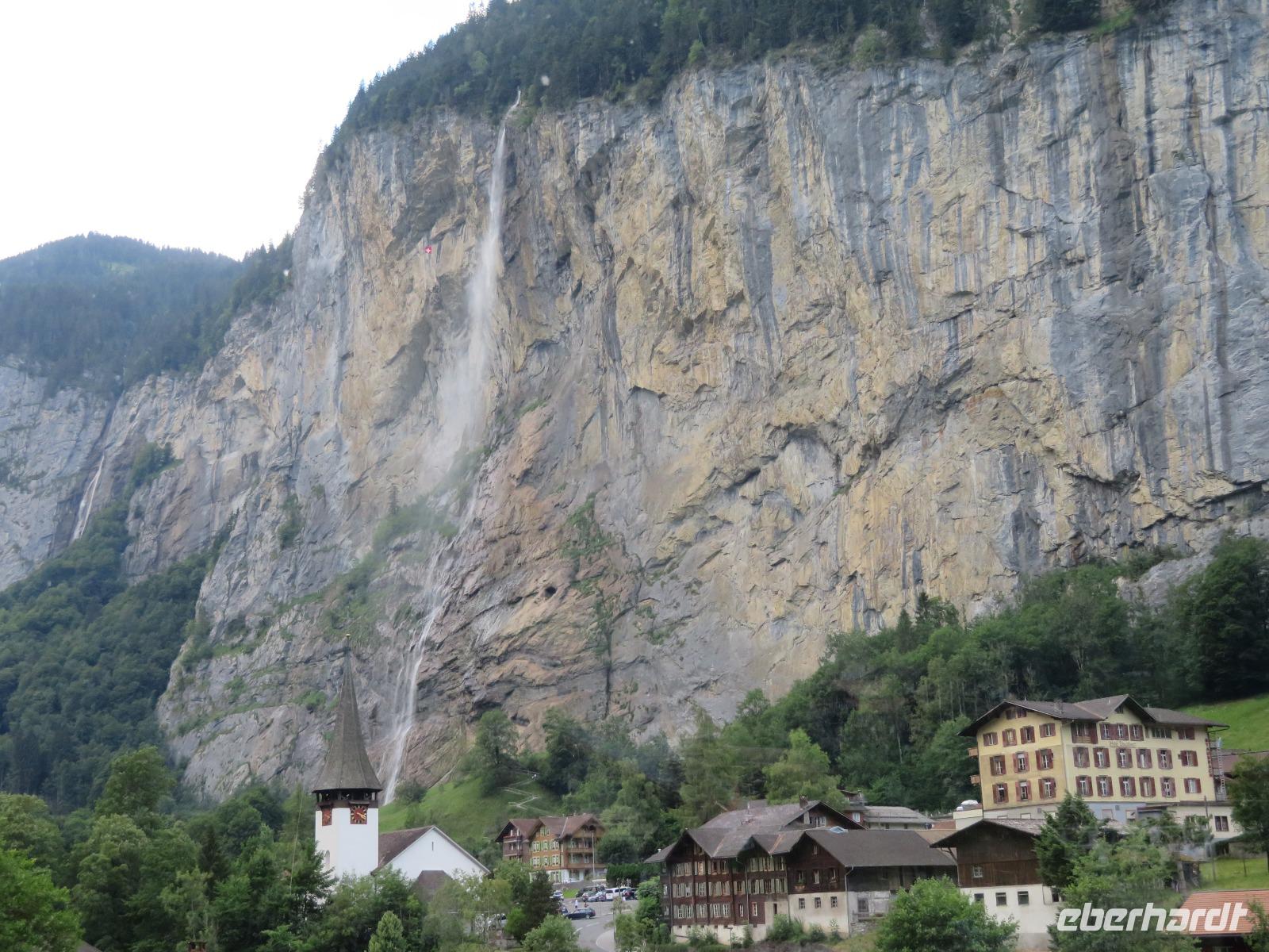 Am Morgen fallen einige Regentropfen in Interlaken. Mit dem Bus fahren wir durch das Lauterbrunnental hinauf nach Stechelberg. Nun beginnt unsere Fahrt mit vier Kabinenbahnen auf das Schilthorn. Die erste Bahn bringt uns nach Gimmelwald und weiter geht es nach Mürren. Wir unternehmen einen kurzen Spaziergang durch den hübschen Ort. Nun erolgt die Fahrt mit der dritten Bahn nach Birg in 2.677 Metern Höhe. Auch hier legen wir eine Pause ein. Wir besuchen zunächst den Skywalk. Die Aussichtsterrasse befindet sich über dem Abgrund einer Felswand mit Blick auf das Dreigestirn Eiger, Mönch und Jungfrau und zum Breithorn. Nur kurz reissen die Wolken auf und geben uns den traumhaften Blick frei. Anschließend wagen sich die Mutigsten von uns auf den Thrillwalk. Dieser Steg besteht aus Gittern und Glasböden kombiniert mit einem Seil zum Balancieren und einem Schlauch aus Stahlnetzen. Er führt in schwindelerregender Höhe an der Felswand über einem tiefen Abgrund entlang. Es ist Nervenkitzel pur, der aber viel Spaß macht. Die vierte, spektakulärste Seilbahn bringt uns zwischen Birg und dem Schilthorn über eine Mulde ohne Pfeiler. Sie verläuft auf einer Länge von 1.800 Metern auf den Gipfel in 2.970 Metern Höhe. Leider verdecken immer wieder Wolken das einmalige 360° Panorama. Nur ab und an geben die Wolken in kleinen Lücken kurz die Blicke frei. Wir besuchen die James Bond World, welche an den James-Bond-Film „Im Geheimdienst Ihrer Majestät" erinnert. Das Schilthorn war 1968 Schauplatz für den Film. Die Ausstellung ist sehr kurzweilig und interessant gestaltet. Wir besuchen den Walk of Fame, welcher den Darstellern und Akteuren des Filmes gewidmet ist. Die Aussichtsplattform bietet ein schönes Bild auf den Gipfel des Schilthorns. Nun nehmen wir im Drehrestaurant noch ein schmackhaftes 3-Gang-Menü ein. Nach einem ausgiebigen Aufenthalt auf dem Berg bringen uns die Seilbahnen nach Mürren und Stechelberg zurück. Wir fahren mit unseren Bus vorbei am Staubachfall, den bereits Johann Wolfgang von Goethe in einem Gedicht beschrieb, nach Interlaken zurück. Den Nachmittag gestalten alle nach Ihren Wünschen in Interlaken.