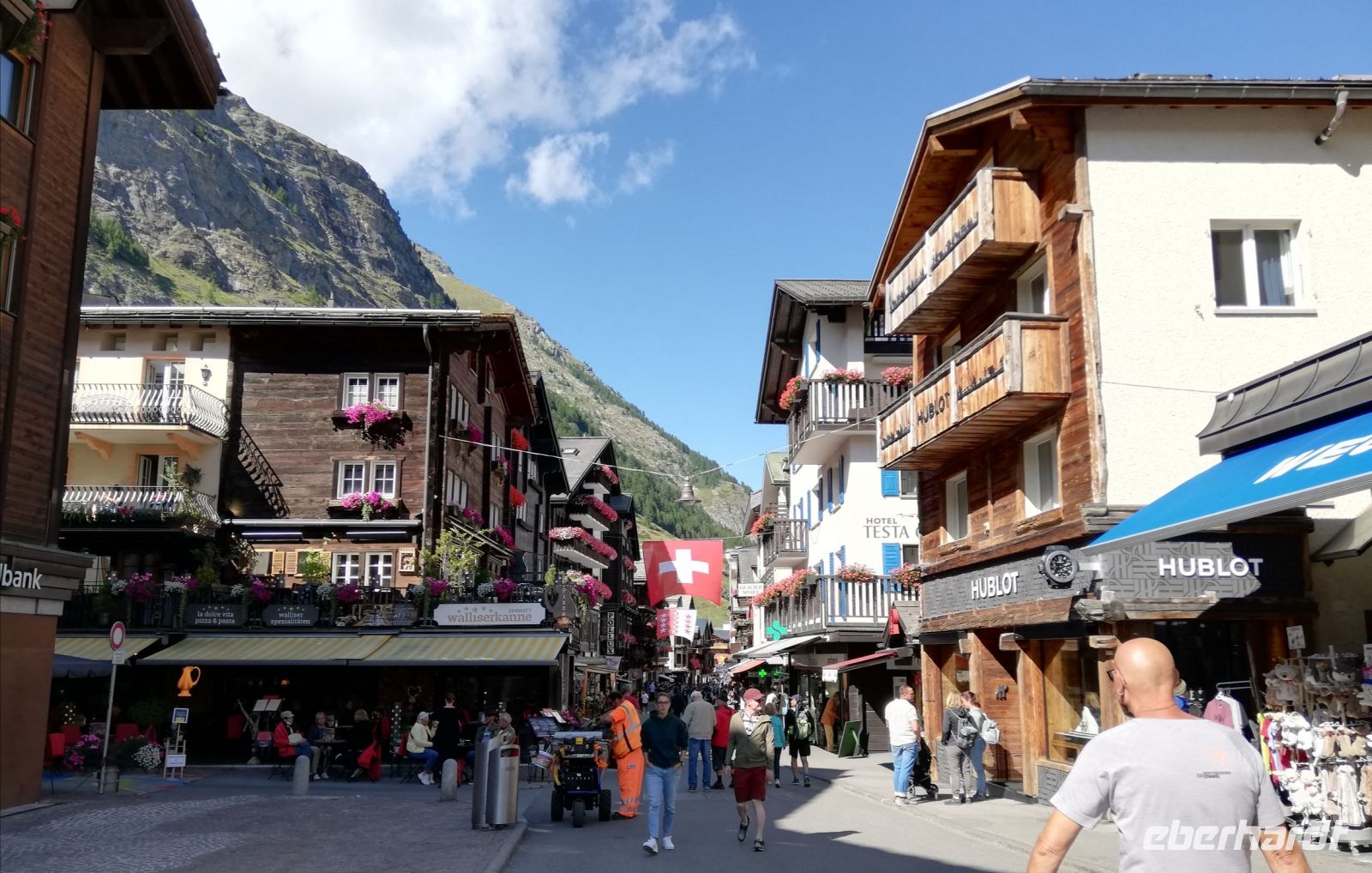 Das Rothorn und eine Wanderung haben wir für heute auf dem Programm. Für Zermatt ist Sonne angesagt und somit starten wir gut gelaunt. Zuerst geht es zur Bergstation.Wir laufen durch den Sunneggatunnel und fahren dann mit der Standseilbahn hoch auf die Plattform zur Sunnegga-Terrasse. Wir genießen hier die Schönheit des Traumgipfel Matterhorn, beobachten aber auch die Gornergratbahn und haben eine gute Sicht auf das Klein Matterhorn. Nach einer kurzen Pause geht es mit der Gondelbahn zur Station Blauherd. Von hieraus werden wir auch unsere Wanderung beginnen. Doch bevor es so weit ist, fahren wir auf das Rothorn mit seinen 3103 Meter.Wir haben den Berg fast für uns allein. Sehr beeindruckend ist der Blick auf die Viertausender der Walliser Alpen. Die größere Gruppe fährt mit zurück zur Station Blauherd. Wir werden den Blumenweg wandern. Dabei ist es augenfällig, dass der Blumenreichtum um Zermatt immens ist. An einer Vielzahl von Tafeln gibt es eine Erklärung zu den Pflanzen. Wir lassen uns Zeit auf unserer Wanderung und kehren in einer Alphütte in Tuftern ein, um den Kaffee und Obstkuchen oder auch ein kühles Bier zu uns zu nehmen. Nach dieser Pause wandern wir wieder zur Sunnega (ca. 30 min) und fahren mit der Bahn nach Zermatt. Es bleibt noch Zeit für den Ort und auch einen Besuch des beeindruckenden Museums. Am Abend treffen wir uns im Hotel bei einem sehr guten Abendessen und guten Gesprächen. Ein sehr schöner Tag geht zu Ende.