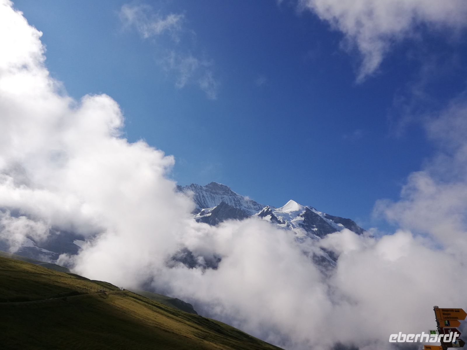 Heute erleben wir Sonne und Wolken. Gut gestärkt geht es mit dem Bus nach Lauterbrunnen.Alles ist gut organisiert und die Waggons für uns reserviert. Vorbei geht es an Wengen zur Kleinen Scheidegg. Die Bergwelt von Eiger, Mönch und Jungfrau liegt vor uns, aber die Wolken lassen nur einen zögerlichen Blick auf die Berge zu.Das Jungfraujoch verschwindet hin und wieder in einer Wolke. Wir sehen es hoffentlich noch frei. Nach kurzen Aufenthalt auf der Kleinen Scheidegg geht es weiter zum Jungfraujoch. Mit 1 Fotostopp (Eismeer) im Berg, kommen wir dann auf den höchsten Bahnhof Europas (3454) an. An die Höhe muss man sich erst gewöhnen und jeder schlägt sein Tempo an. Wir sind über den Wolken und haben einen grandiosen Blick von der Aussichtsplattform Sphinx in die Berge und den 23 km langen Aletschgletscher. Die Zeit vergeht wie im Flug und nach ca. 3 Stunden fahren wir zurück zur Station Eigergletscher. Von hieraus geht es nun wiederum mit einer neuen 3S-Gondel nach Grindelwald Grund, wo Jan schon auf uns wartet. In Interlaken wieder angekommen bleibt Zeit, Interlaken zu erkunden.
