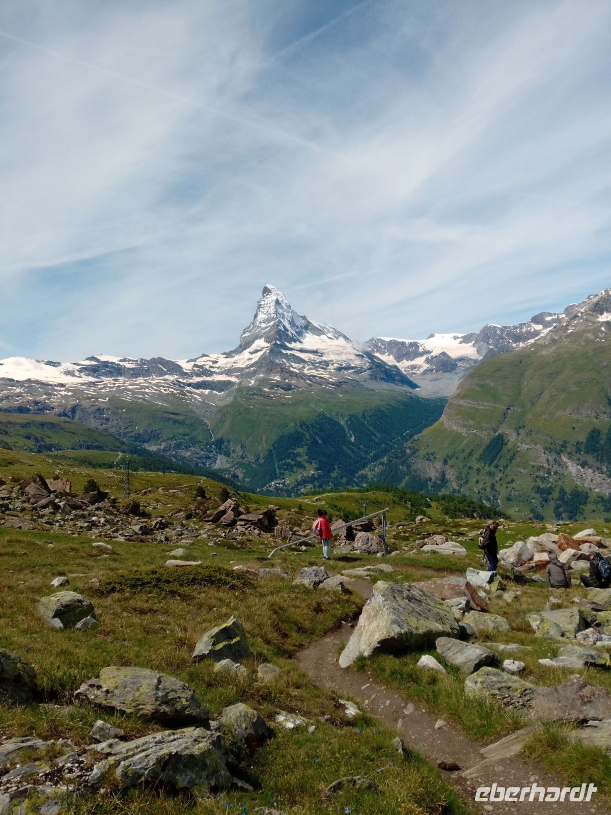 Das Zvieri (Brotzeit, Jause nachmittags) in Tufteren hatten wir wirklich nötig, denn es war ein anstrengender Weg. Und das alles vor der Kulisse des Matterhorns: einfach sensationell. Müde gehen wir weiter zur Station Sunnegga und fahren zurück nach Zermatt.