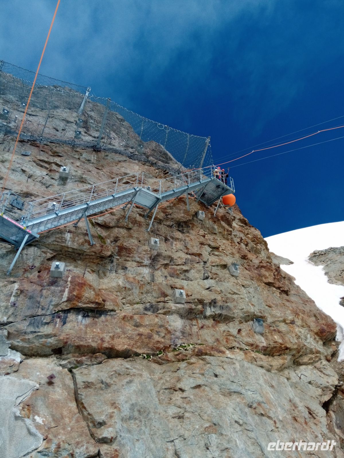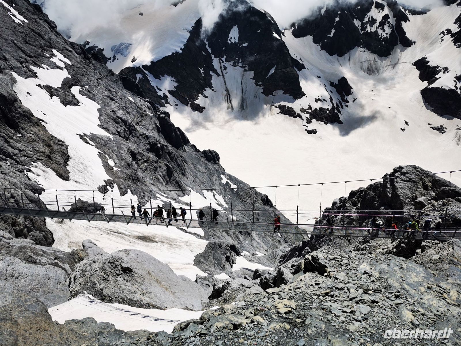 Vor uns die imposante Gletscherlandschaft und.....der Cliff-Walk, ein Spaziergang auf der schmalen Hängebrücke über dem Abgrund auf 3.041 m Höhe ist nicht ohne – aber alle haben es gewagt. Einen spektakulären Blick in die eisigen Tiefen des Gletschers hatten wir vom ICE-FLYER, einem Sessellift von der Bergstation zum Gletscherpark. Die Gletschergrotte, ein 150 m langer Gang führte uns 20 m tief unter die Oberfläche des Gletschers und einige von uns probierten auch „snow-tubing“ aus und rutschten auf Gummi-Reifen die Piste hinunter.