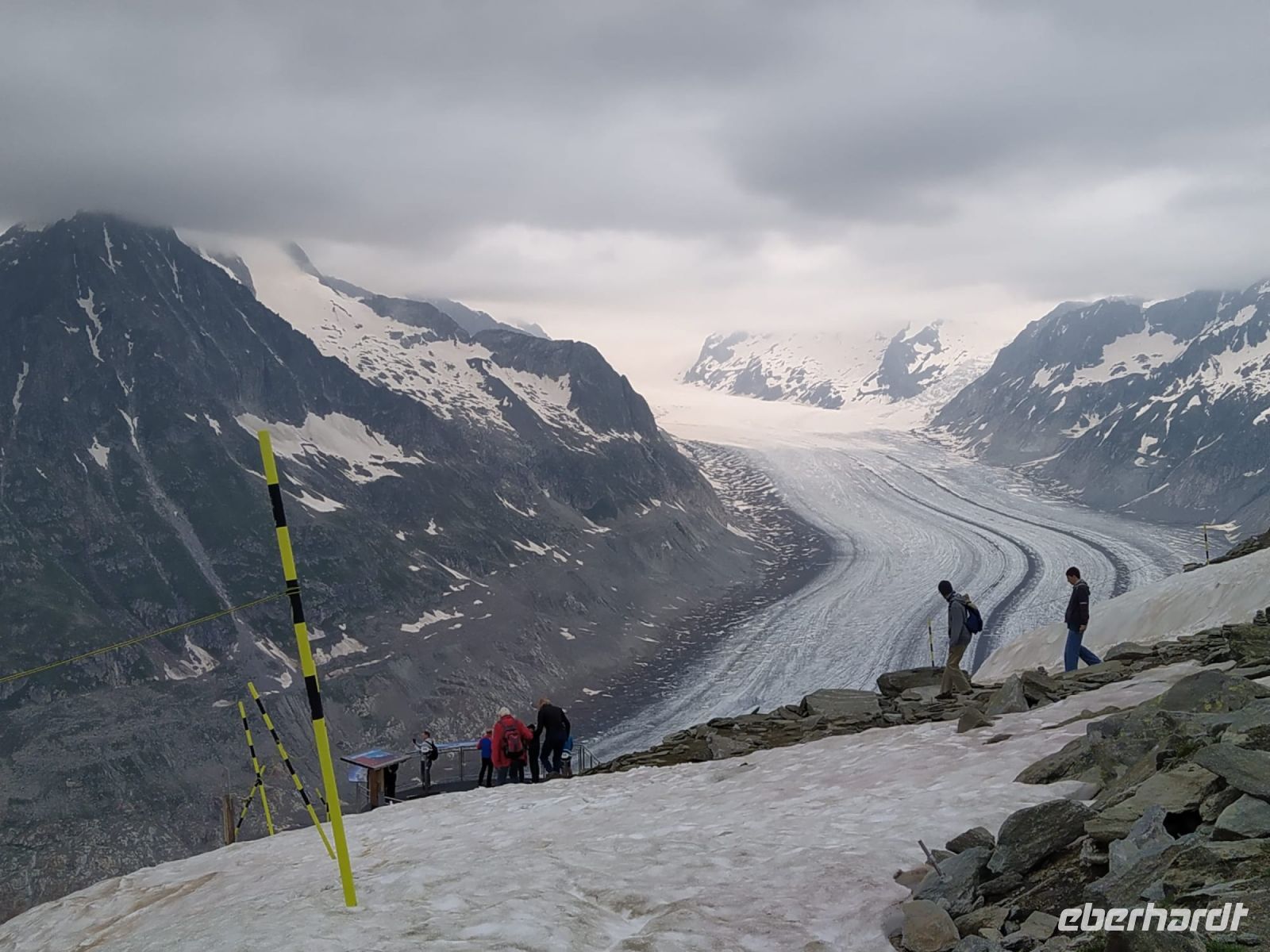 Nach einem guten Frühstück fahren wir zur Seilbahnstation des Eggishorn. Wir fuhren mit der neuen Gondelbahn zur Fiescheralp und dann weiter mit der Kabinenbahn zum Eggishorn View Point. Der Rundwanderweg war wegen der Witterung nicht gut begehbar. Eine Wanderung zum Eggishorn war an diesem Tag leider nicht möglich. Der Blick auf den Konkordia-Platz des Aletschgletschers ist atemberaubend. Ein Phänomen der Superlative – der längste Gletscher der Alpen. Sein Ursprung liegt in der rund 4.000 m hoch gelegenen Jungfrau-Region und bildet das Herz des UNESCO-Welterbes Schweizer Alpen Jungfrau-Aletsch.