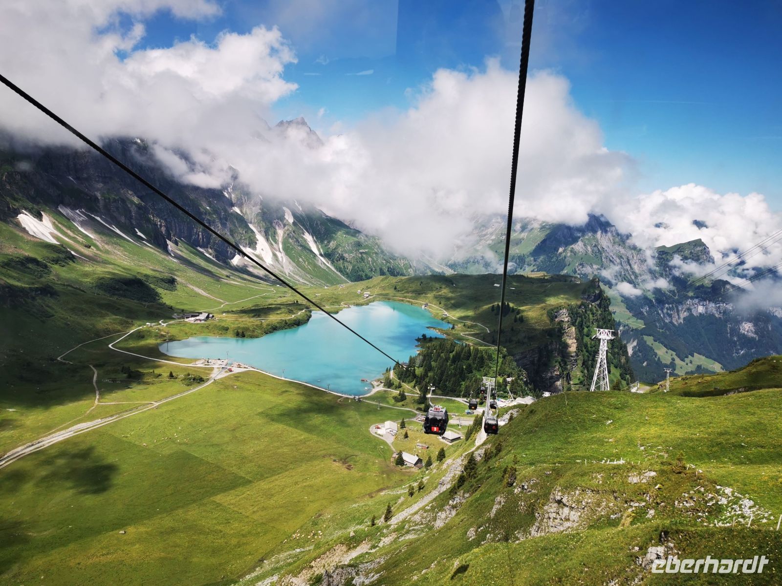 Wir fahren mit dem Titlis-Express, einer 6-er Gondelbahn, los bis zur Station Trübsee auf 1.763 m und nach einer Pause weiter mit einer sich drehenden Großgondel bis zur Bergstation Titlis auf 3.020 m.