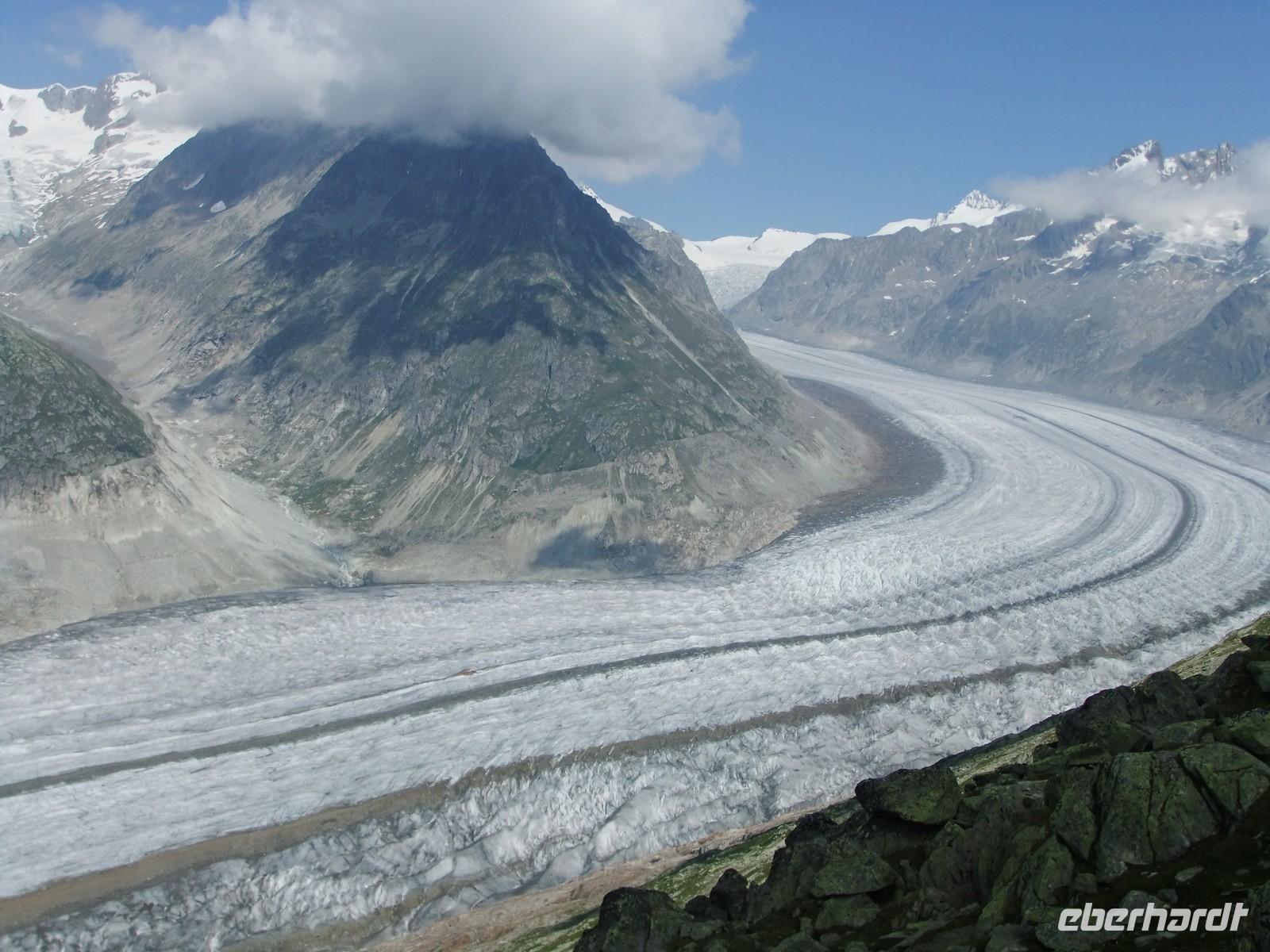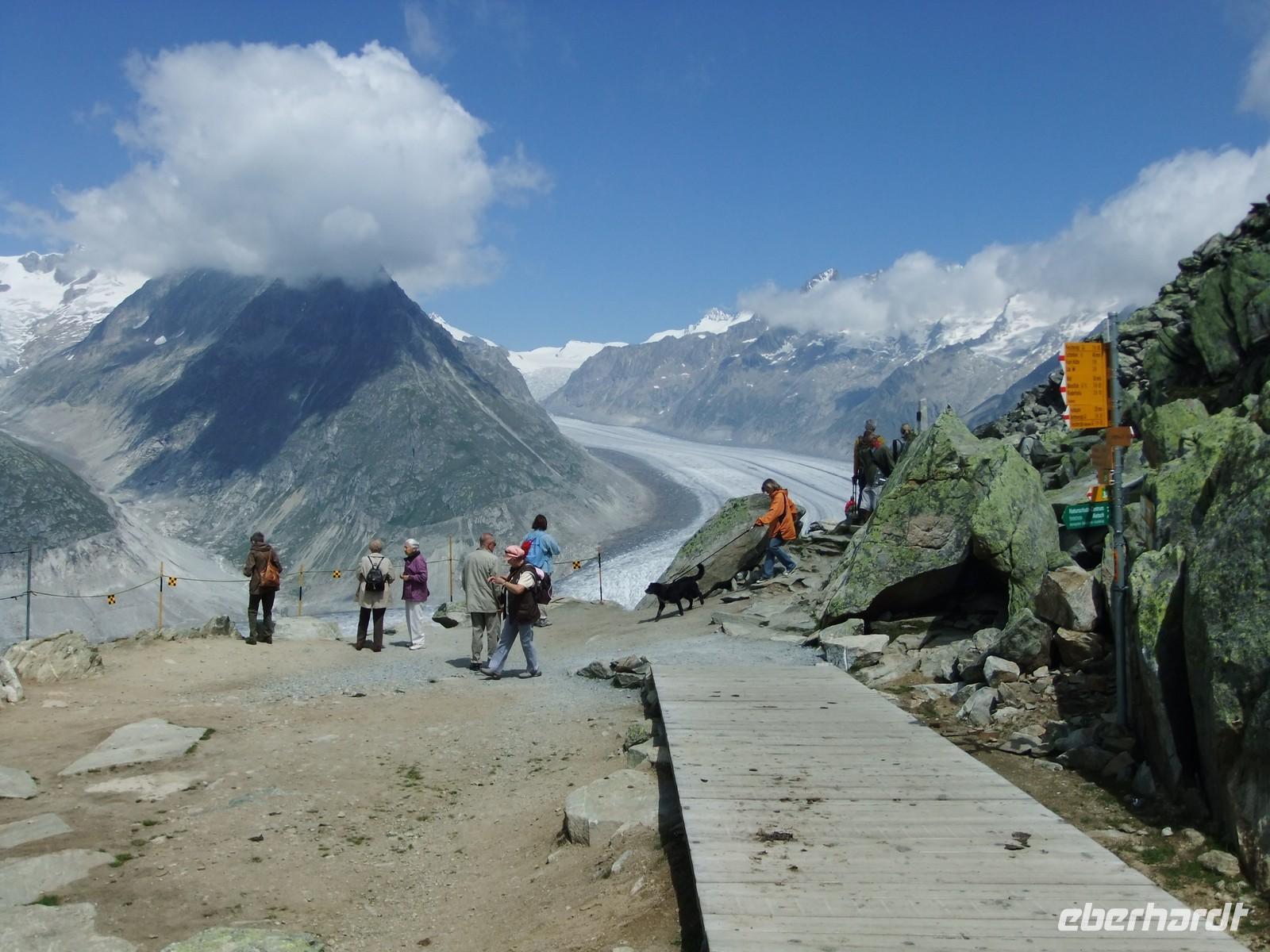 Danach geht es zur "Eisterrasse". Von hier hat man freie Sicht auf den Aletschgletscher, den längsten Gletscher der Alpen. Nun besuchen wir noch die multimediale Ausstellung "Eiswelt Bettmerhorn", die im vergangenen Jahr eröffnet wurde. Der Rundgang führt uns an verschiedenen Szenen mit sprechenden Puppen vorbei. Wir lernen dabei Forscher und Touristen aus dem 19. Jahrhundert kennen, begegnen sogar einem Gletscherfloh und durchqueren eine Gletscherspalte. Danach geht es mit der Seilbahn wieder zurück zur Bettmeralp. Von hier aus wandern wir auf einem Panoramaweg hoch über dem Rhonetal zur Riederalp. Immer wieder eröffnen sich uns schöne Aussichten auf die Bergwelt der Walliser Alpen. Auf der Riederalp bleibt noch Zeit für einen Kaffee auf der Sonnenterrasse. Und wir haben Glück - das Matterhorn zeigt sich uns in der Ferne in seiner ganzen Pracht. Danach fahren wir mit der Seilbahn hinunter nach Mörel, wo uns Rene schon mit seinem Bus erwartet und nach Leukerbad bringt.