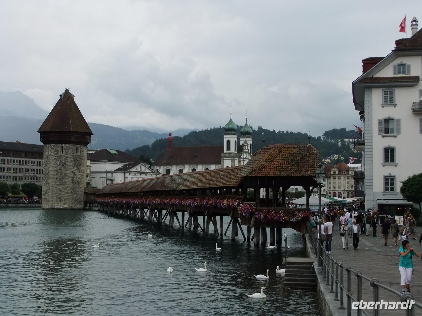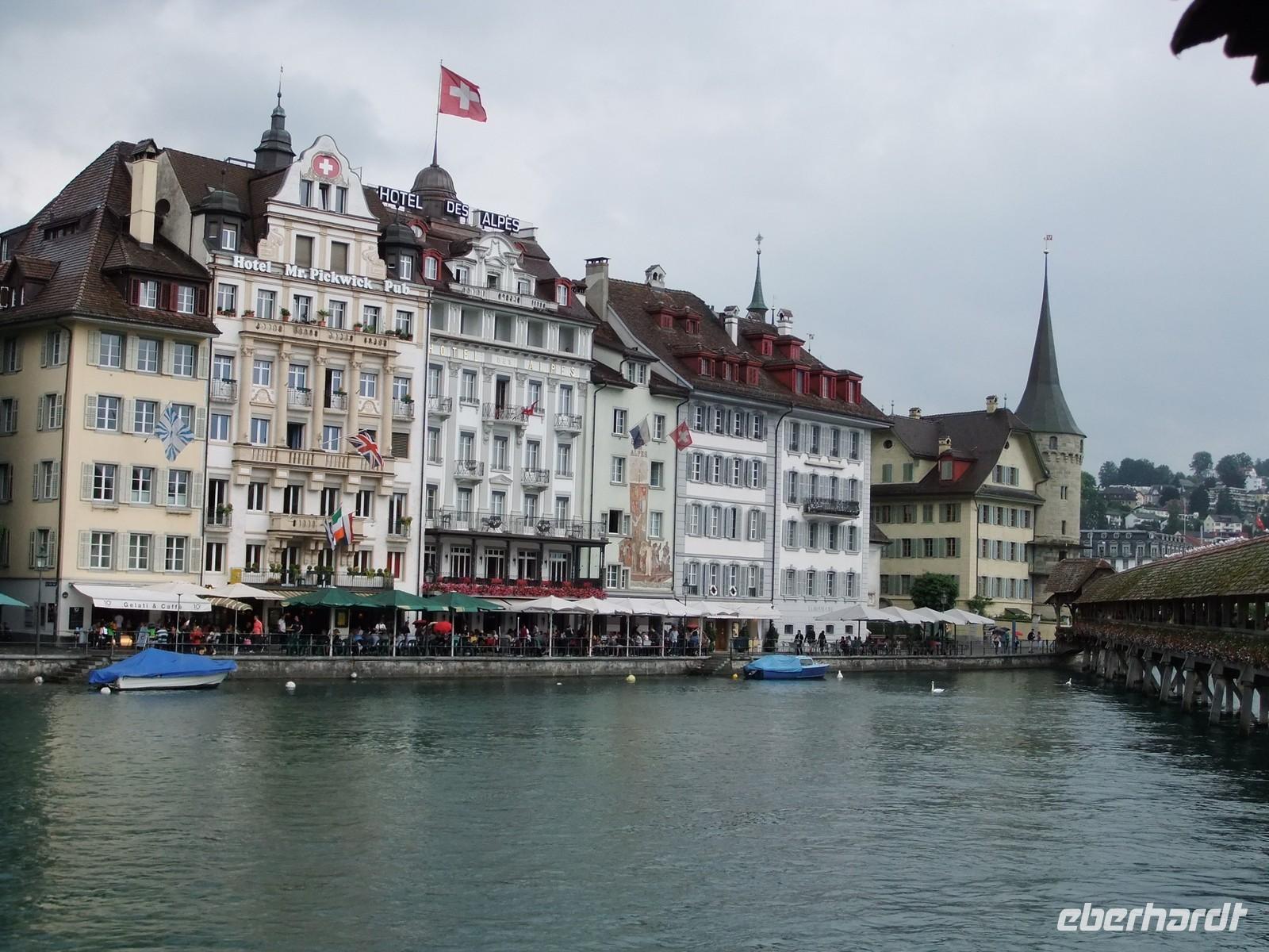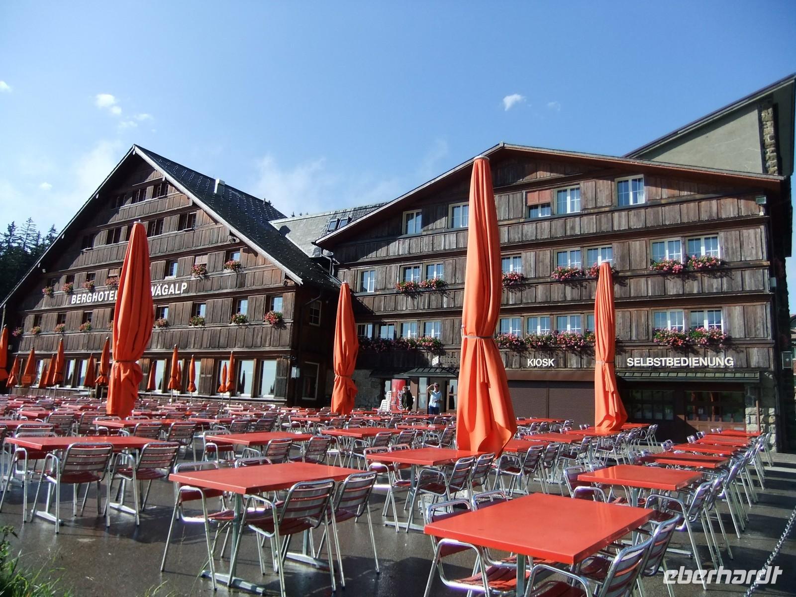 Lieder müssen wir uns heute von Leukerbad verabschieden. Die Koffer sind schnell eingeladen und wir holen unsere Wandergäste an ihrem Hotel ab. Auch sie hatten erlebnisreise Tage mit Wanderleiter Werner und können eine stolze Bilanz vorweisen: 1350 m bergauf, 4640 m bergab, 76 km insgesamt. Ein letztes Mal geht es die Serpentinen hinab. Nach ca. einer Stunde hat Chauffeur Rene noch eine "Überraschung" für uns, dann setzten wir unsere Fahrt durch das Rhonetal und das Goms fort. In Gletsch beginnt die Straße zum Grimselpass. Wir genießen den Blick zurück ins Tal und auf den Rhonegletscher. An der Passhöhe machen wir unsere Mittagspause und natürlich viele Fotos. Unser nächstes Ziel ist Luzern am Verwaldstätter See. Wir bummeln über die Kapellbrücke und durch die Altstadt - doch dann treibt uns ein Gewitterguss schnell zum Bus zurück. Und so fahren wir weiter zu unserer Zwischenübernachtung, zum Berghotel "Schwägalp". Es liegt auf einer Höhe von 1283 m am Fuße des Säntis.