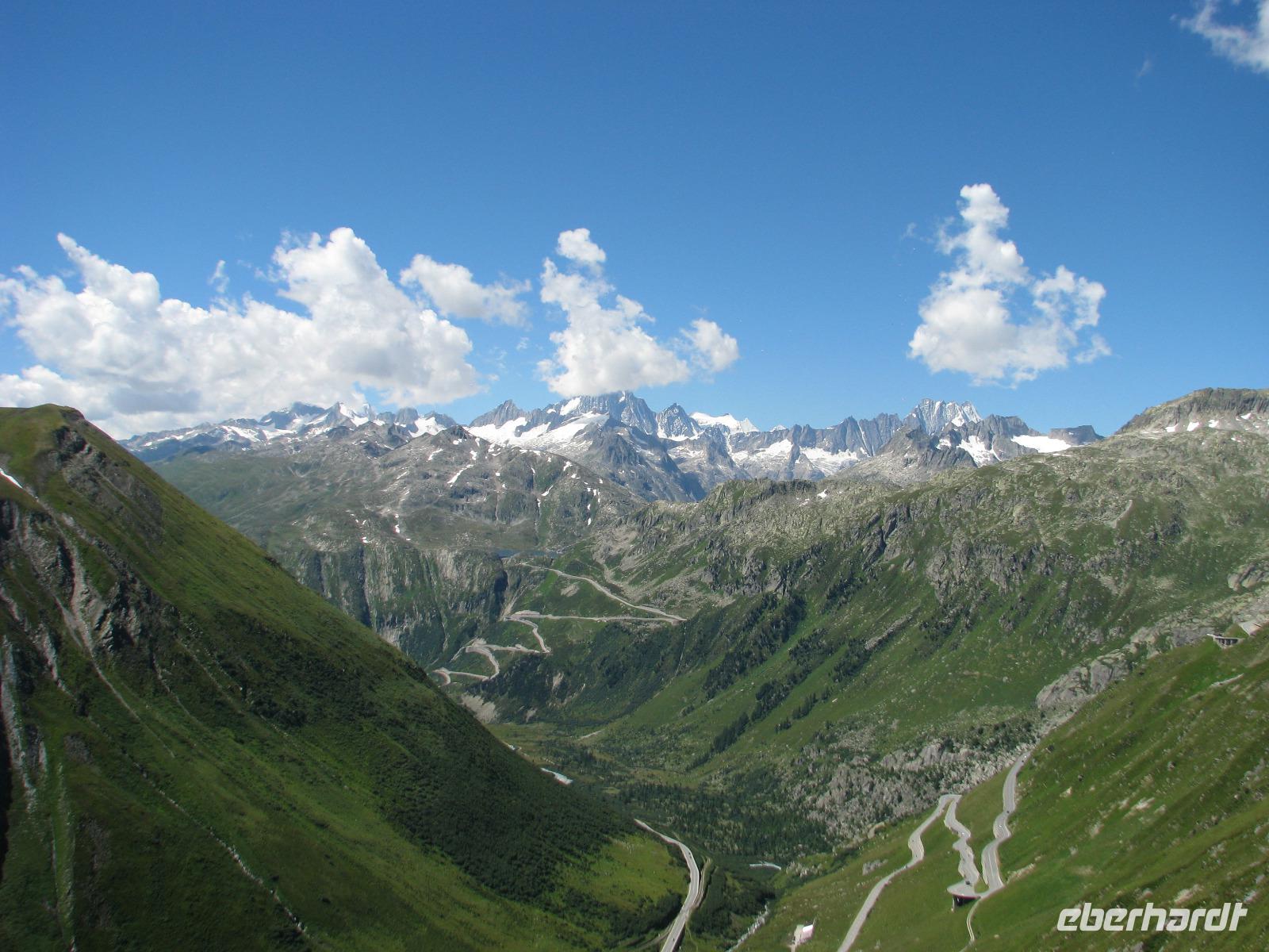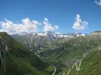 Um unser heutiges Ziel Leukerbad zu erreichen, gilt es noch einige Pässe zu überqueren. Zunächst führt uns unser Weg in Richtung Meiringen. Die Aare begleiten unseren Weg bis zur Sustenstraße, die uns schon ein wenig auf das einstimmt, was im Laufe des Tages noch folgen soll. Wir passieren ein Stück der Gotthardstrecke um schließlich auf den Furkapass zu gelangen. In beeindruckenden Kehren scheinen wir uns förmlich auf die 2436 hinauf zuschrauben.