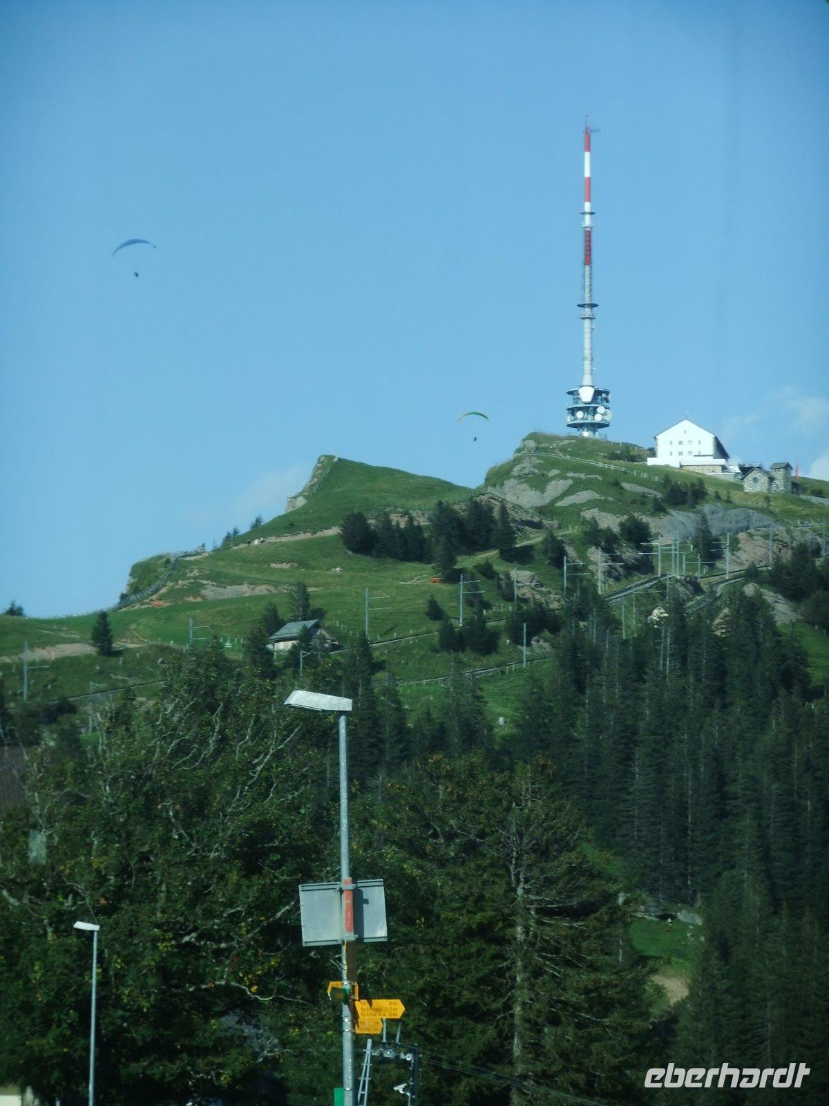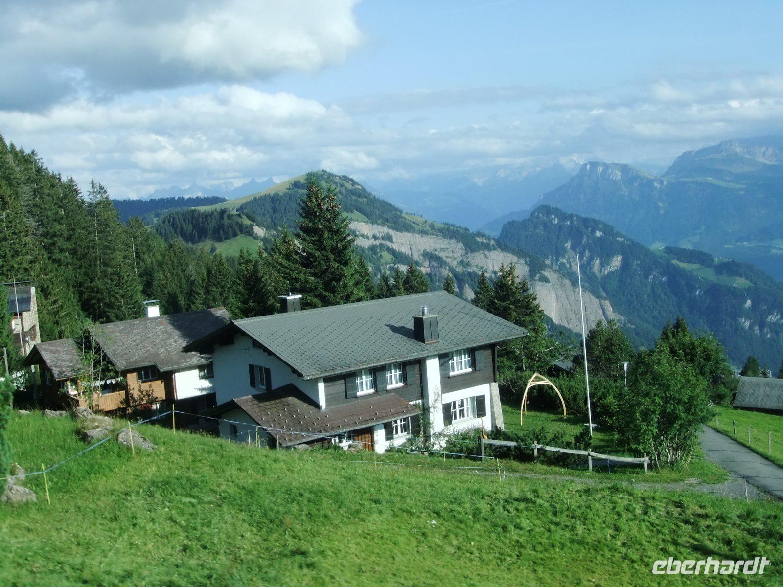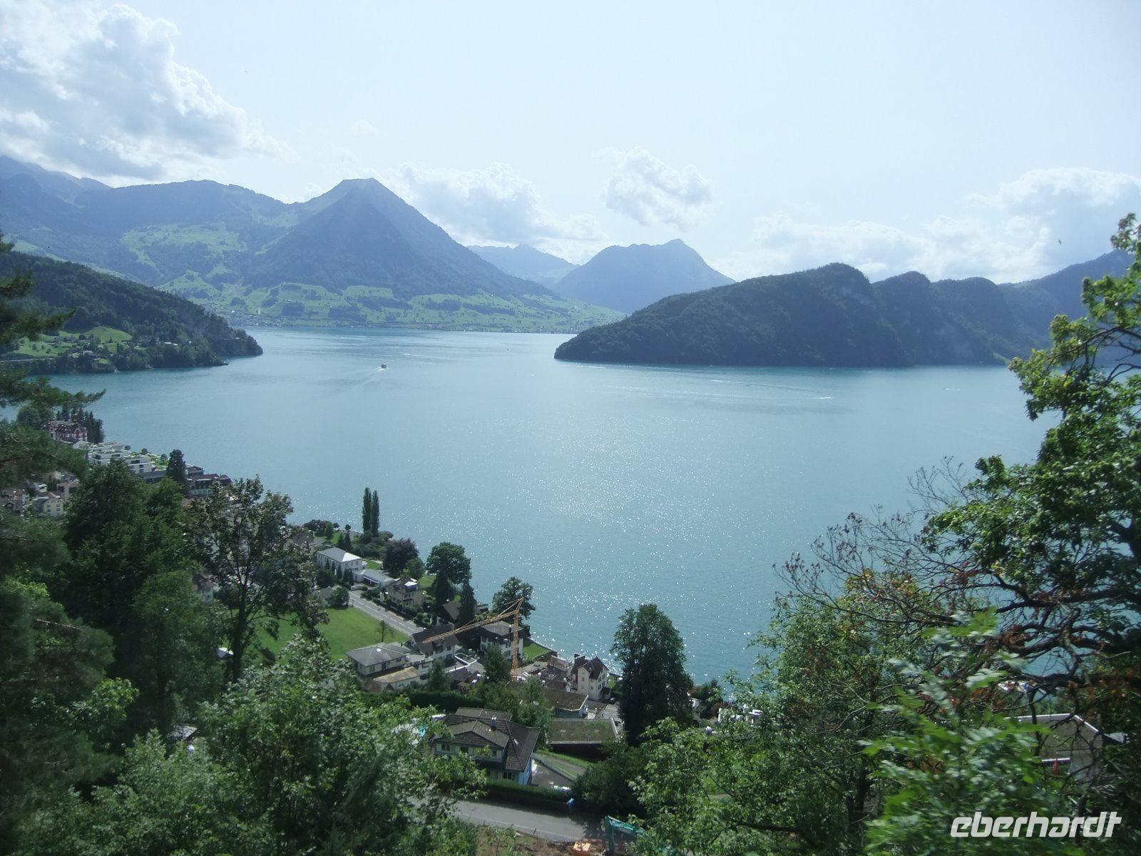 Die vergangen beiden Tage hat es in Deutschland fast nur geregnet. Deshalb sind wohl alle Eberhardt-Gäste, die heute mit mir und Chauffeur Jürgen in die Schweiz fahren wollen, froh über den regenfreien Morgen. Pünktlich 6 Uhr starten wir in Dresden. Nach drei weiteren Zustiegen ist unsere Reisegruppe in Münchberg bereits komplett. Vorbei an Nürnberg und Ulm fahren wir, teilweise allerdings schon wieder bei Regen, Richtung Bodensee. Hier verlassen wir Deutschland, durch den 6,7 km langen Pfändertunnel geht es nach Österreich. Doch nur für kurze Zeit, denn an der Grenze Lustenau reisen wir schon in die Schweiz ein. Weiter führt unsere Reise - bei endlich schönem Wetter - durch das Rheintal, dann vorbei an Walensee, Zürichsee und Schwyz. Über dem Urner See, einem Teil des Vierwaldstättersees, liegt der Ort Seelisberg. Wir erreichen ihn durch den gleichnamigen Tunnel.