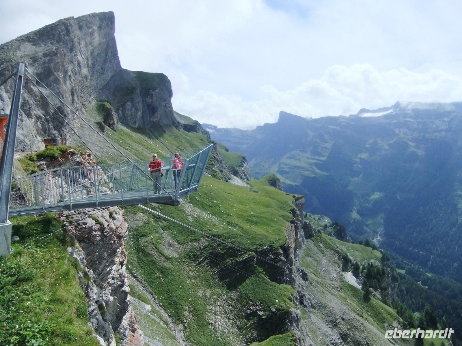 Den ersten Teil des Tages verbringen die die Gäste heute individuell. Da uns schon am Morgen die Sonne begrüßt, wollen die meisten hoch hinaus. Mit dem Ortsbus fahren wir zur Talstation der Gemmibahn. Sie bringt uns von 1411 m in Leukerbad auf 2350 m. Schon die Fahrt mit dieser Kabinenbahn ist ein Erlebnis. Immer kleiner werden die Leukerbader Häuser unter uns. Oben angekommen, sind wir begeistert vom Ausblick. Für Mutige wurde 2011 eine besondere Aussichtsplattform gebaut. Ein dünner Gitterrost und die superleichte Stahlkonstruktion vermitteln uns das Gefühl des Schwebens über dem 300 m tiefen Abgrund. Zu einem Spaziergang am Ufer lädt der Daubensee ein.