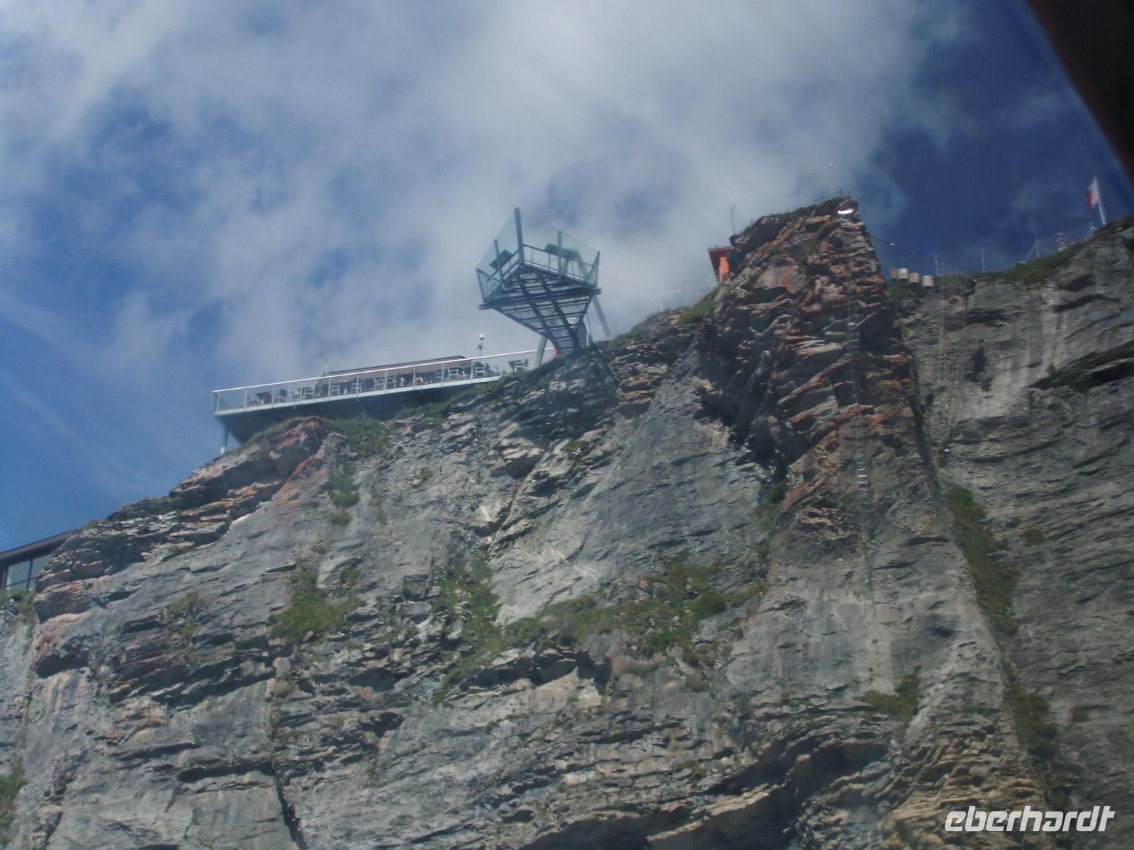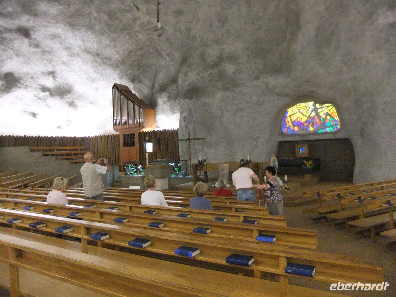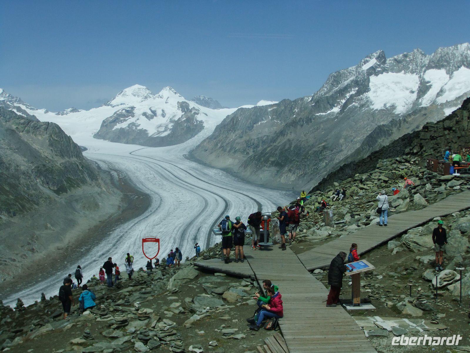 Heute steht der fakultative Ausflug zur Aletscharena auf dem Programm. Wir fahren hinunter ins Rhonetal und dann nach Fiesch. Wir freuen uns auch heute über den Sonnenschein, denn wir wollen wieder einen Berg „erklimmen". In Fiesch besteigen wir die große Kabinenbahn, die hinauf zum Fiescheralp fährt. Von hier geht es mit einer weiteren Seilbahn aufs Eggishorn. Schon bei der Auffahrt können wir u.a. der Matterhorn sehen. Oben kehren wir ein im Restaurant „Gletscherblick". Während wir unser 3-Gang-Menü mit Suppe, Cholera und Aprikosenkuchen genießen schauen wir immer wieder auf den Aletschgletscher sowie auf Eiger, Mönch und Jungfrau. Nach dem Essen werden noch viele Fotos gemacht. Die Sicht auf die Berge der Berner und der Walliser Alpen ist einfach toll. Bei der Rückfahrt legen wir noch eine Pause auf der Fiescheralp ein, dann geht es wieder hinunter nach Fiesch und mit dem Bus nach Raron. Hier befindet sich eine besondere Sehenswürdigkeit des Rhonetales: die Felsenkirche. Mit 500 Sitzplätzen ist es das größte Gotteshaus Europas, das sich vollständig im Felsinneren befindet. Es ist immer wieder ein beeindruckendes Gefühl, wenn man eintritt und die Musik erklingt.