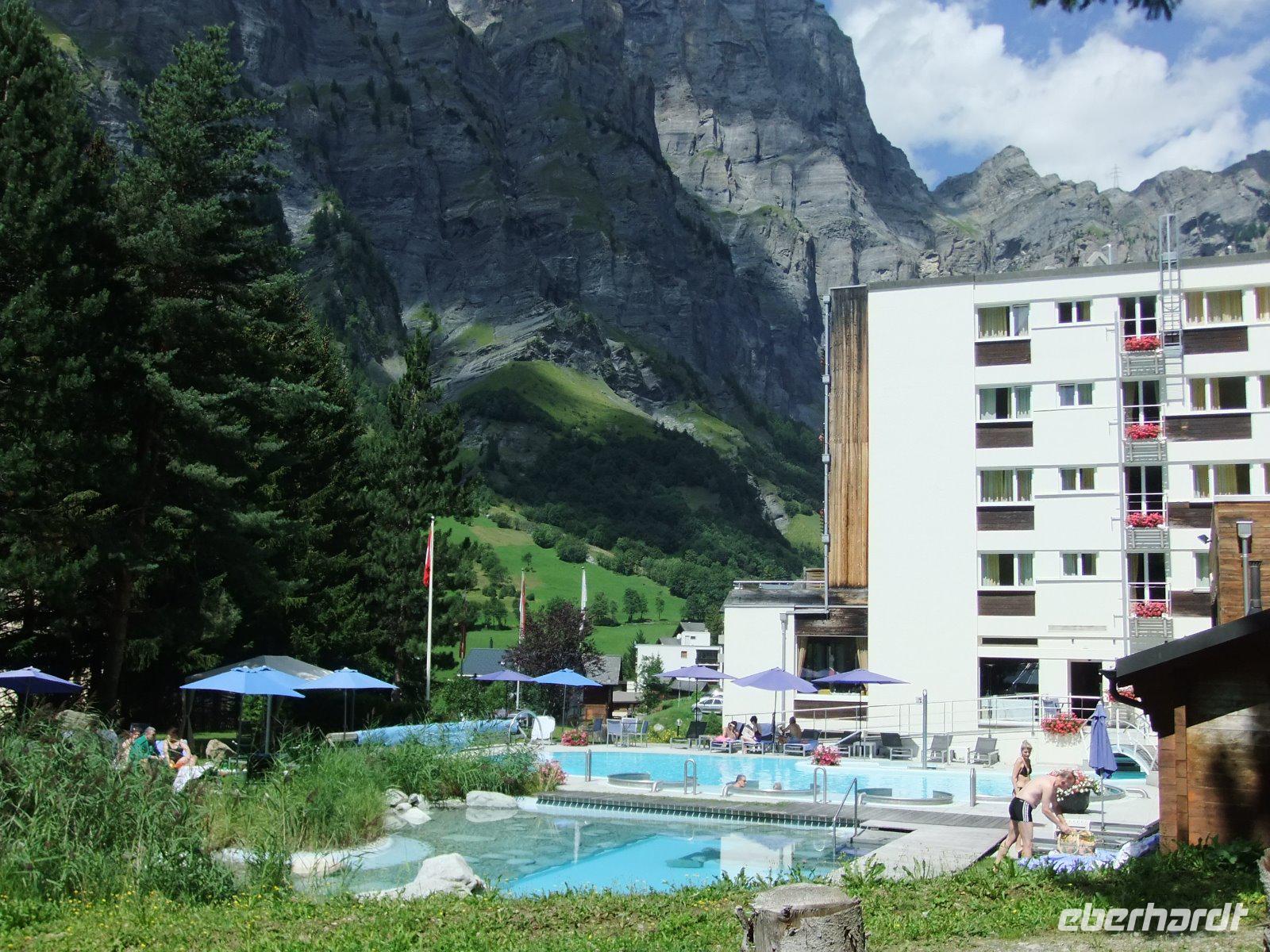 Wir fahren weiter durch das Rhonetal bis Leuk. Vor uns liegt nun noch eine Strecke von 16 Kilometern, die mich immer wieder begeistert. Führt sie doch entlang tief eingeschnittener Täler und vorbei an steil aufragenden Felswänden. Dann haben wir unser Ziel, den Thermalquellenort Leukerbad, erreicht. Im 4-Sterne-Hotel „Le Bristol" beziehen wir unsere Zimmer und lassen den Tag mit Apero und Abendessen ausklingen.