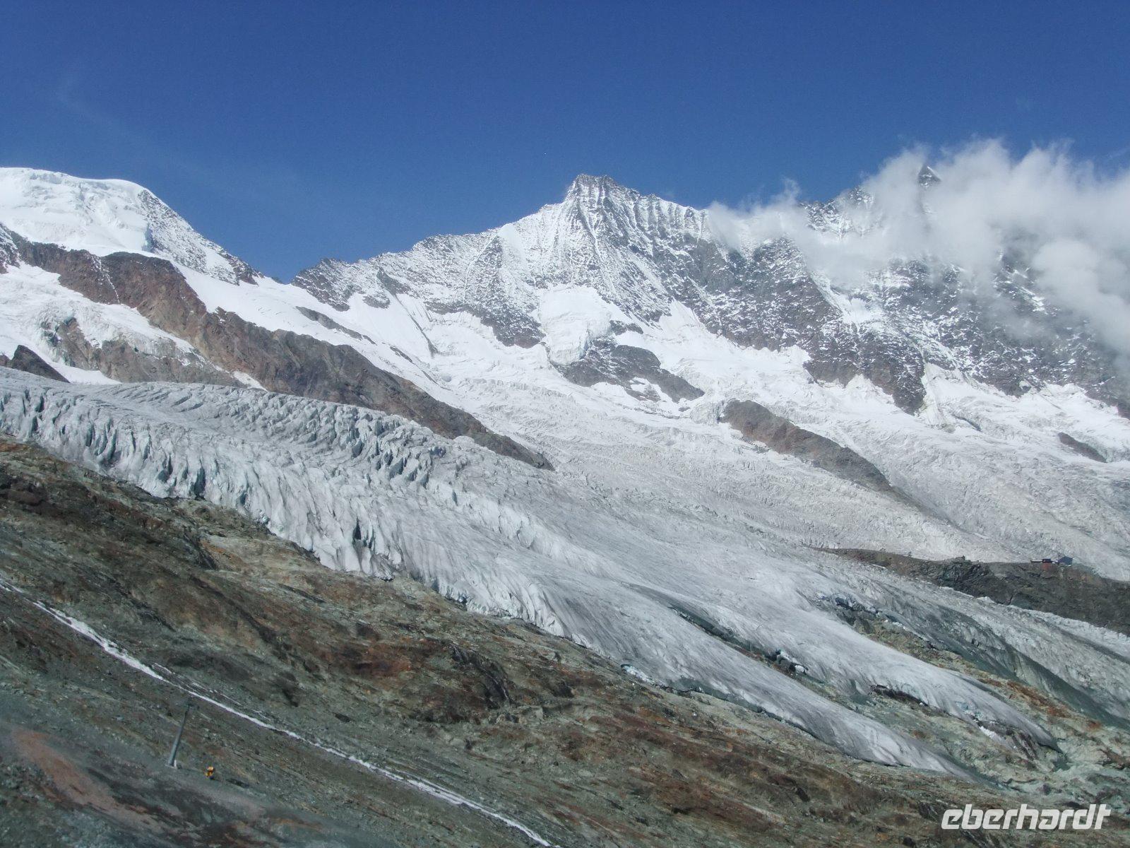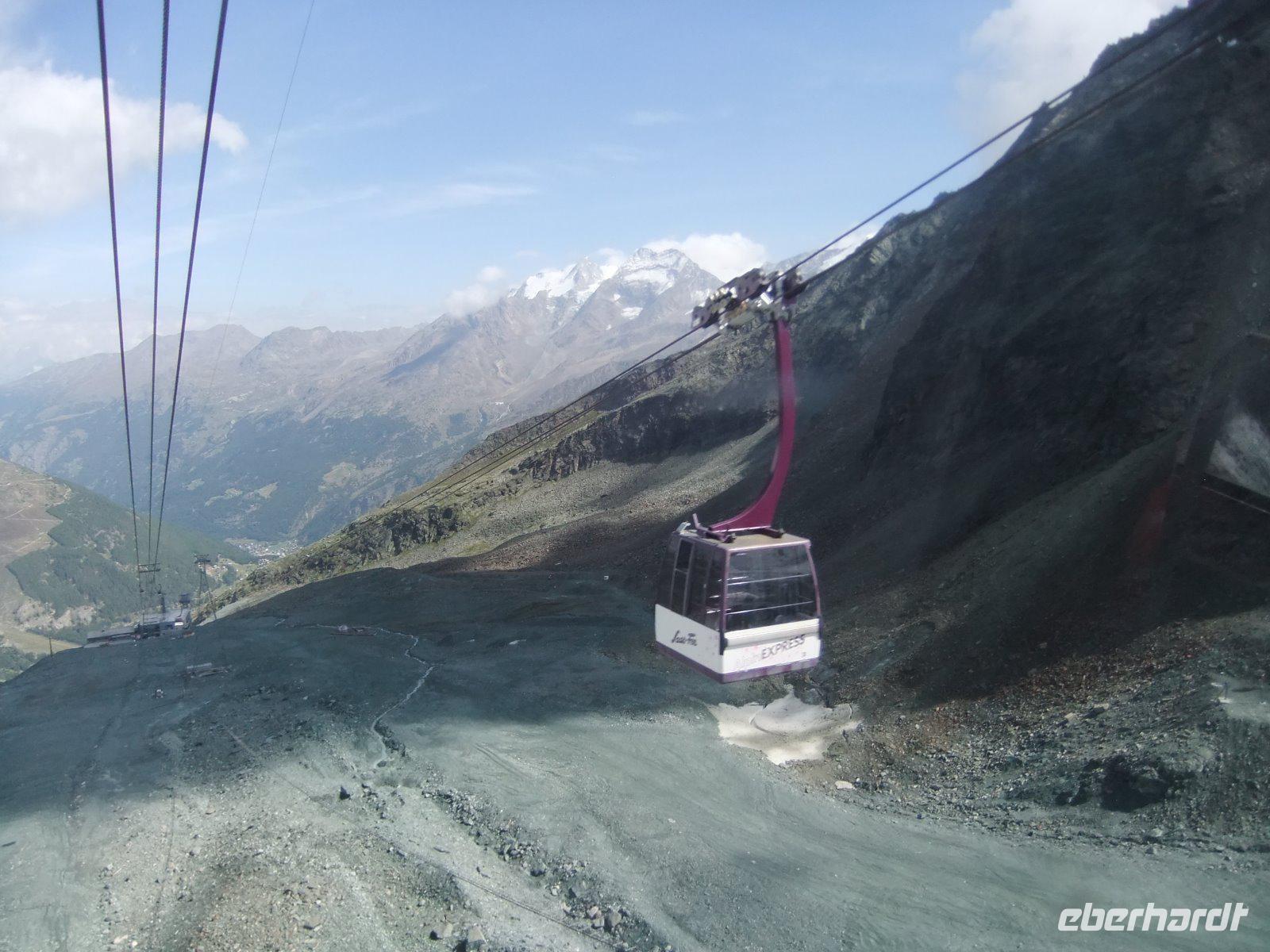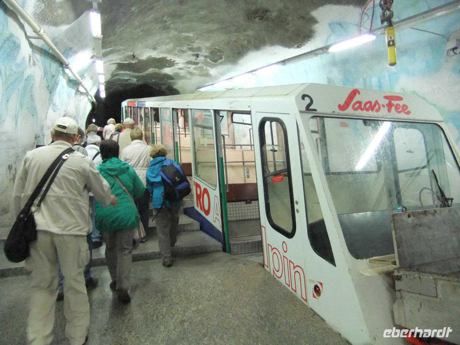 Heute geht es mit dem Bus zunächst nach Visp. Von hier fahren wir bis Stalden durch das Vispertal, dann biegen wir ins Saastal ein. Es ist bekannt durch die Ski-Orte Saas-Grund, Saas-Almagell und Saas-Fee. Letzterer ist unser Ziel. Hier wollen wir hoch hinaus. Dazu gibt es viele Möglichkeiten, wir haben uns für den Mittalallalin entschieden. Vom Busparkplatz laufen wir über die Saaser Vispa zur Talstation. Mit der Kabinenbahn geht es in 10 Minuten hinauf zur Station Morenia und dann weiter bis Felskinn. Hier steigen wir in die Metroalpin. Dabei handelt es sich um die höchste unterirdische Standseilbahn der Welt. In 4 Minuten bringt sie uns zum Allalin auf eine Höhe von 3500 m. Bei strahlendem Sonnenschein genießen wir den Blick auf das Allalinhorn und viele weitere Berge der Schweizer Alpen. Wir machen einen kleinen Spaziergang im Schnee, beobachten die Schneeraupen und schauen auf die dicken Eisgletscher. Die meisten Gäste drehen eine Runde mit dem Restaurant und besuchen den Eispavillon. Es bleibt auch noch Zeit für ein Sonnenbad im Liegestuhl auf der Aussichtsterrasse.