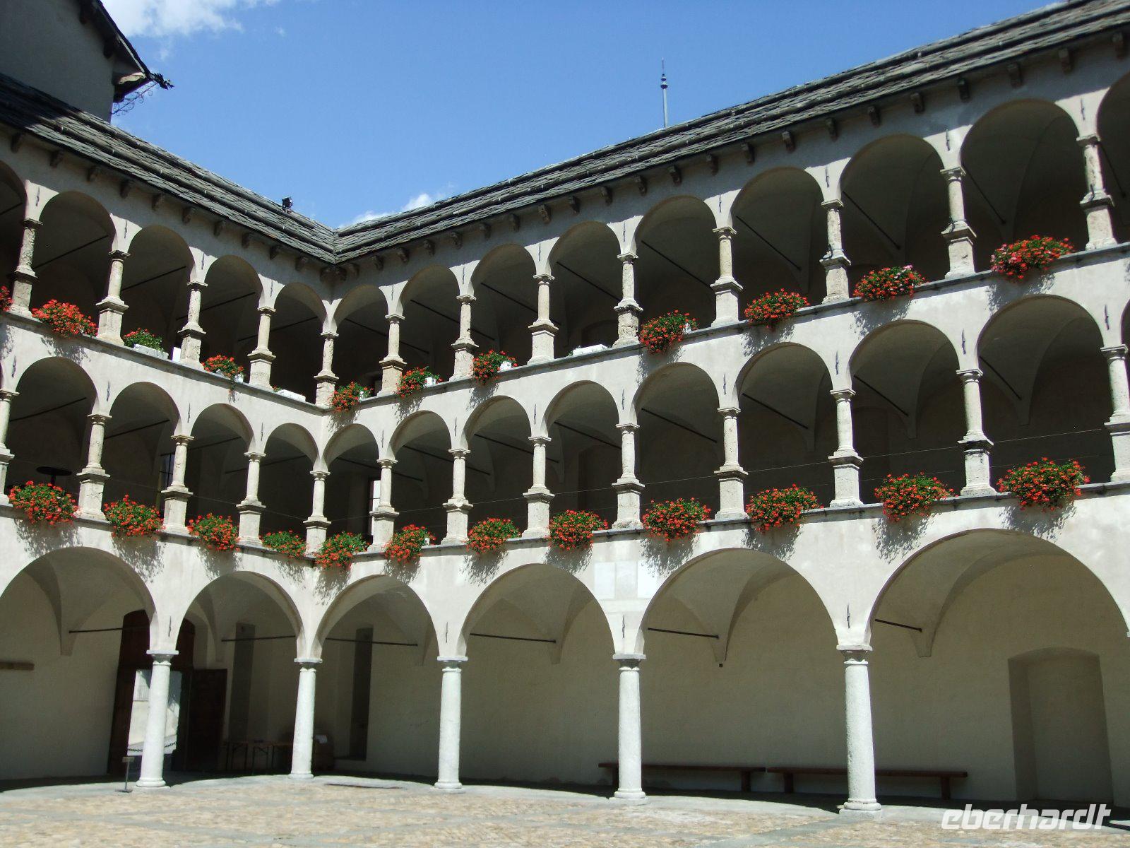 Nach der Mittagspause am Bus besuchen wir Brig, den Hauptort des deutschsprachigen Oberwallis. Bedeutendstes Baudenkmal ist hier der Stockalperpalast mit den drei vergoldeten Zwiebelhauben. Wir spazieren durch den Palastgarten zum Innenhof und weiter ins Zentrum von Brig.