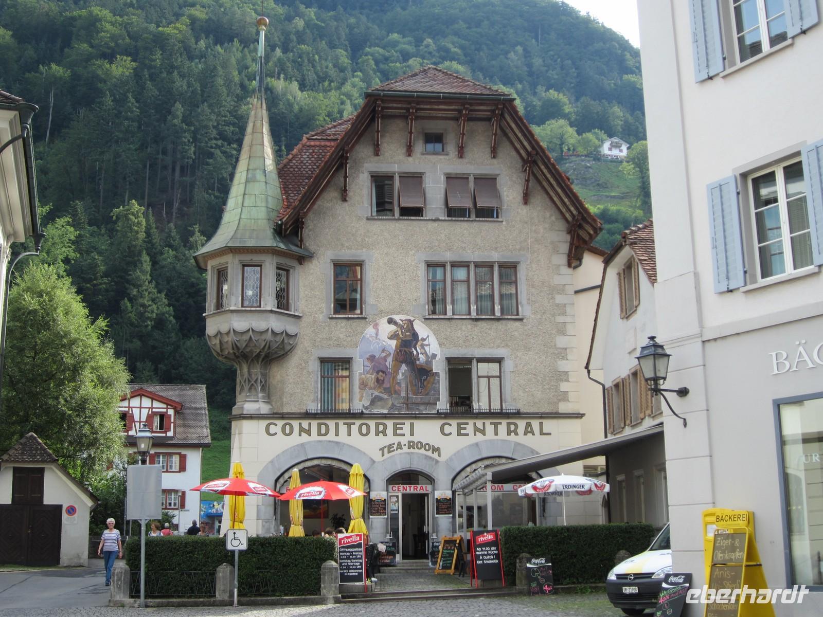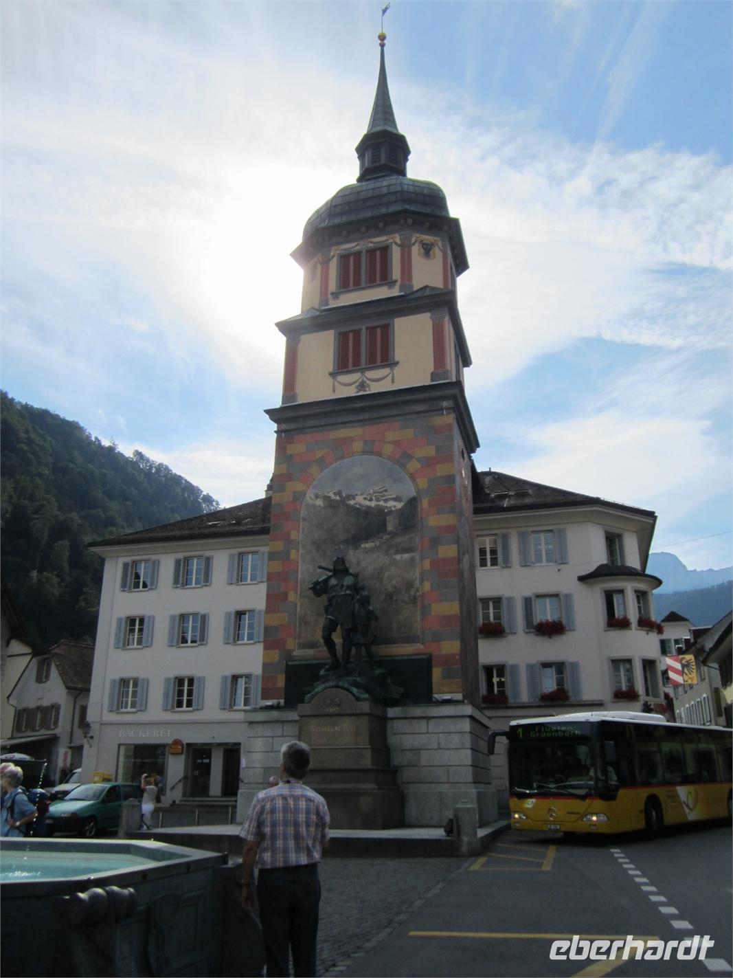Geografisch aber auch gefühlsmäßig liegt der See im Herzen der Schweiz. Er ist Schauplatz der Tell-Legende. Dazu gehört die Hohle Gasse in Küssnacht oder auch die Tellplatte. Wir halten auf den Weg nach Saas-Fee in Altdorf am Telldenkmal. In der kurzen Pause bleibt Zeit um sich im Ort etwas umzusehen. Dann geht es aber weiter entlang der Gotthardtstrecke nach Andermatt.
