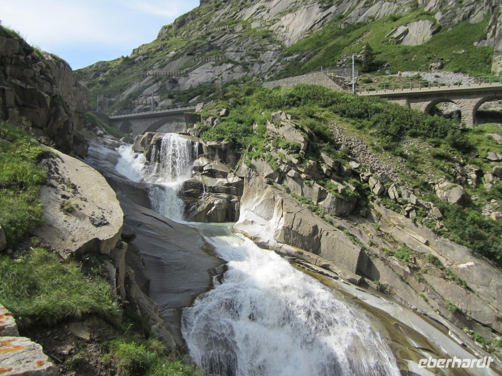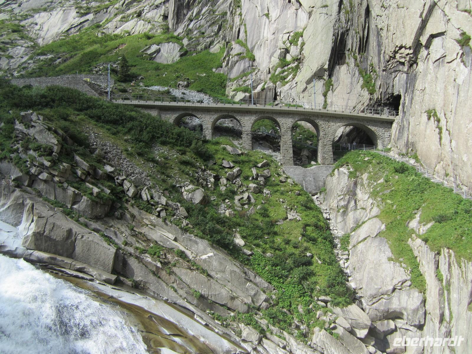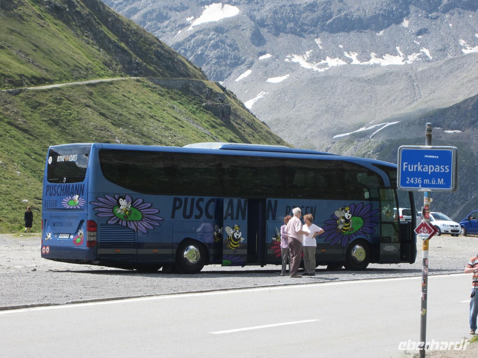 Bevor wir dort ankommen, halten wir an der 1956 eröffneten Teufelsbrücke an der wir den 30 m hohen Wasserfall der Reuss überqueren. Nach unserer Pause fahren wir durch Andermatt. Die Baukräne zeugen von der Investion des ägyptische Milliardär, Samih Sawiris, der ein unwirtliches Schweizer Alpental in ein luxuriöses Ferienresort umwandeln will. Nach Andermatt nehmen wir mit dem Bus Anlauf um den Furkapass (2431 m) zu erklimmen.