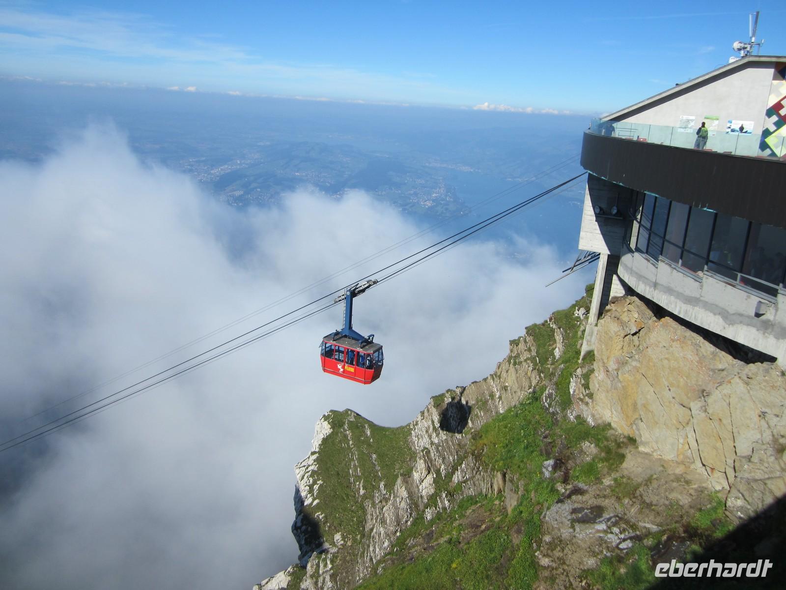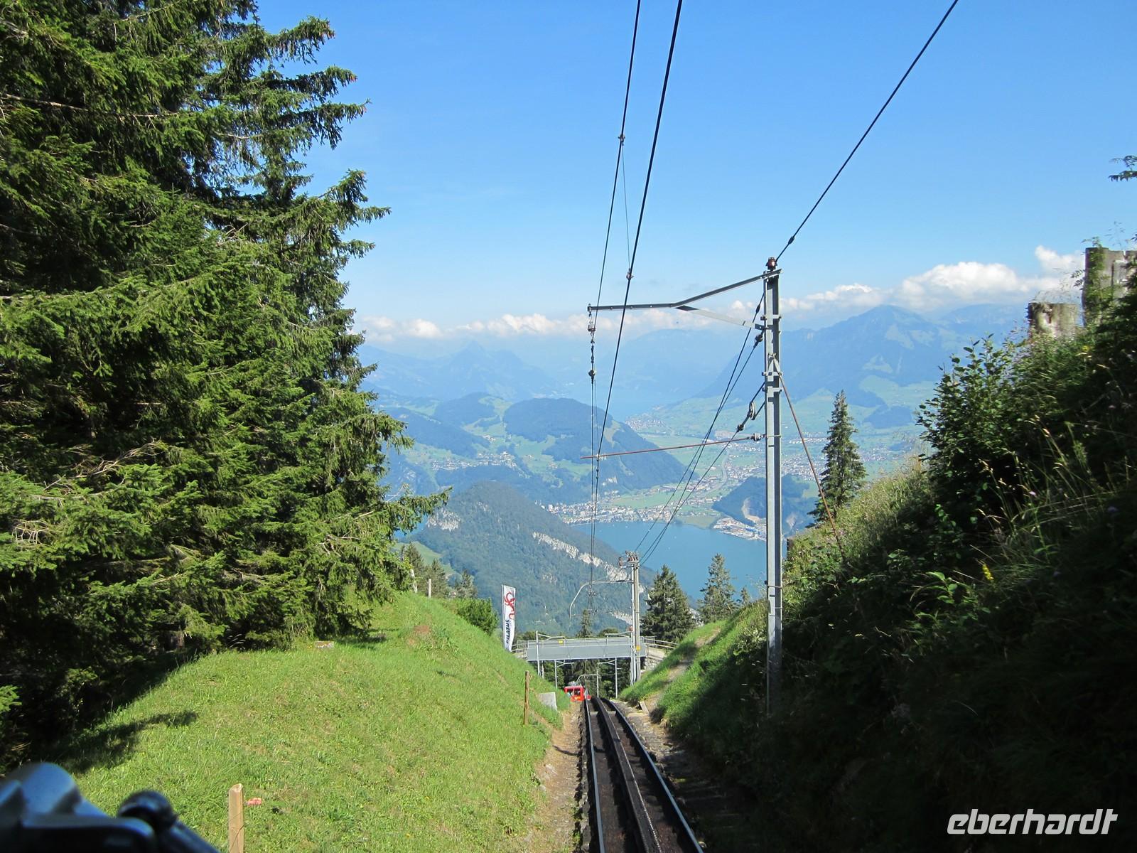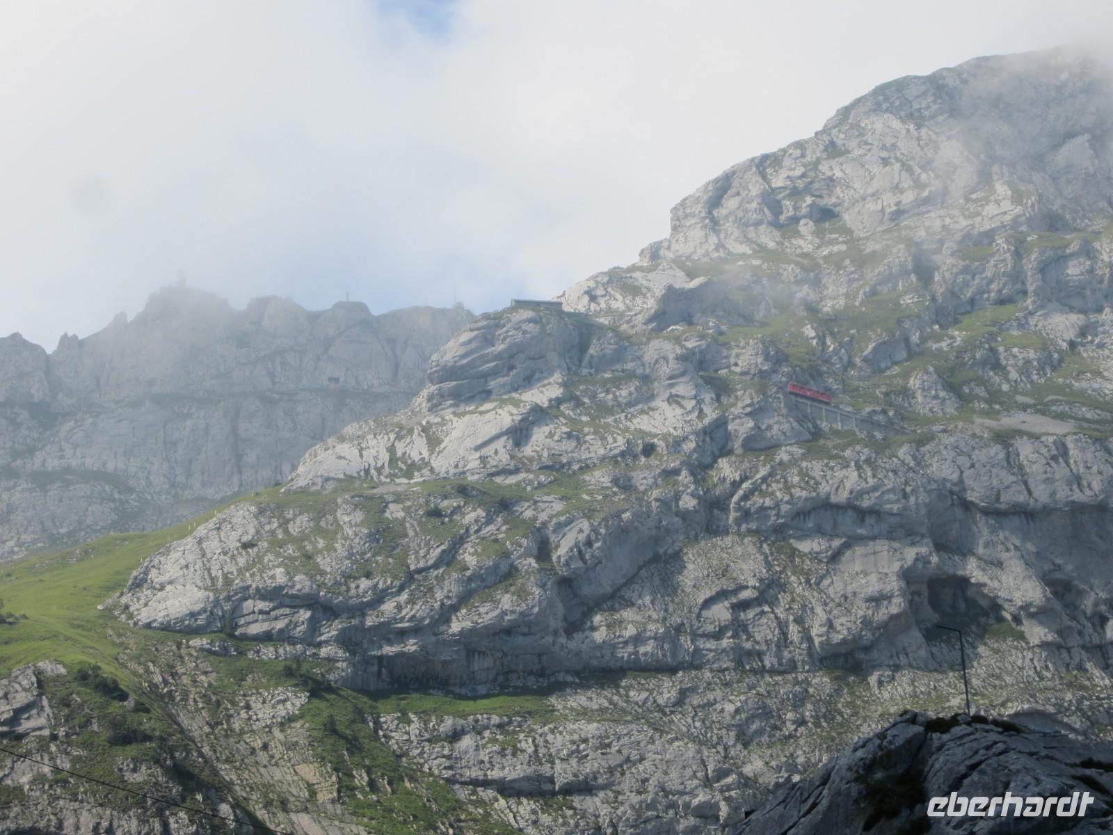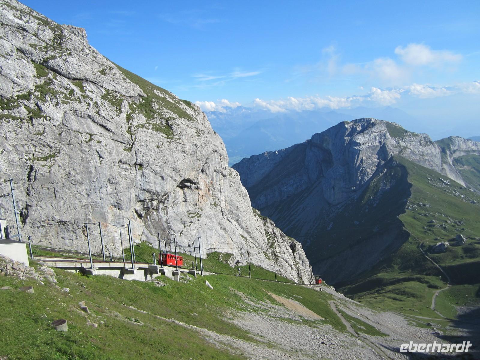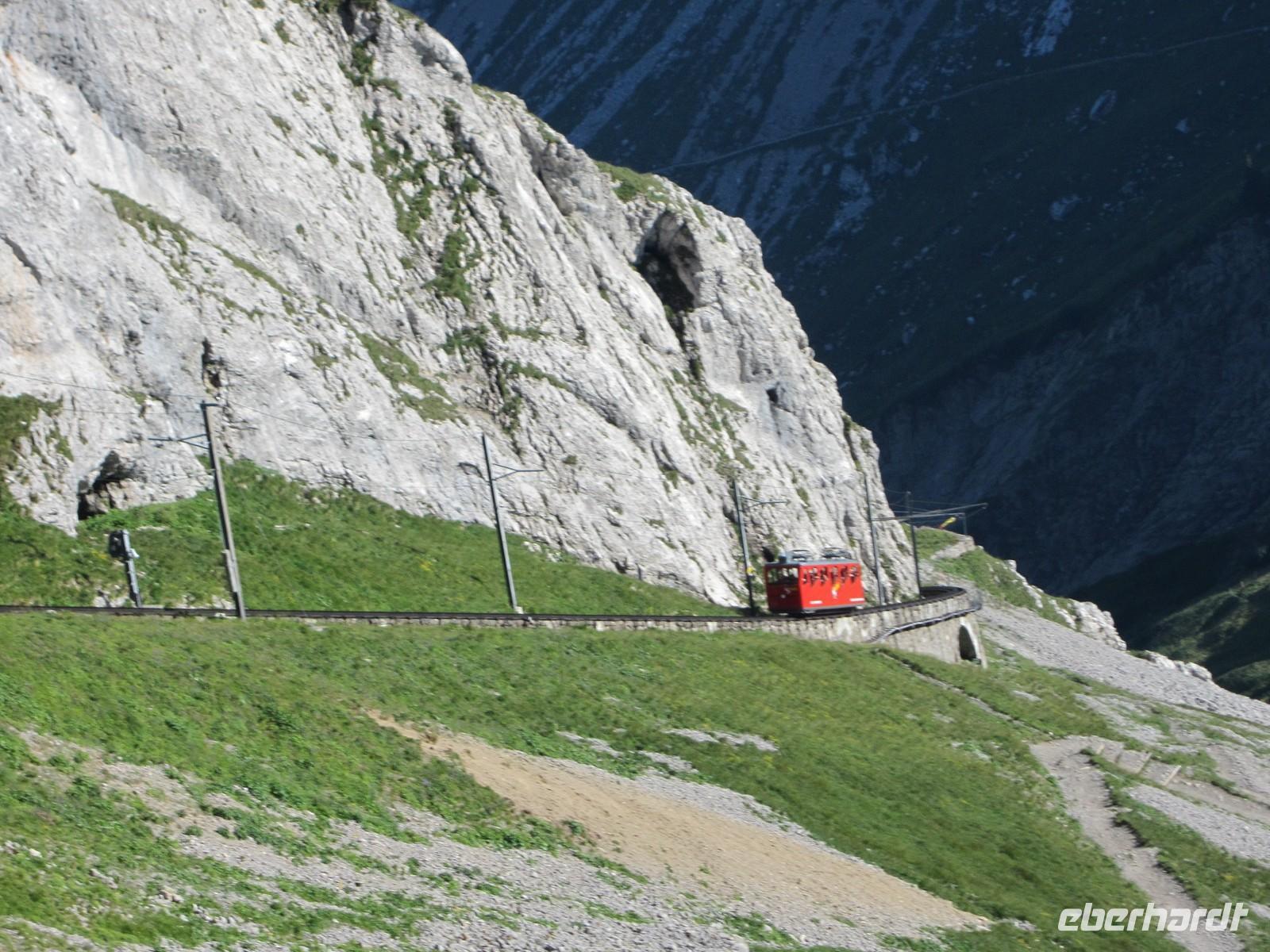 Nicht vergessen wird der Wunsch, Käse kaufen zu können. Alles erledigt, kommen wir gegen 14.30 Uhr in Alpnachstad an. Wir haben schönes Wetter und Ferien in der Schweiz. Viele Menschen stehen an der Bahnstation, der steilsten Zahnradbahn zum Pilatus. Wir sollen später fahren, schaffen es aber noch gegen 16.00 Uhr auf dem Pilatus zu sein. Die Fahrt dauert 30 min, dabei erleben wir eine Steigung bis 48%. Auf der 4,6 km langen Strecke sehen wir die unterschiedlichen Vegetationsstufen.