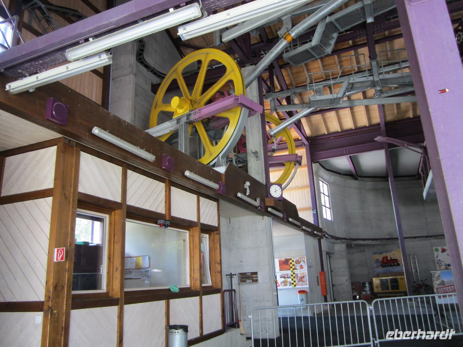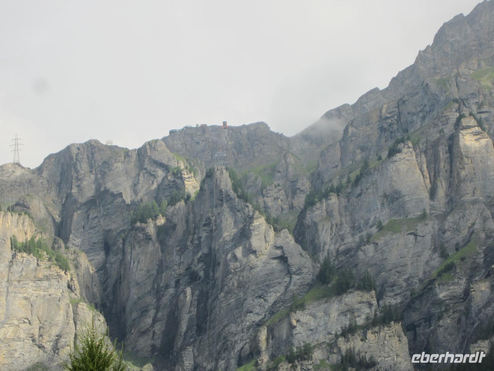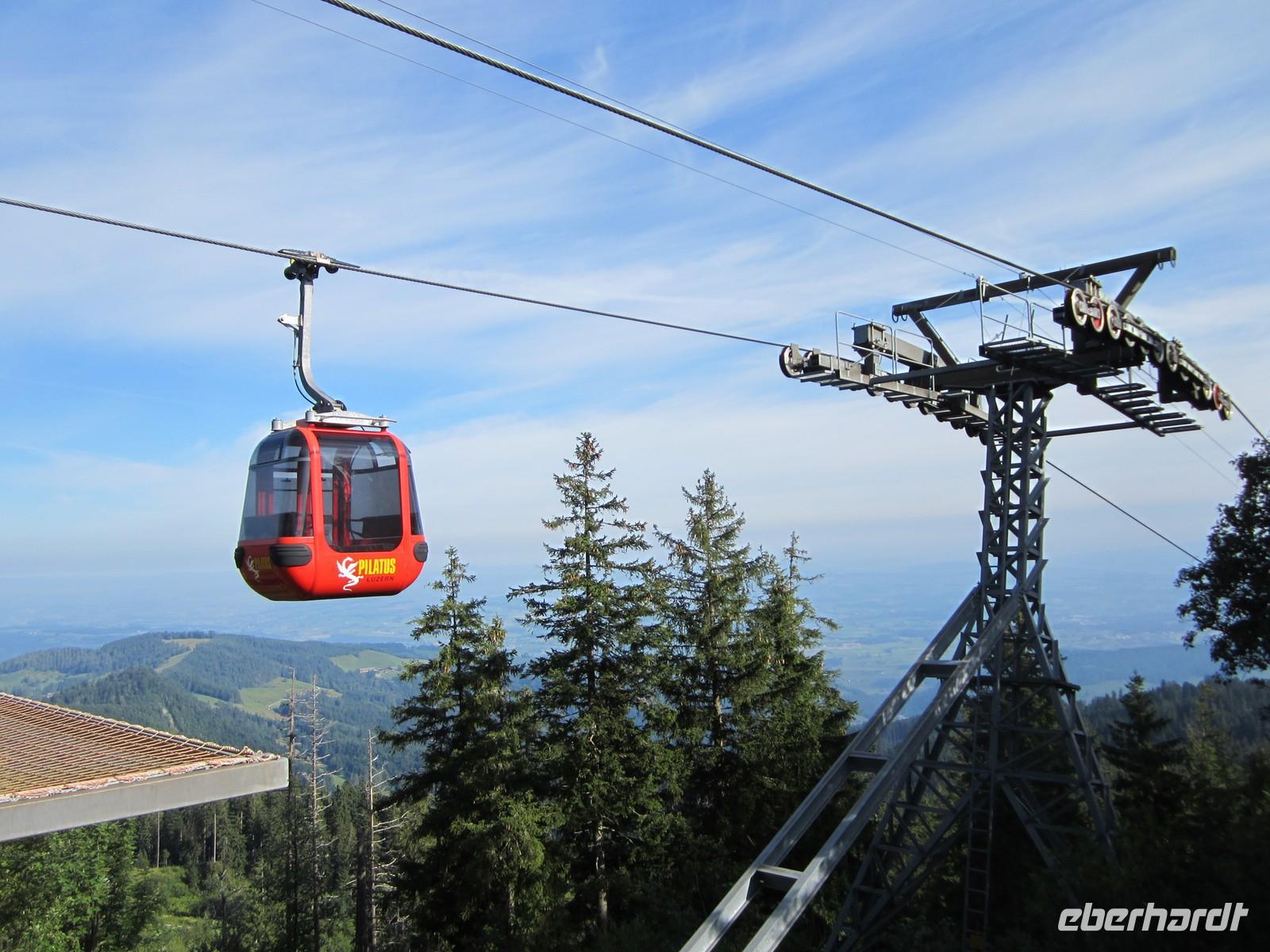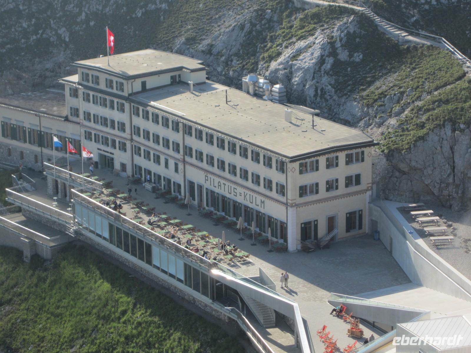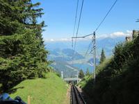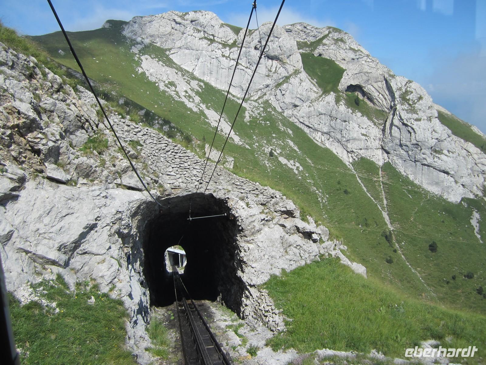 Nicht vergessen wird der Wunsch, Käse kaufen zu können. Alles erledigt, kommen wir gegen 14.30 Uhr in Alpnachstad an. Wir haben schönes Wetter und Ferien in der Schweiz. Viele Menschen stehen an der Bahnstation, der steilsten Zahnradbahn zum Pilatus. Wir sollen später fahren, schaffen es aber noch gegen 16.00 Uhr auf dem Pilatus zu sein. Die Fahrt dauert 30 min, dabei erleben wir eine Steigung bis 48%. Auf der 4,6 km langen Strecke sehen wir die unterschiedlichen Vegetationsstufen.