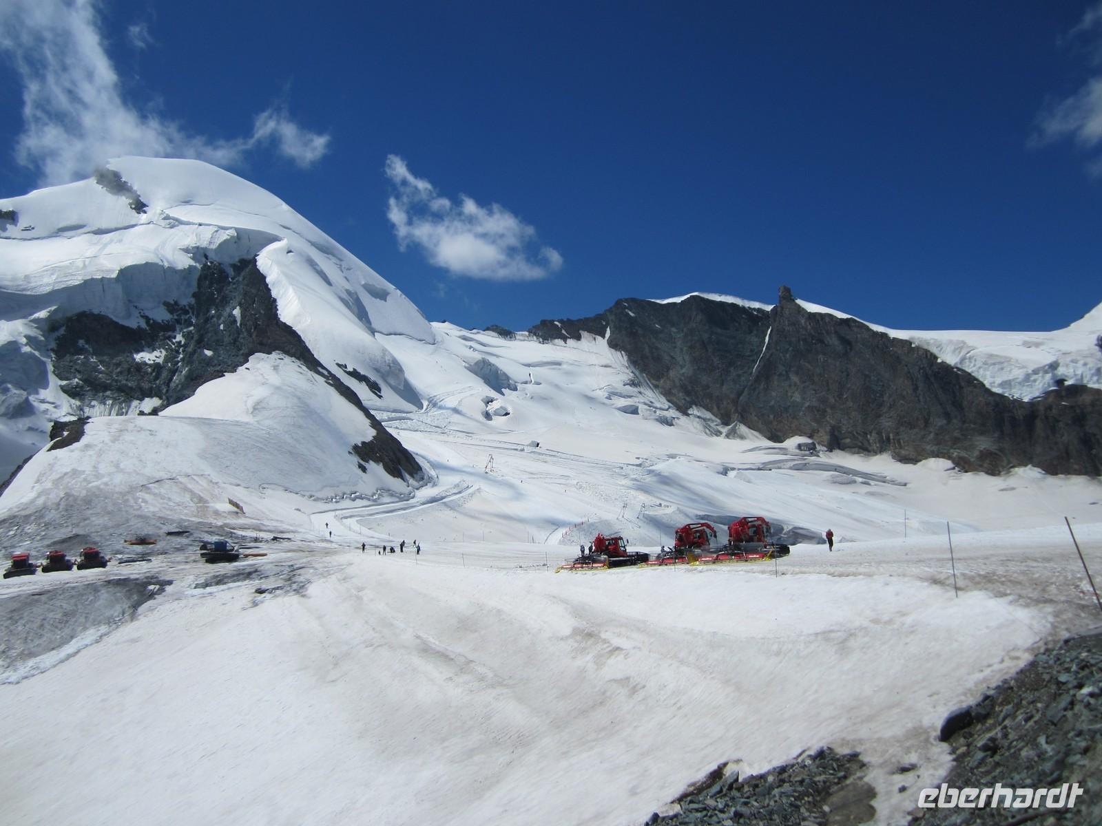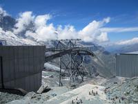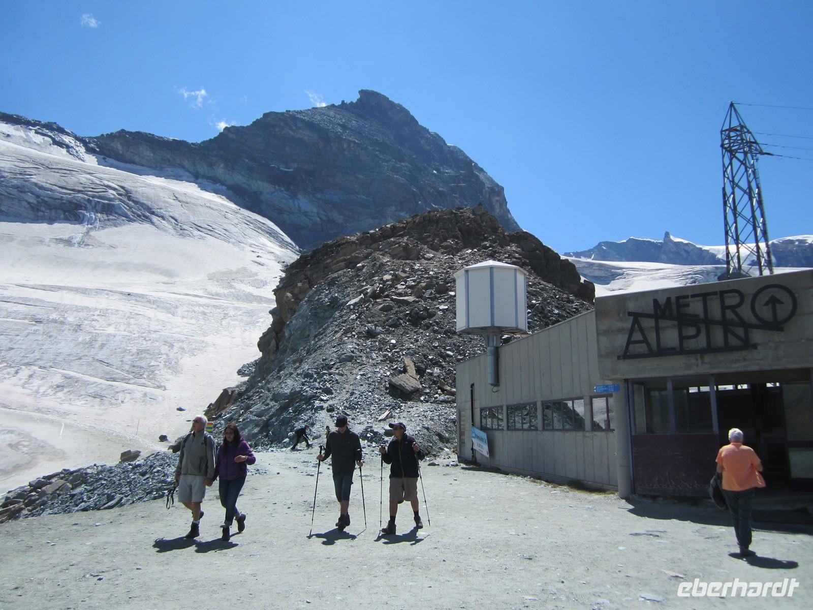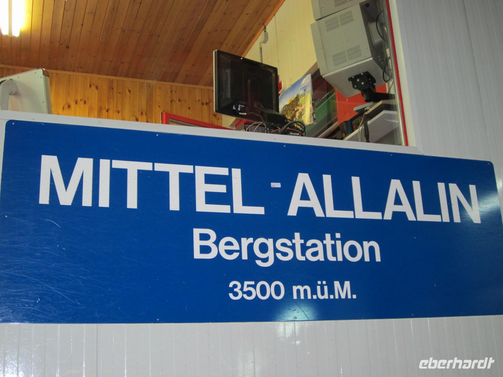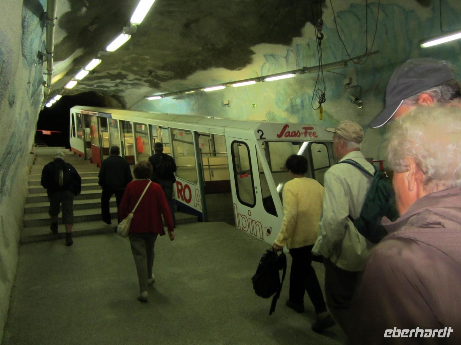 Nach dem Rundgang verbringen wir noch etwas Zeit im Ort. 12.00 Uhr treffen wir uns am Hotel und laufen zur Bergstation der Metro Alpin. Wir fahren zum Allalin. Bevor wir ankommen, steigen wir auf der Station Morenia und Felskinn um(Fahrzeit ca 15 min). Danach geht es weiter mit der höchst gelegenen U-Bahn (ca 5 min) zum Allalin und wir kommen bei schönstem Sonnenschein an. Es besteht die Möglichkeit den Eispavillon (weltweit größte) und das Drehrestaurant zu besuchen. Jeder bestimmt seine Zeit in 3500 m selbst. Eine kleine Gruppe fährt noch mit dem Bürgerpass zum Plattjen (2570). Hier sieht man nicht nur eine Gruppe Ziegen, sondern wir haben einen Blick auf Saas-Grund und den Mattmarkstausee.