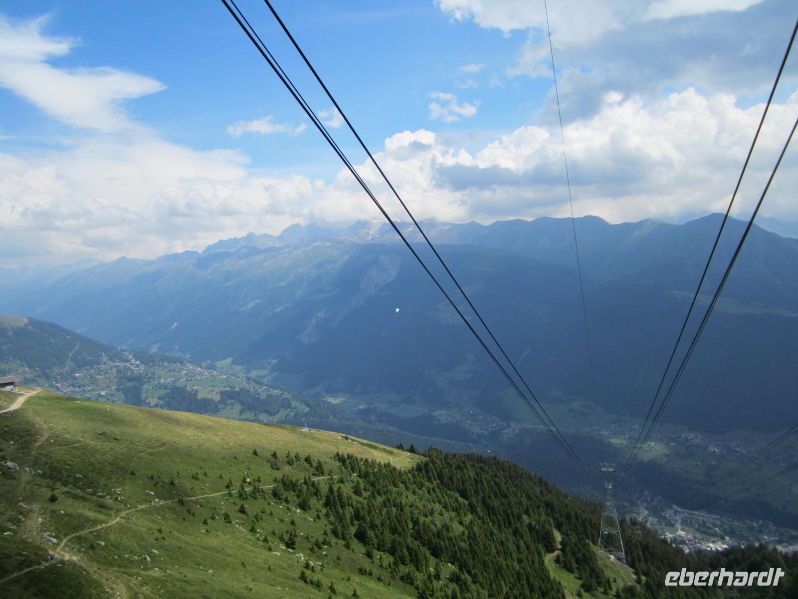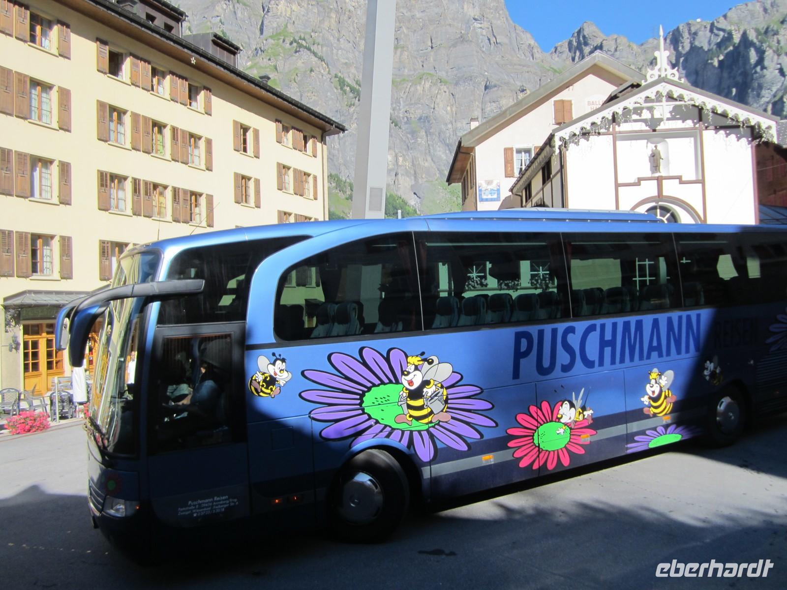 Von Täsch aus fahren wir wieder durch das Matter/Visper-Tal in das Rhone-Tal in die westliche Richtung nach Leukerbad. Die Fahrt zu dem 1411 m hohen Ort erweist sich als ein Erlebnis mit einem schönen Blick in das Rhonetal und wieder einmal zeigt sich die hervorragende Fahrweise von Sven Haase, unserem Fahrer.