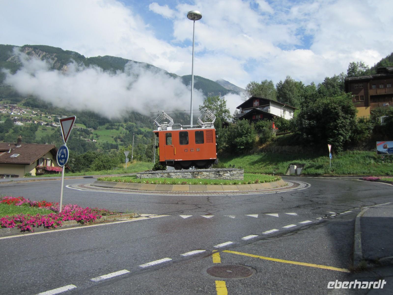 Aber wir müssen weiter. Mit einem Blick auf die Grimselstraße und dem Wissen, dass wir später noch den Grimselpass fahren werden, begeben wir uns in das Rhonetal. Eine Pause machen wir noch in Obwalden. Die Furka - Dampfbahn steht am Bahnhof und uns ist dieses Bild einen Fotostopp wert. Weiter geht unsere Fahrt ins Goms. Dabei durchqueren wir Münster. In dem Ort hat auch Goethe auf seinen Reisen verweilt und ist die Kirche St. Maria ist eine der schönsten im Kanton Wallis.