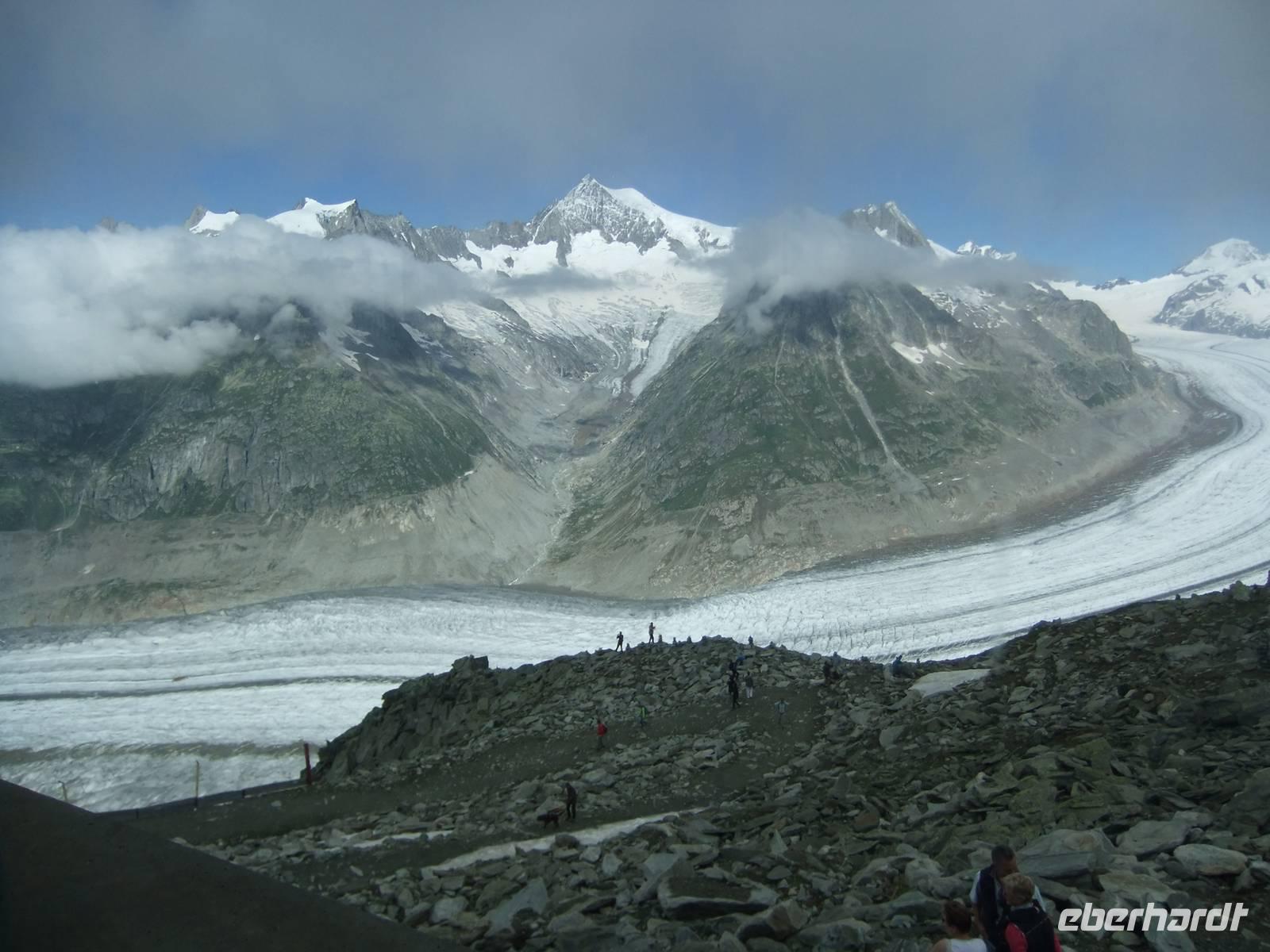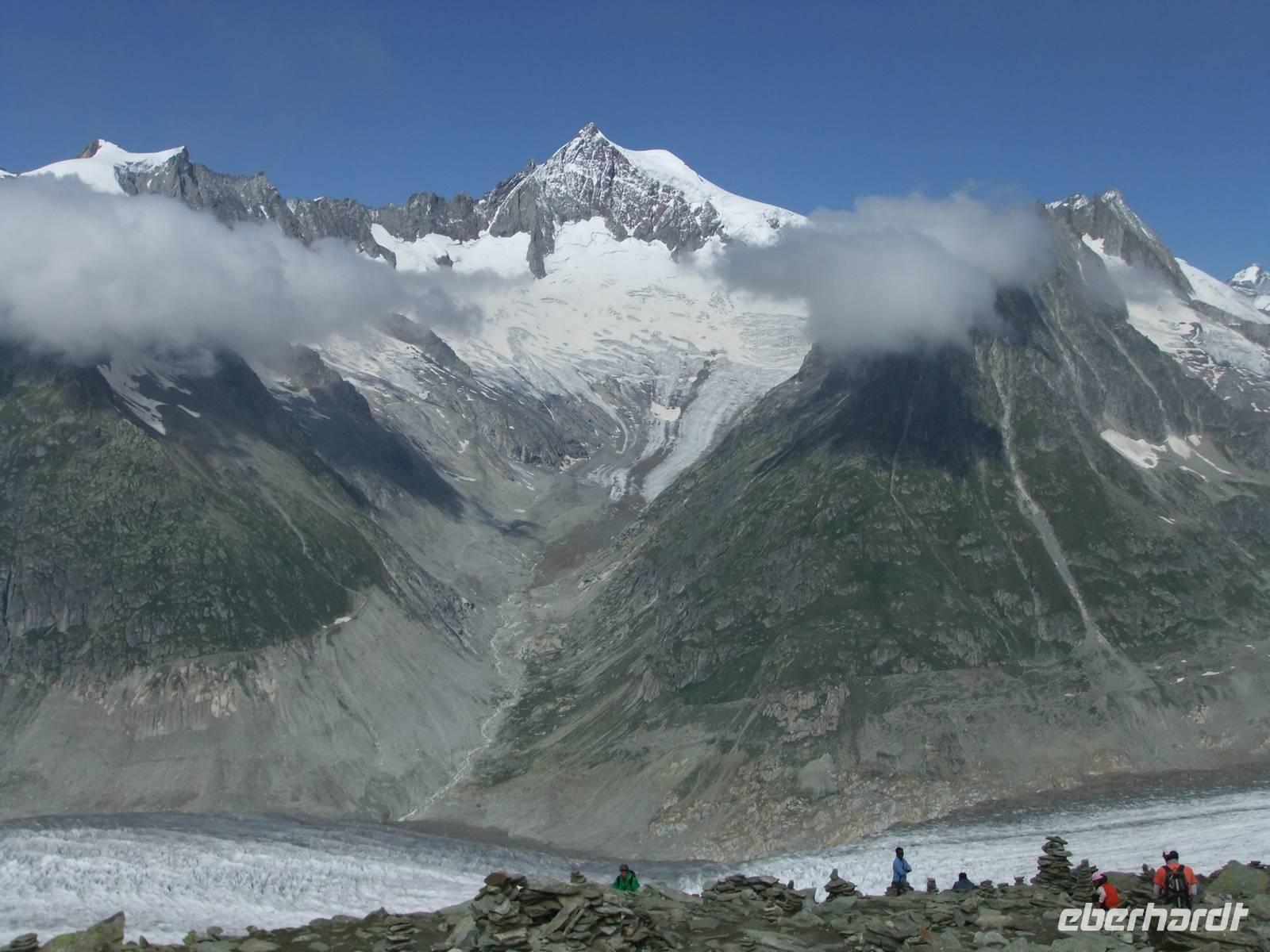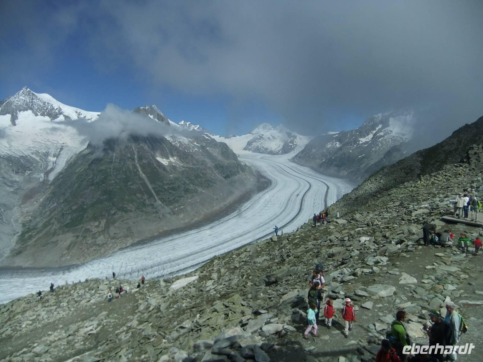 Nach zwei trüben und regnerischen Tagen freuen wir uns heute über den Sonnenschein, denn wir wollen wieder einen Berg „erklimmen“. Dazu bringt uns Gerald nach dem Frühstück hinunter ins Rhonetal. In Fiesch besteigen wir die große Kabinenbahn, die hinauf zum Fiescheralp fährt. Von hier geht es mit einer weiteren Seilbahn gleich weiter aufs Eggishorn. Hier bietet sich uns ein wunderbarer Blick auf den Großen Aletschgletscher. Wieder auf der Fiescheralp angekommen, werden die Gäste mit einem landestypischen Mittagessen im Restaurant „Kühboden Alpenlodge“ überrascht. Wie echte Schweizer essen wir die Älplermagronen - ein Gericht aus Nudeln und Kartoffeln - mit Apfelmus. Es bleibt noch Zeit für einen kleinen Spaziergang auf der Alp, der mit freier Sicht zum Matterhorn belohnt wird. Dann geht es hinunter nach Fiesch und mit dem Bus nach Brig, wo wir uns den Stockalperpalast anschauen und durch den Ort bummeln. Ein letztes Mal fahren wir nun nach Saas-Fee zurück, lassen uns kulinarisch wieder beim Abendessen verwöhnen, unternehmen einen Abschiedsspaziergang durch den Ort und packen die Koffer für unsere morgige Weiterreise.