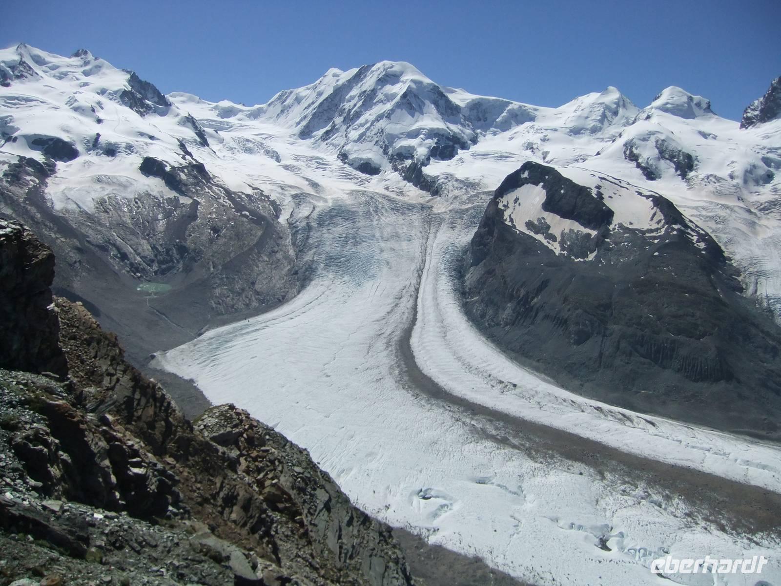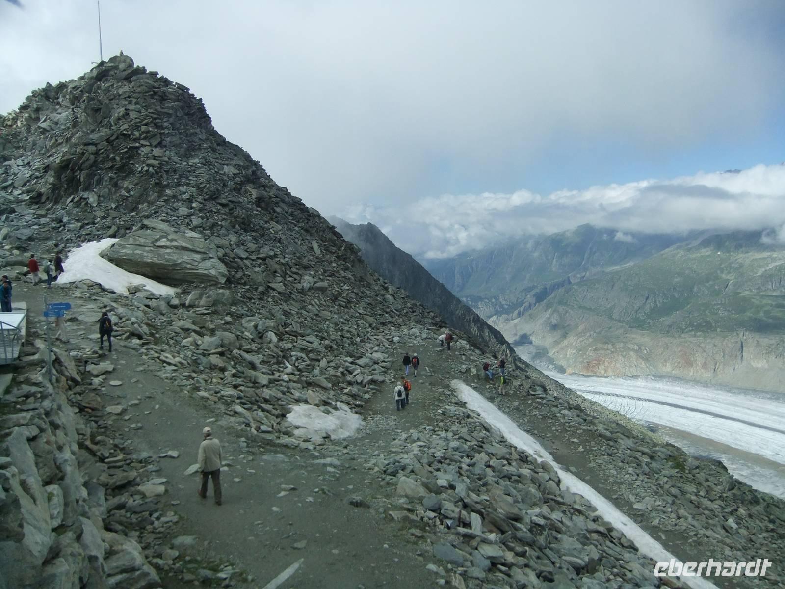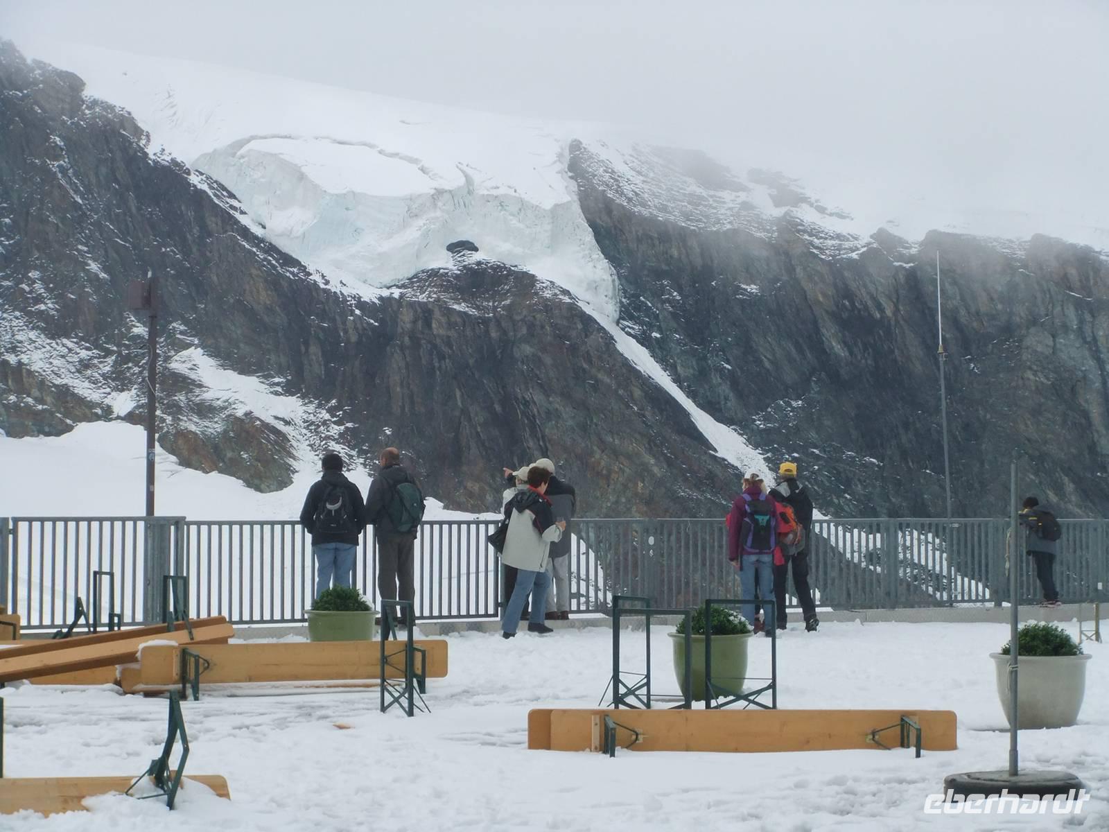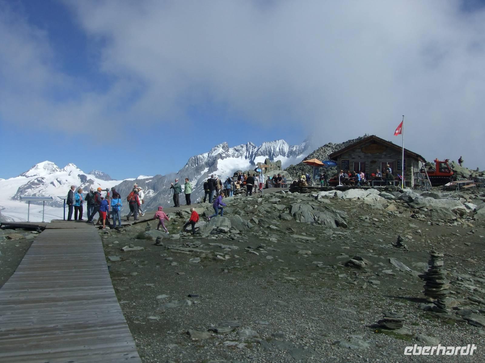 Nach zwei trüben und regnerischen Tagen freuen wir uns heute über den Sonnenschein, denn wir wollen wieder einen Berg „erklimmen“. Dazu bringt uns Gerald nach dem Frühstück hinunter ins Rhonetal. In Fiesch besteigen wir die große Kabinenbahn, die hinauf zum Fiescheralp fährt. Von hier geht es mit einer weiteren Seilbahn gleich weiter aufs Eggishorn. Hier bietet sich uns ein wunderbarer Blick auf den Großen Aletschgletscher. Wieder auf der Fiescheralp angekommen, werden die Gäste mit einem landestypischen Mittagessen im Restaurant „Kühboden Alpenlodge“ überrascht. Wie echte Schweizer essen wir die Älplermagronen - ein Gericht aus Nudeln und Kartoffeln - mit Apfelmus. Es bleibt noch Zeit für einen kleinen Spaziergang auf der Alp, der mit freier Sicht zum Matterhorn belohnt wird. Dann geht es hinunter nach Fiesch und mit dem Bus nach Brig, wo wir uns den Stockalperpalast anschauen und durch den Ort bummeln. Ein letztes Mal fahren wir nun nach Saas-Fee zurück, lassen uns kulinarisch wieder beim Abendessen verwöhnen, unternehmen einen Abschiedsspaziergang durch den Ort und packen die Koffer für unsere morgige Weiterreise.