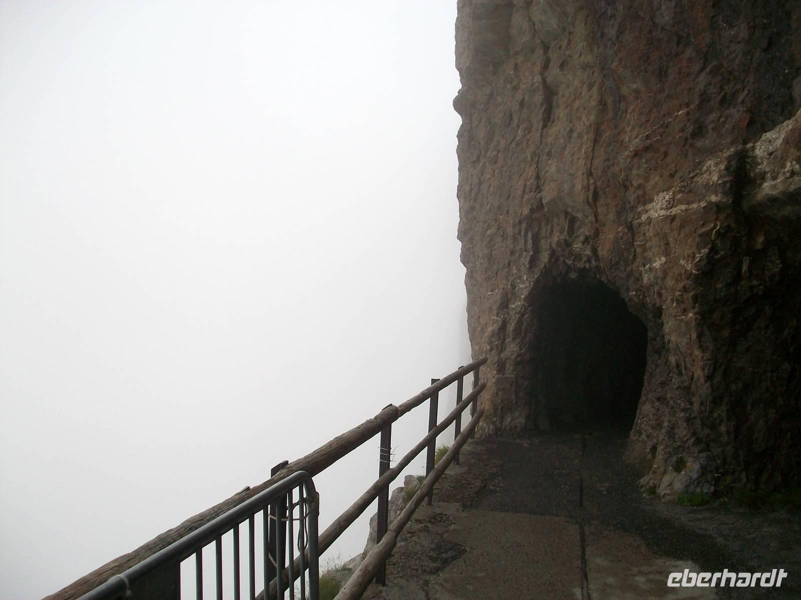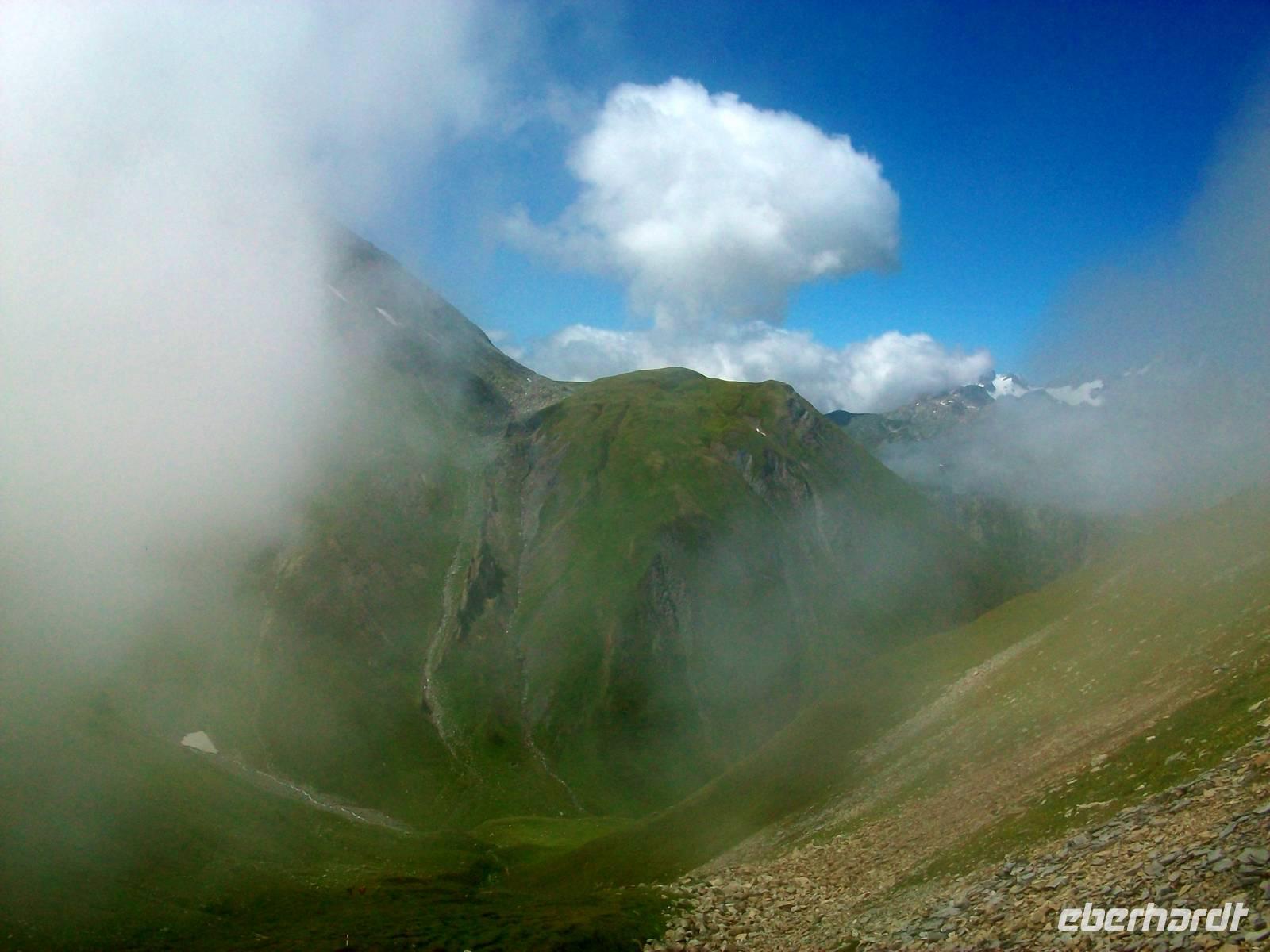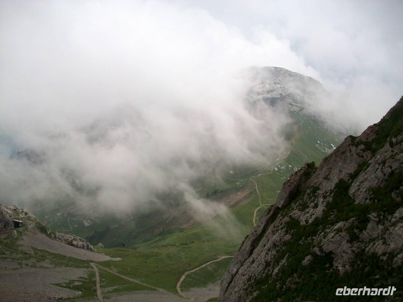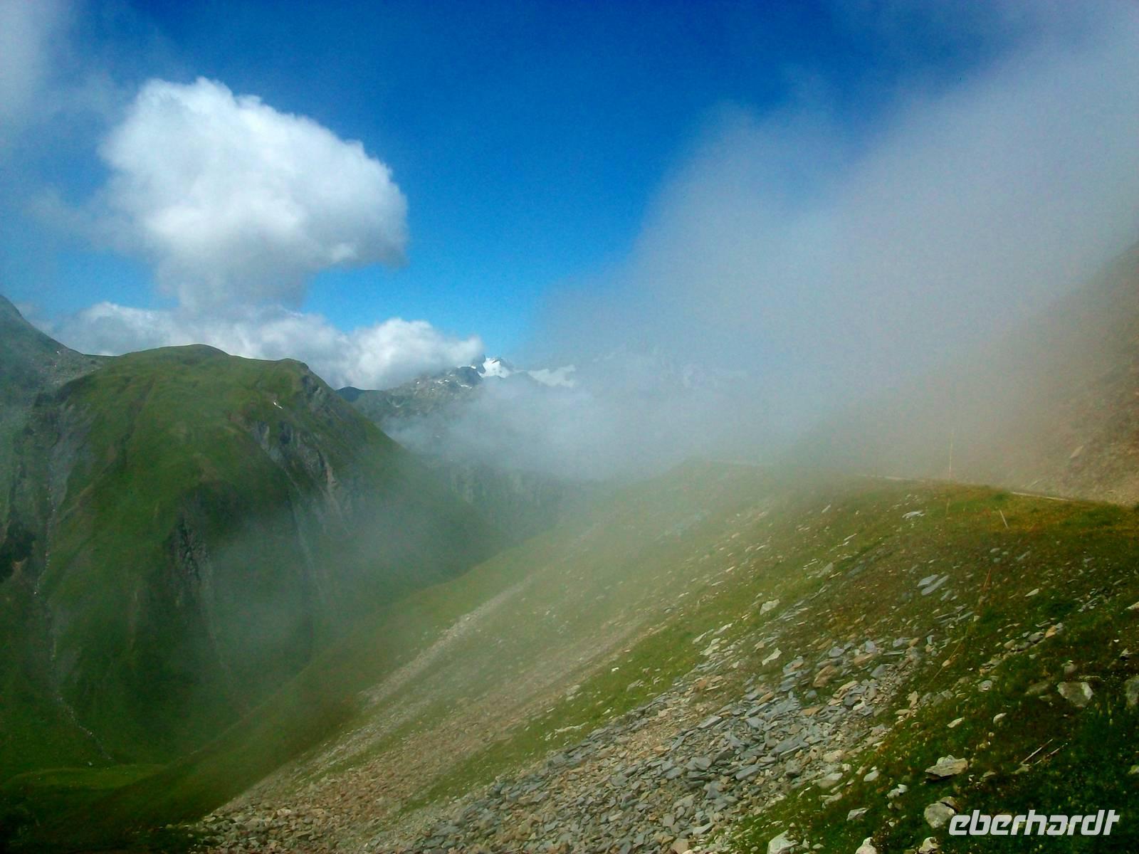 Doch die Wolkenschwaden ziehen in Windeseile die Bergflanke hinauf und lassen die Sicht in sekundenschnelle wechseln, allein der Blick zu Tal bleibt uns verwehrt, schade.