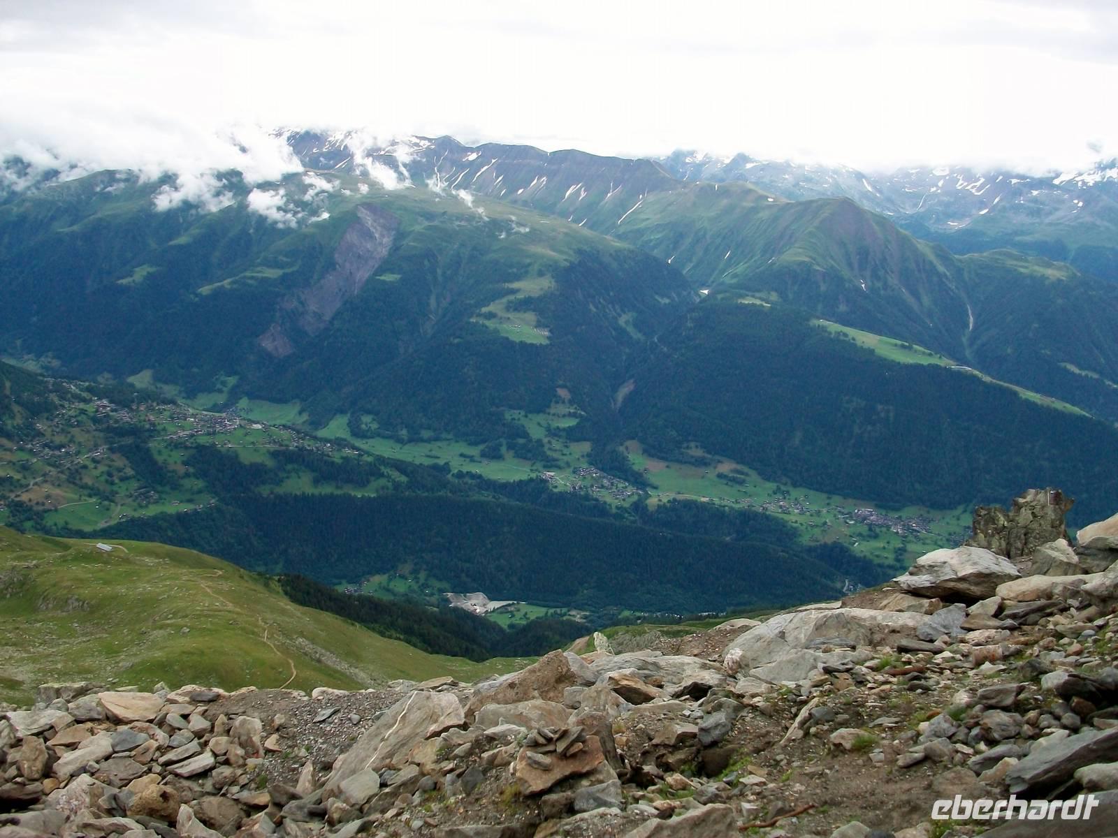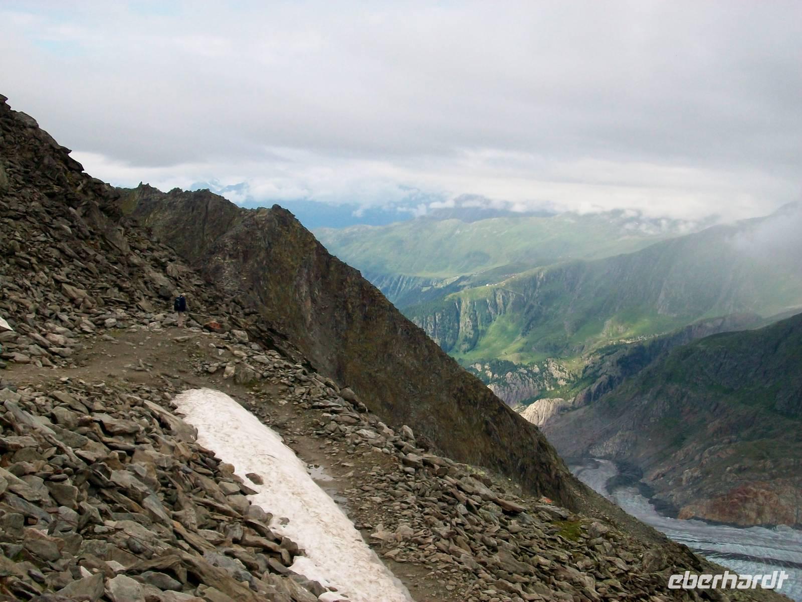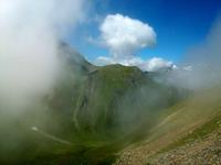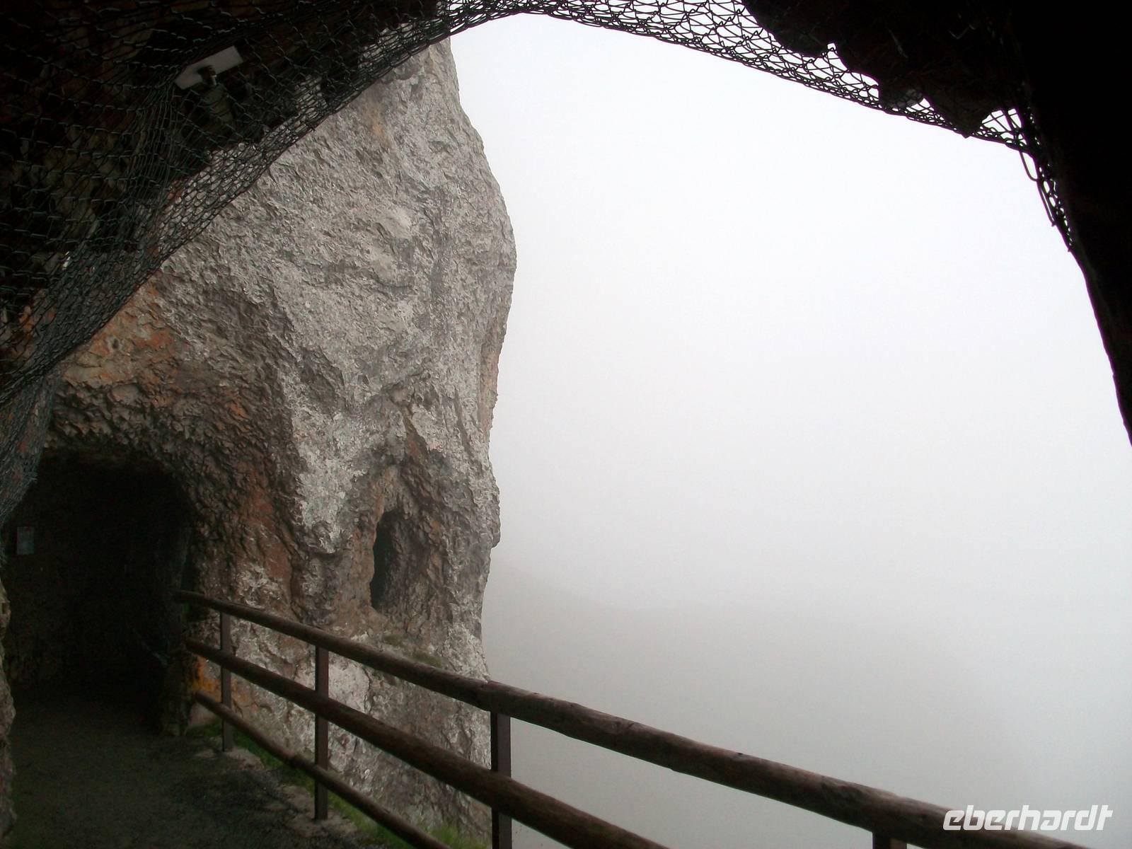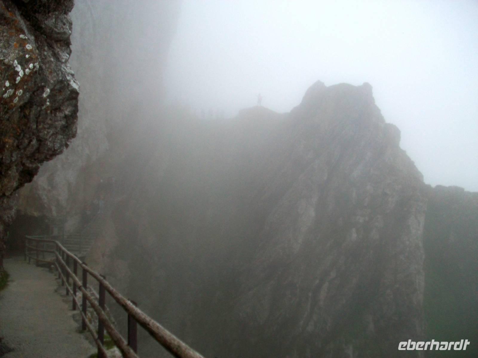 Doch die Wolkenschwaden ziehen in Windeseile die Bergflanke hinauf und lassen die Sicht in sekundenschnelle wechseln, allein der Blick zu Tal bleibt uns verwehrt, schade.