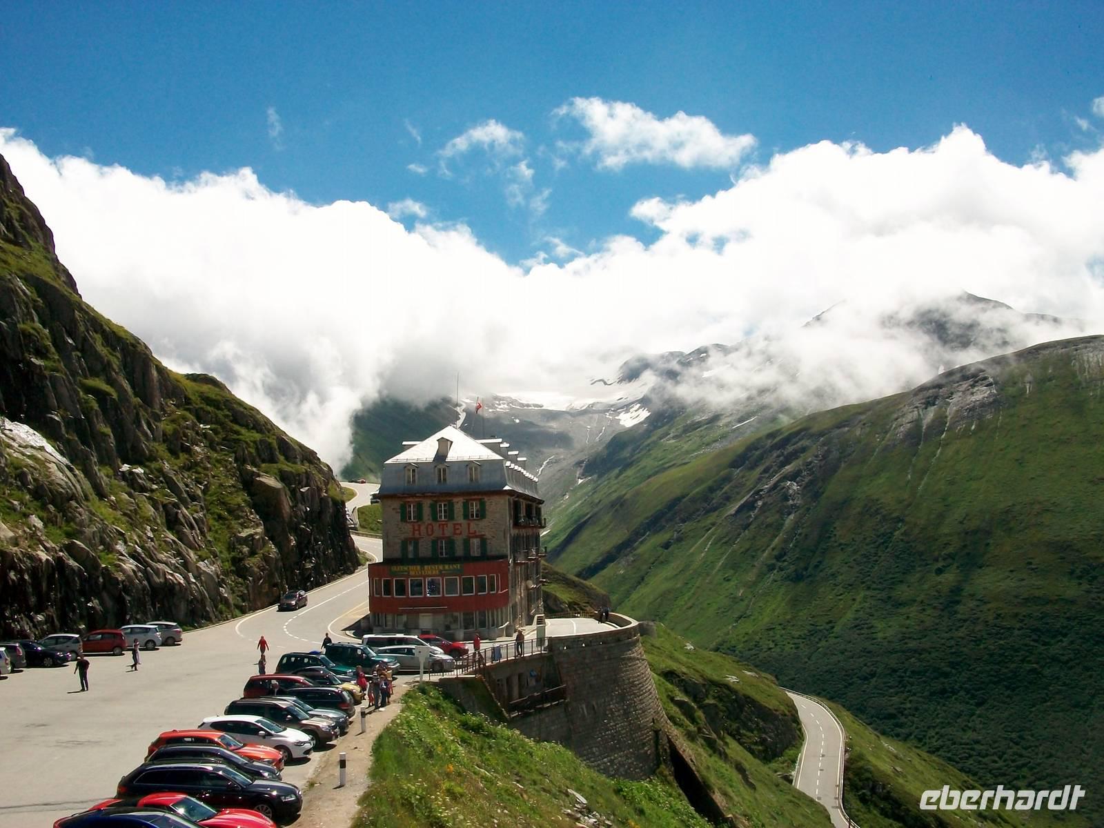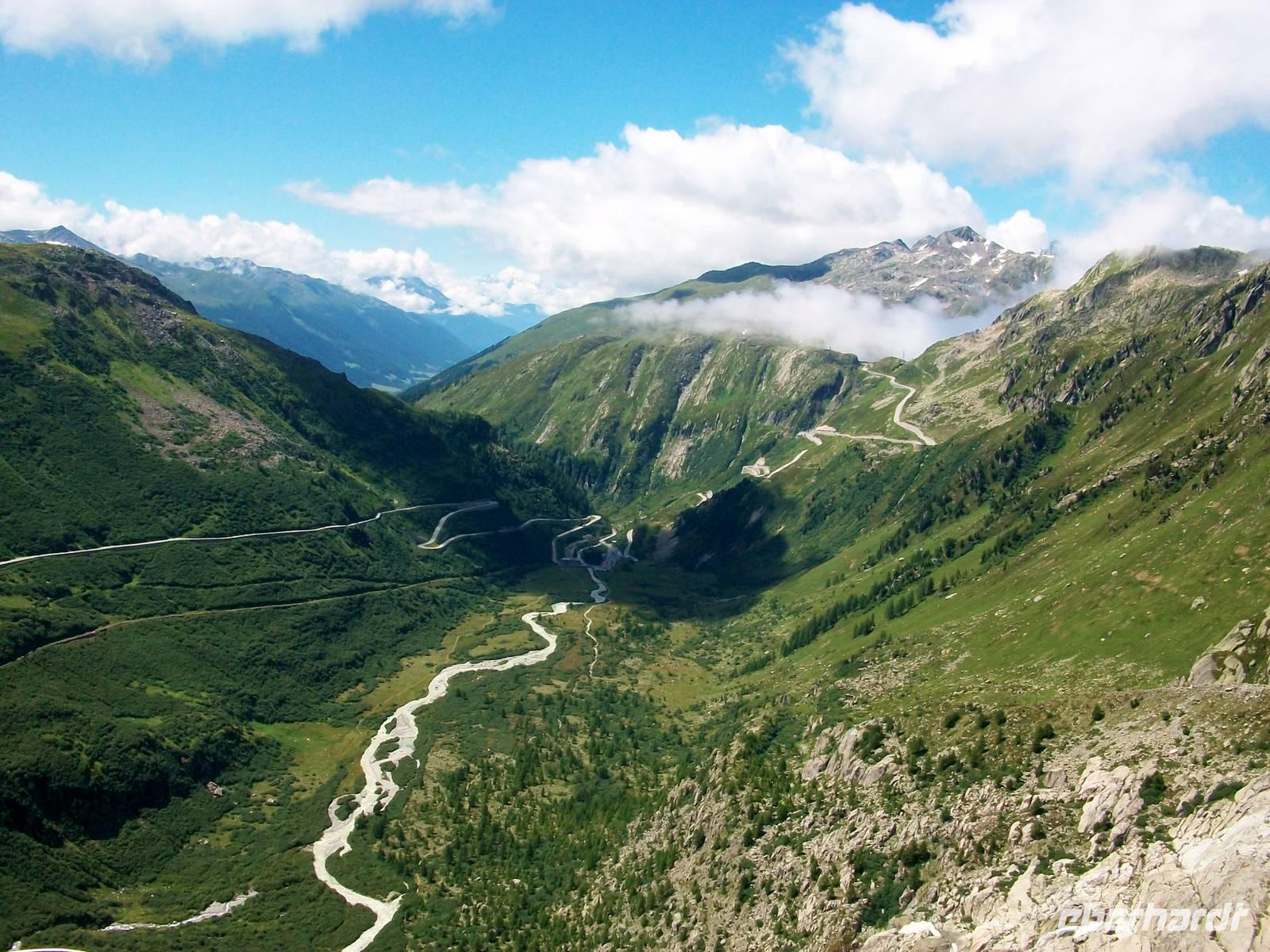 Zunächst führt uns die Straße hinauf durch eine schmale Schlucht, es ist die Schöllenenschlucht mit der Teufelsbrücke. Leider kommen gerade jetzt Wolkenschwaden hereingezogen und verwehren uns den Blick. Dennoch ist es eine interessante Fahrt; bald verbreitert sich das Tal und oben bei Andermatt angelangt, sind wir wenig später im Urserental unterwegs. Hier bescheint die Sonne die grünen Wiesen und die Berge die vom Tal ansteigen, wahrhaft romantisch!