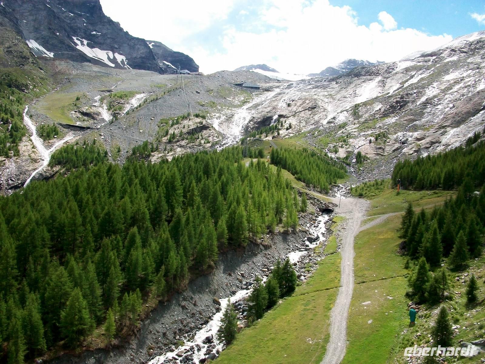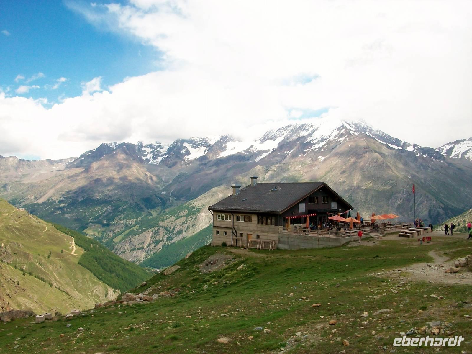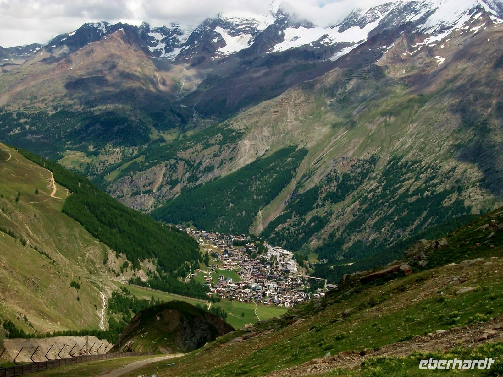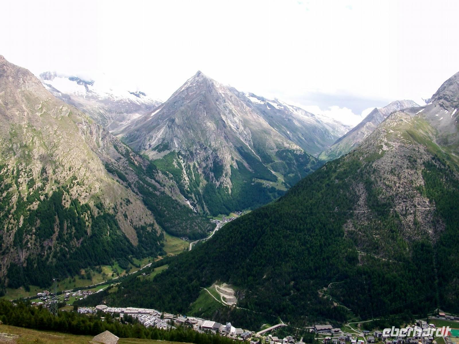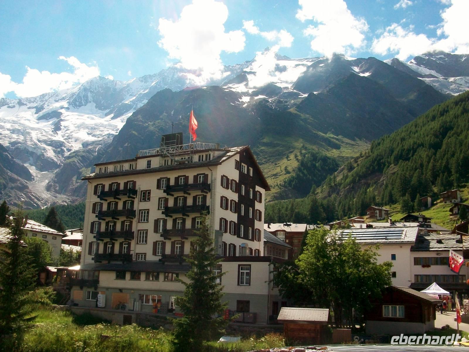 Weiter führt uns der Weg hinunter ins Goms, es ist die liebliche Landschaft der oberen Rhone; wir durchfahren gepflegte Ortschaften mit den alten wettergegerbten Holzhäusern und ab hier werden wir von der Sonne richtig verwöhnt- es ist ein wunderschöner Sommertag mit angenehm warmen Temperaturen. Die Unbill von gestern ist längst vergessen als wir nach einem Aufstieg in Saas Fee anlangen. Kurz vor dem Ort öffnet sich das grandiose Bergpanorama, diese beschauliche Siedlung liegt inmitten einer gigantischen Bergwelt wie von einem natürliches Amphitheater umgeben.