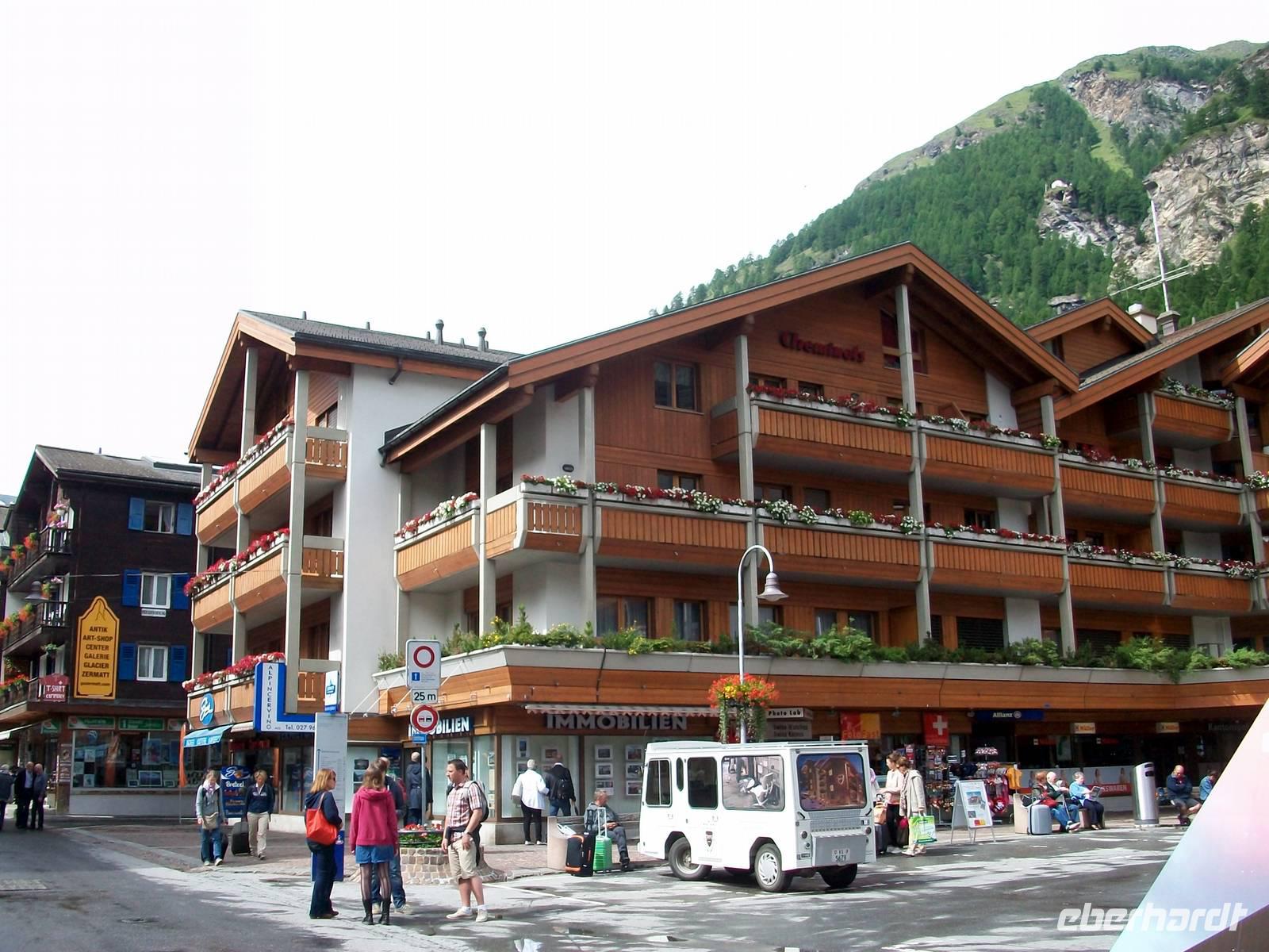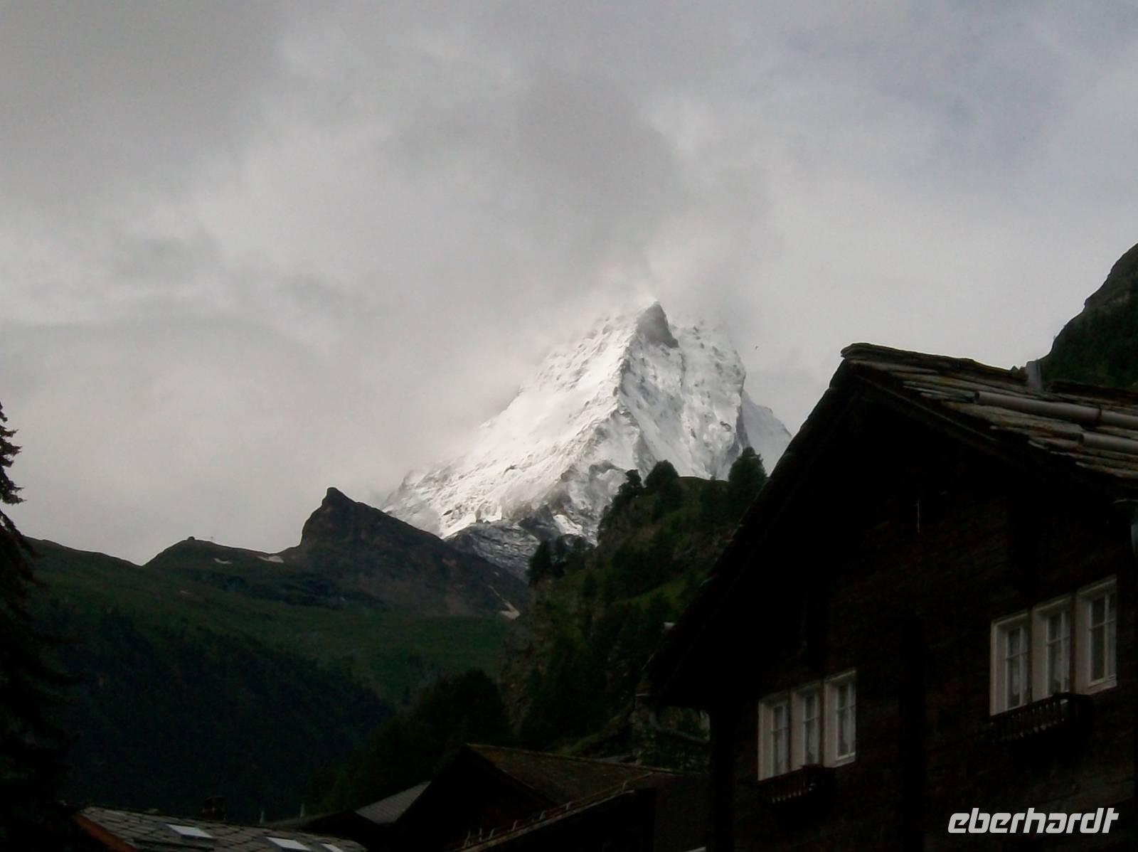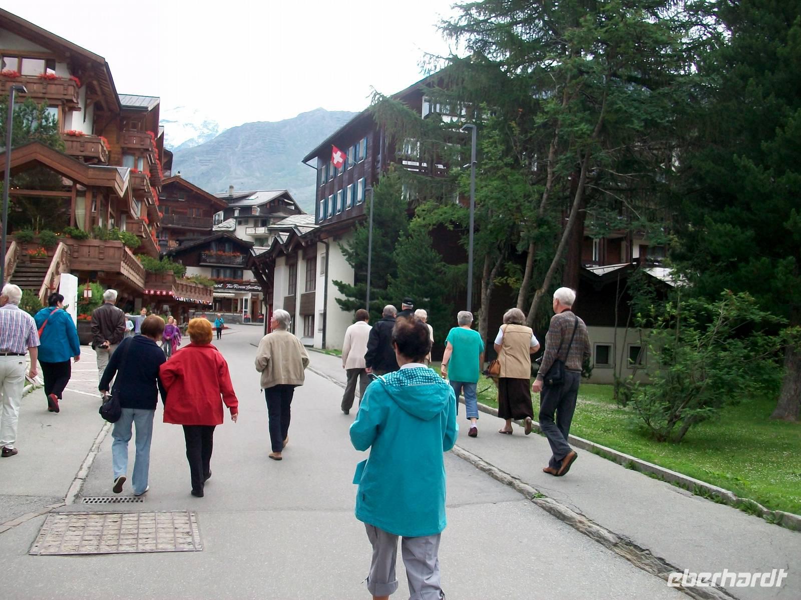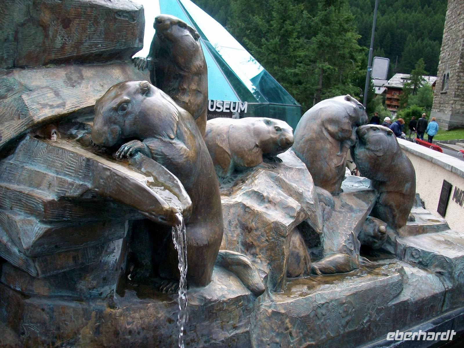 Wir unternehmen einen kleinen Bummel durch Zermatt, sehen die uralten Holzhäuser, gelangen dabei über die mondäne Bahnhofstraße und stehen bald im Zentrum des Ortes am Murmeltierbrunnen. Dieses Kunstwerk ist sehr possierlich gestaltet, von hier hat man einen schönen Blick auf die Mauritiuskirche, die noblen Hotels und das quirlige Leben der Besucher aus allen Kontinenten dieser Welt. Nun hat sich auch kurz ein Teil des Matterhorns gezeigt, schnell werden Fotos geschossen denn bald verbirgt sich dieser grandiosen Berg wieder vor unseren Blicken.