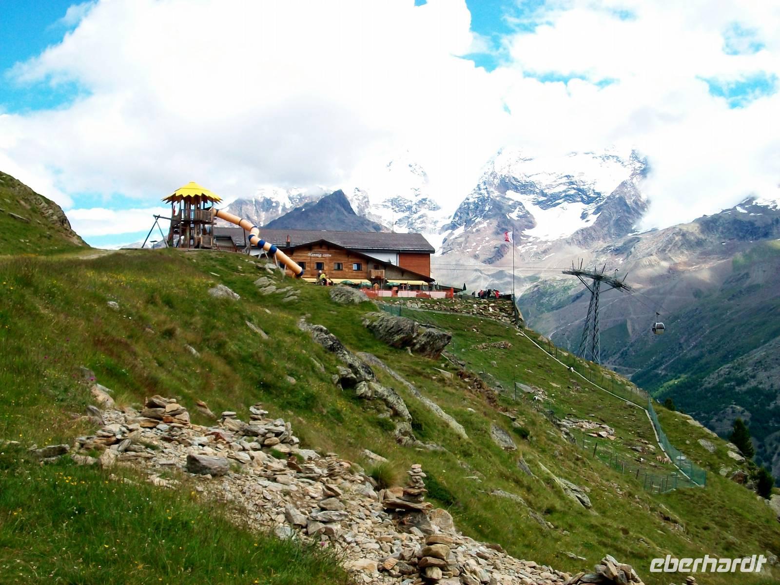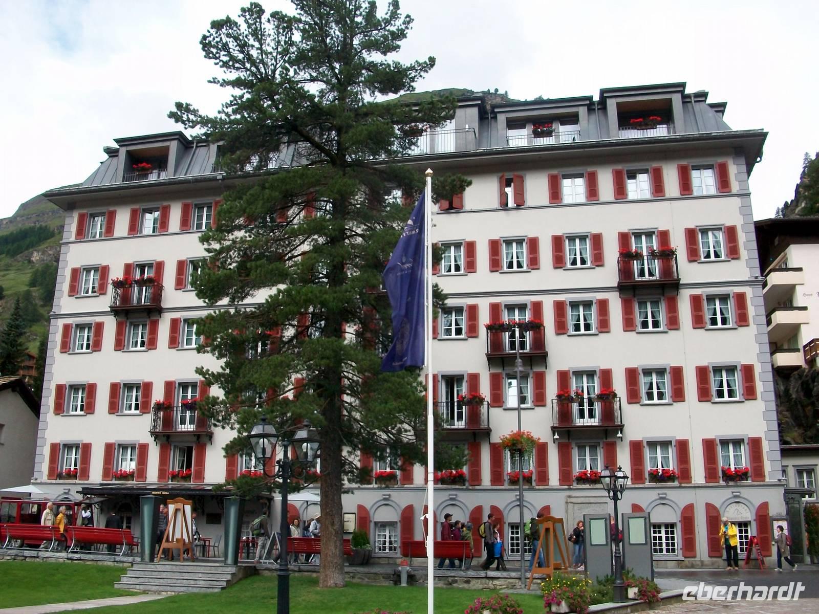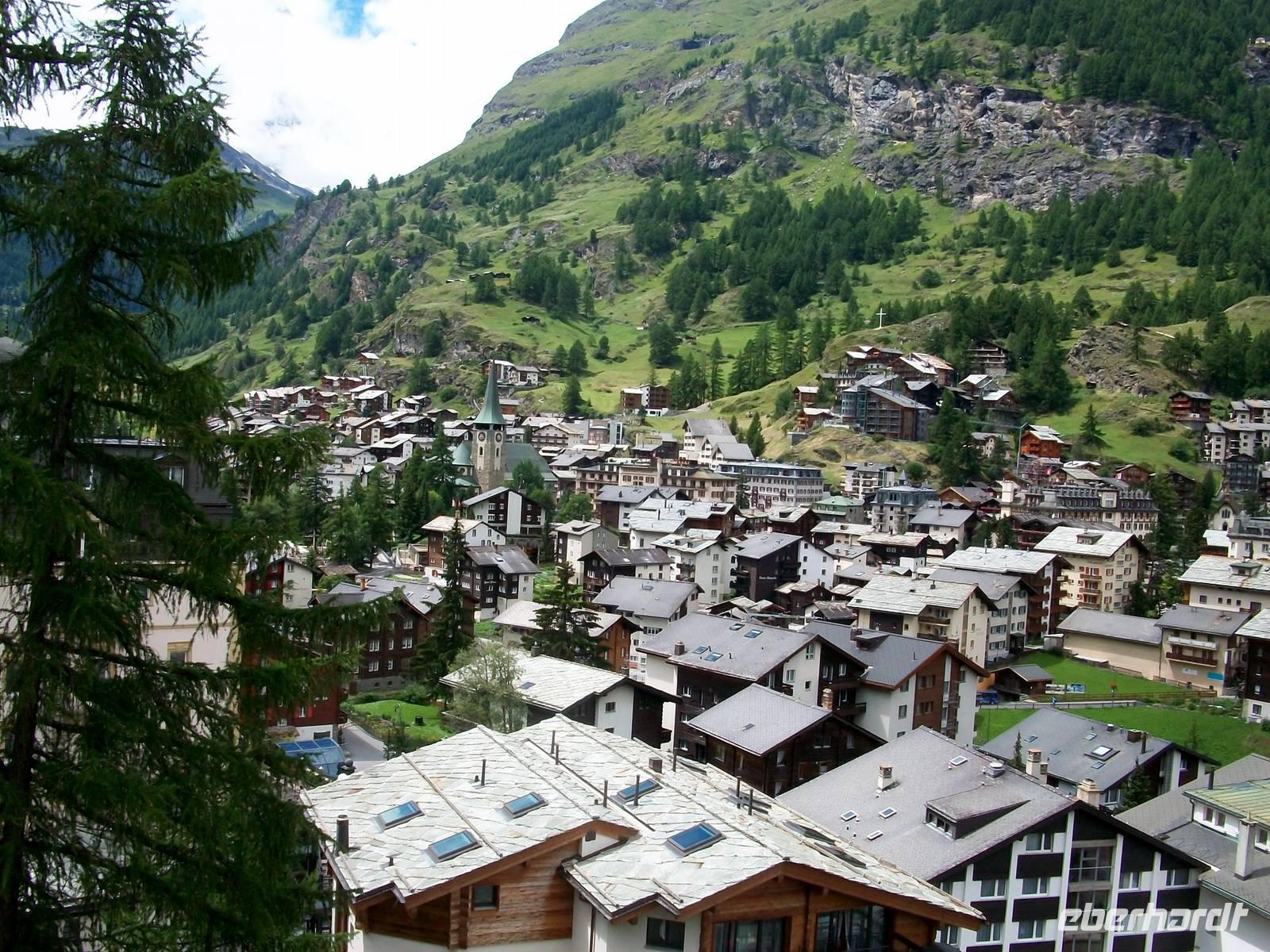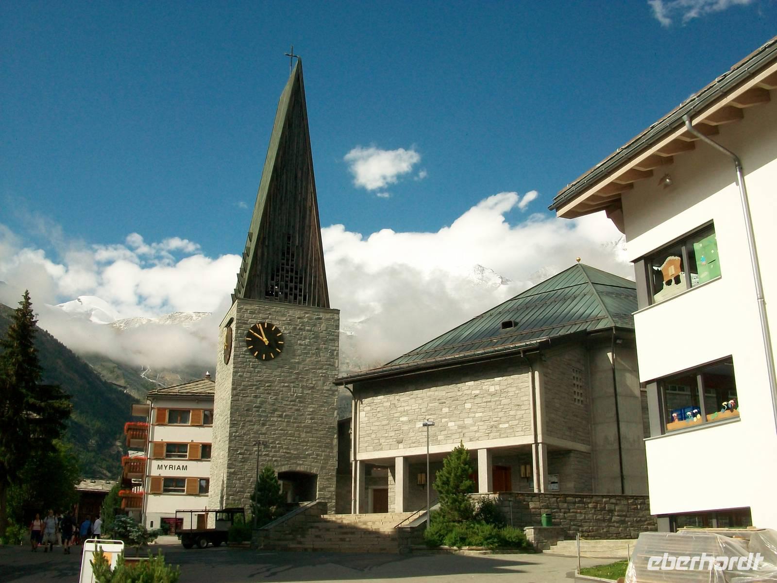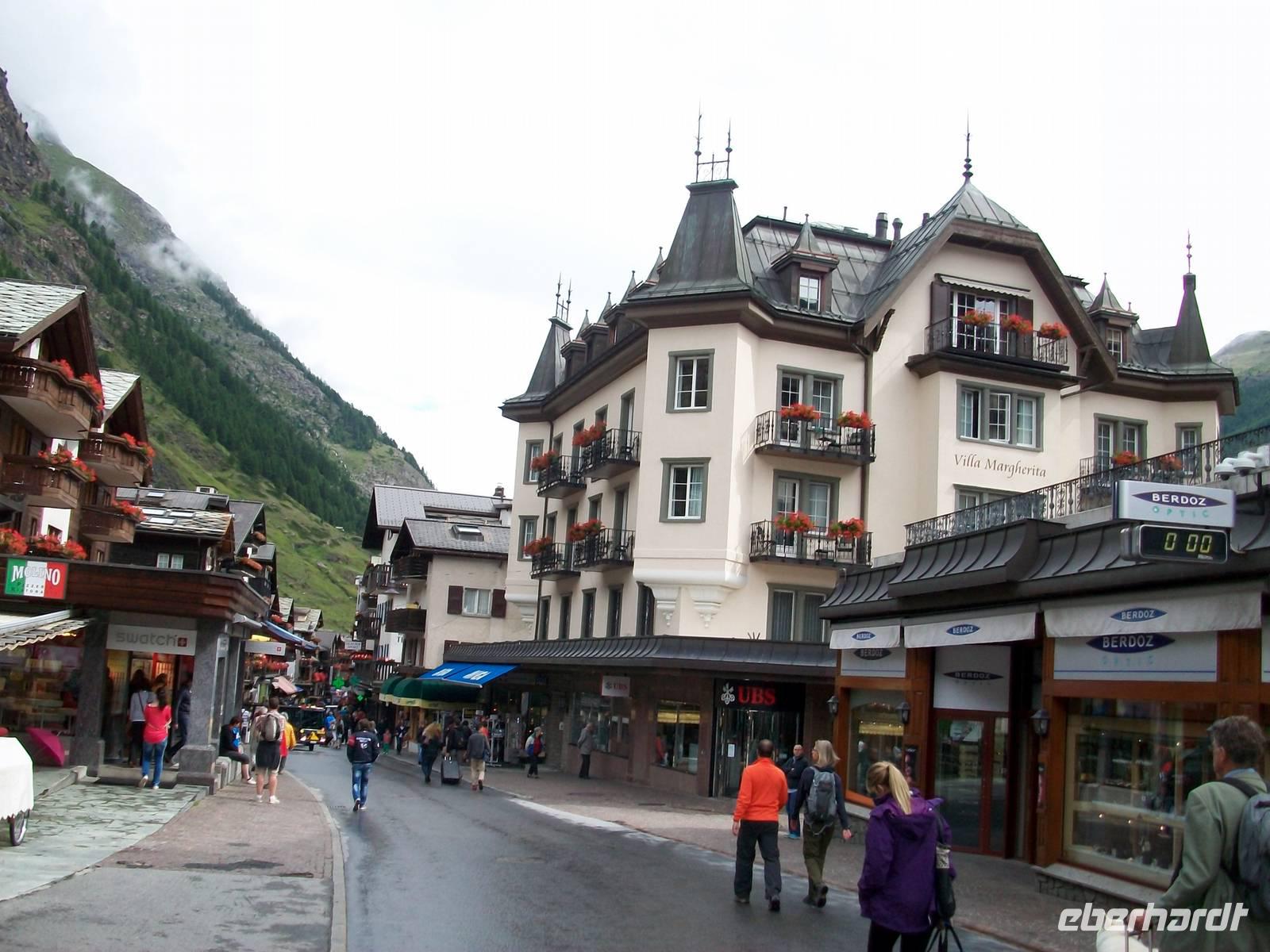 Wir unternehmen einen kleinen Bummel durch Zermatt, sehen die uralten Holzhäuser, gelangen dabei über die mondäne Bahnhofstraße und stehen bald im Zentrum des Ortes am Murmeltierbrunnen. Dieses Kunstwerk ist sehr possierlich gestaltet, von hier hat man einen schönen Blick auf die Mauritiuskirche, die noblen Hotels und das quirlige Leben der Besucher aus allen Kontinenten dieser Welt. Nun hat sich auch kurz ein Teil des Matterhorns gezeigt, schnell werden Fotos geschossen denn bald verbirgt sich dieser grandiosen Berg wieder vor unseren Blicken.