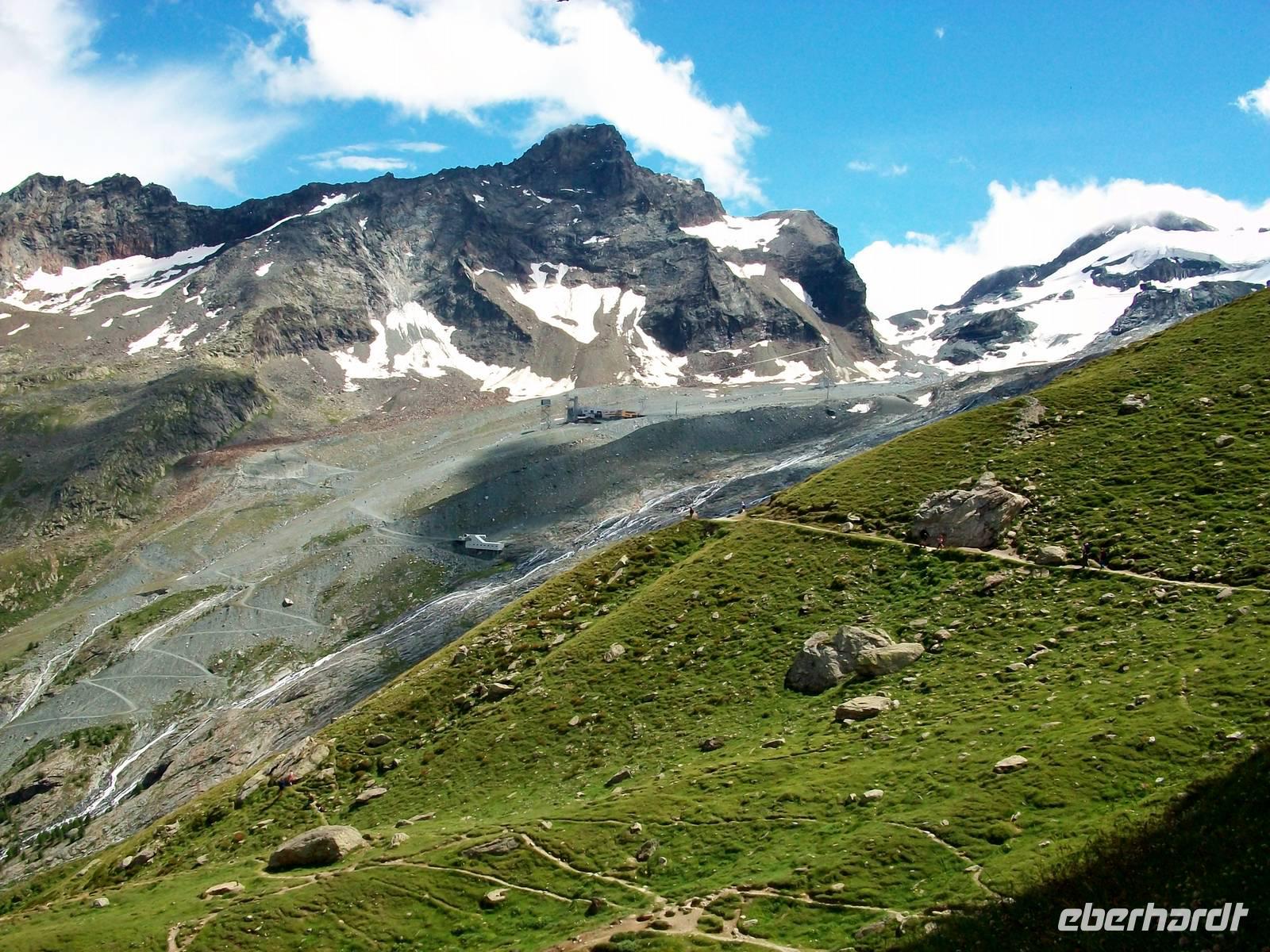 Außerordentlich ist die Auffahrt auf den Allalin. Die letzte Etappe erfolgt mit der Metro Alpin, einer Standseilbahn die in der Dunkelheit des Berges blitzschnell die Gäste zur Bergstation bringt. Oben angelangt kann sich das Auge des Betrachters über eine gigantische Bergwelt erfreuen, es ist das Gebiet ewigen Schnees und hier ist auch das ganze Jahr Skisport möglich, davon zeugen auch heute zahlreiche Skifahrer die lustig die Pisten herunterfahren.