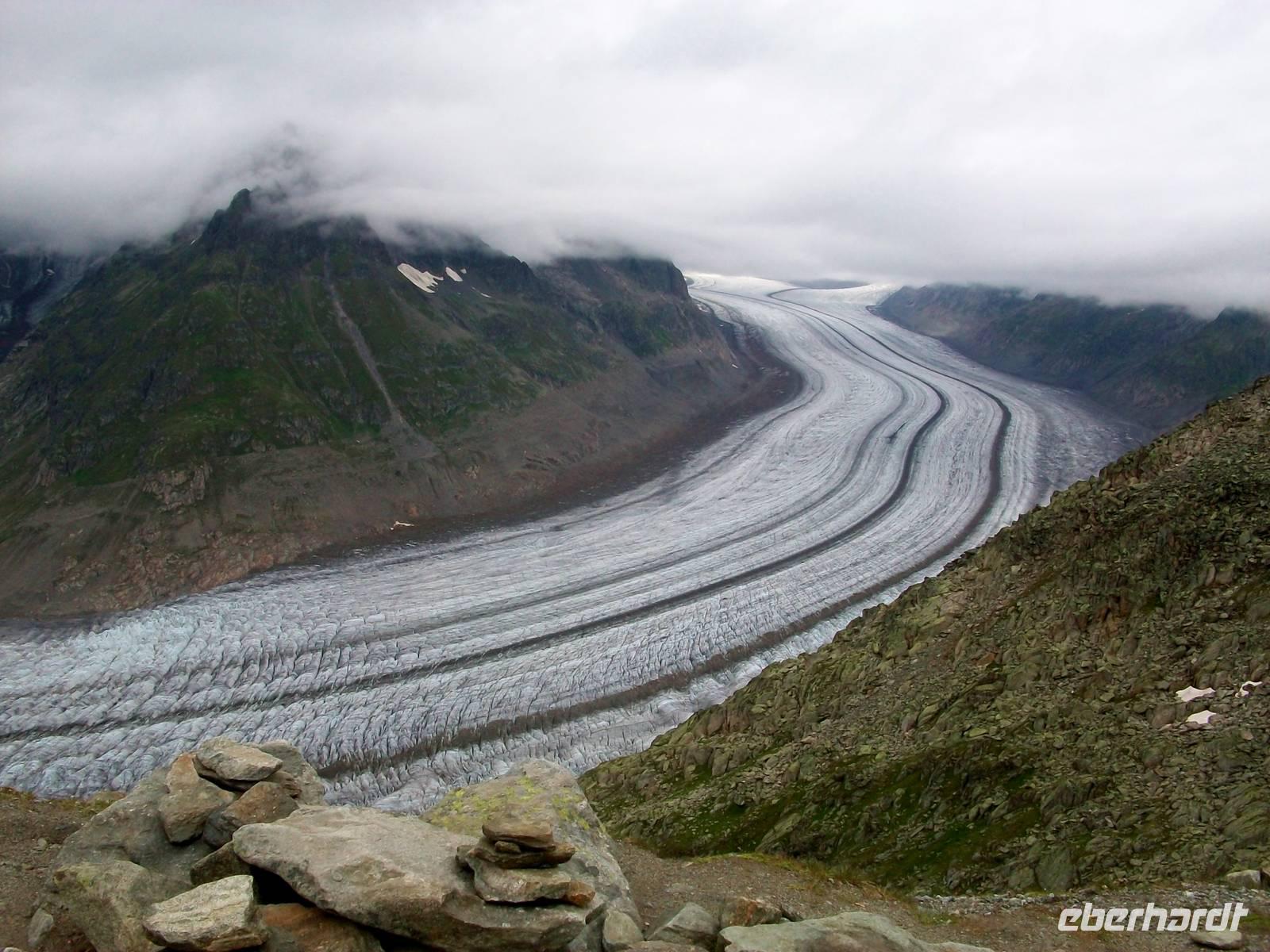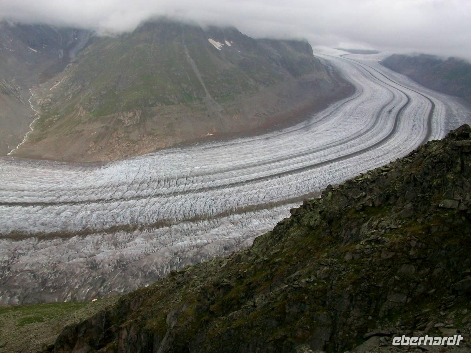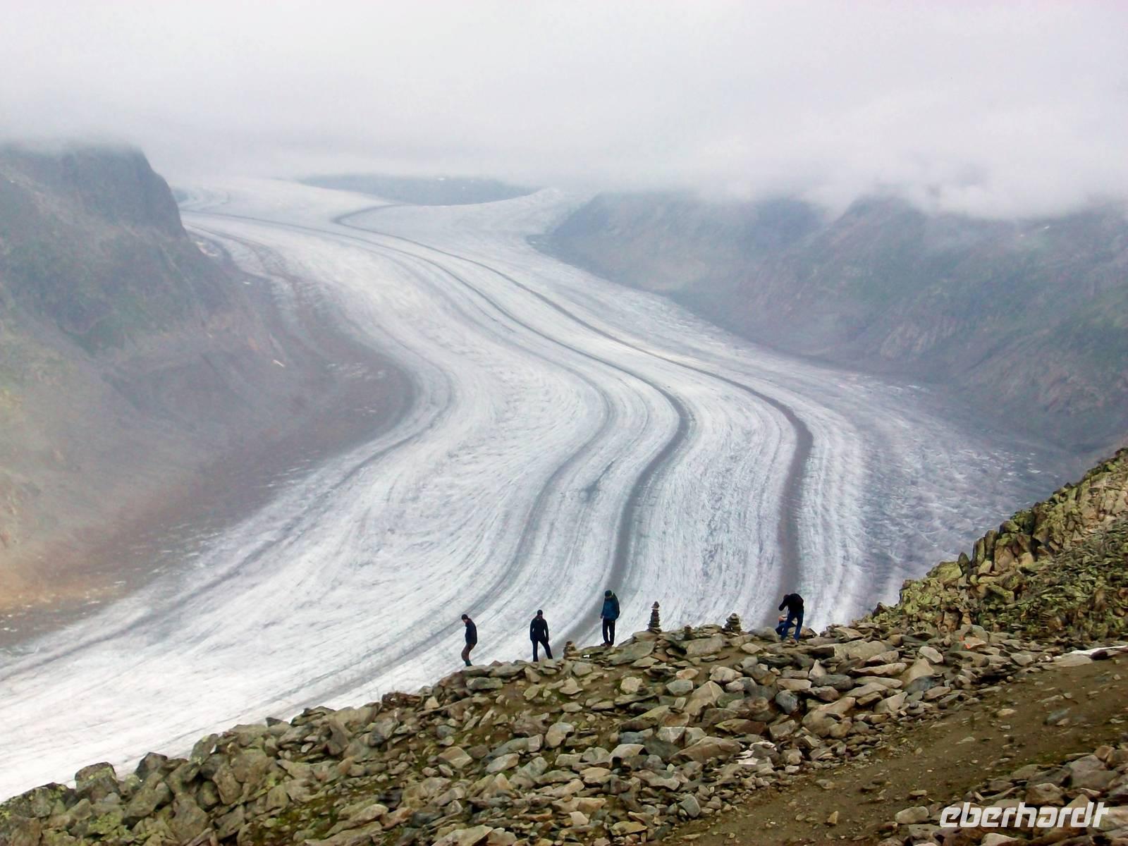Nur wenige Meter und wir sehen den gigantischen Eisstrom des Aletschgletschers. Das ist schon ein gewaltiger Anblick wie sich die Eismassen durch das Tal ziehen, dazu wirft die Sonne vorsichtige Strahlen auf dieses Naturwunder- das Auge kann sich daran kaum satt sehen!