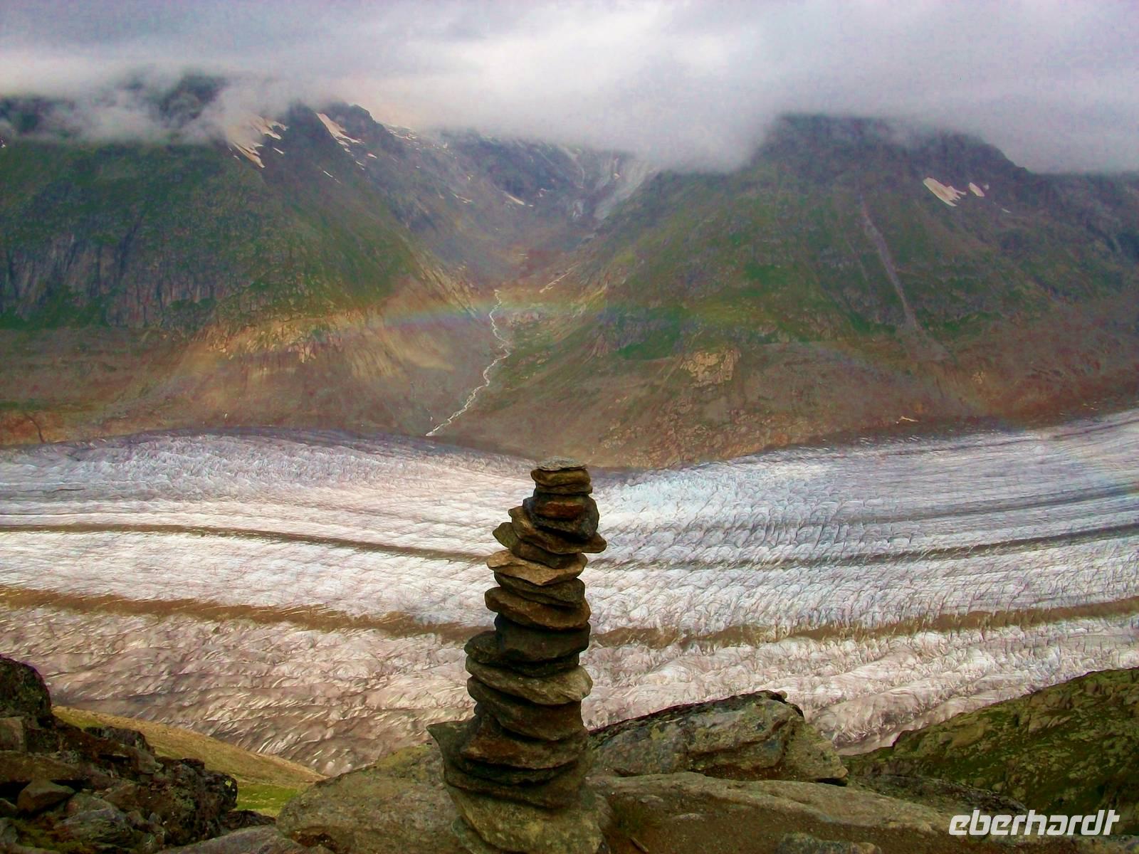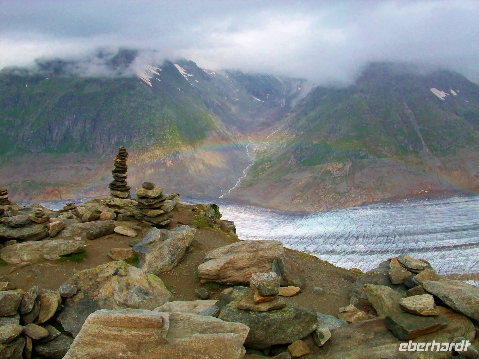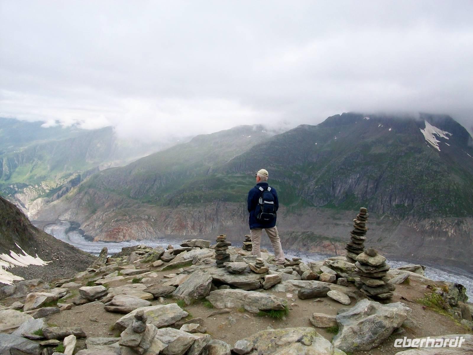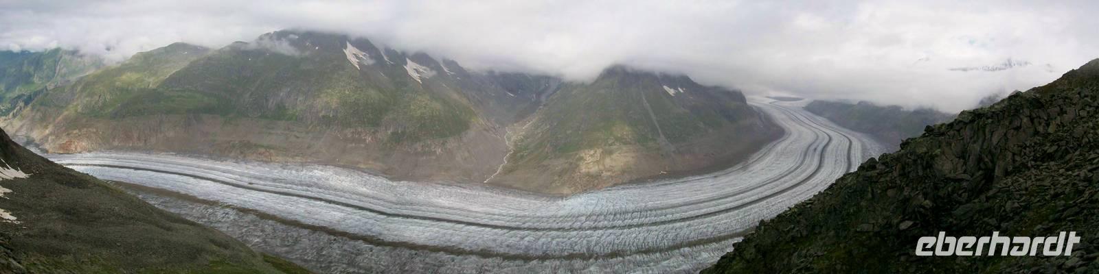 Nur wenige Meter und wir sehen den gigantischen Eisstrom des Aletschgletschers. Das ist schon ein gewaltiger Anblick wie sich die Eismassen durch das Tal ziehen, dazu wirft die Sonne vorsichtige Strahlen auf dieses Naturwunder- das Auge kann sich daran kaum satt sehen!