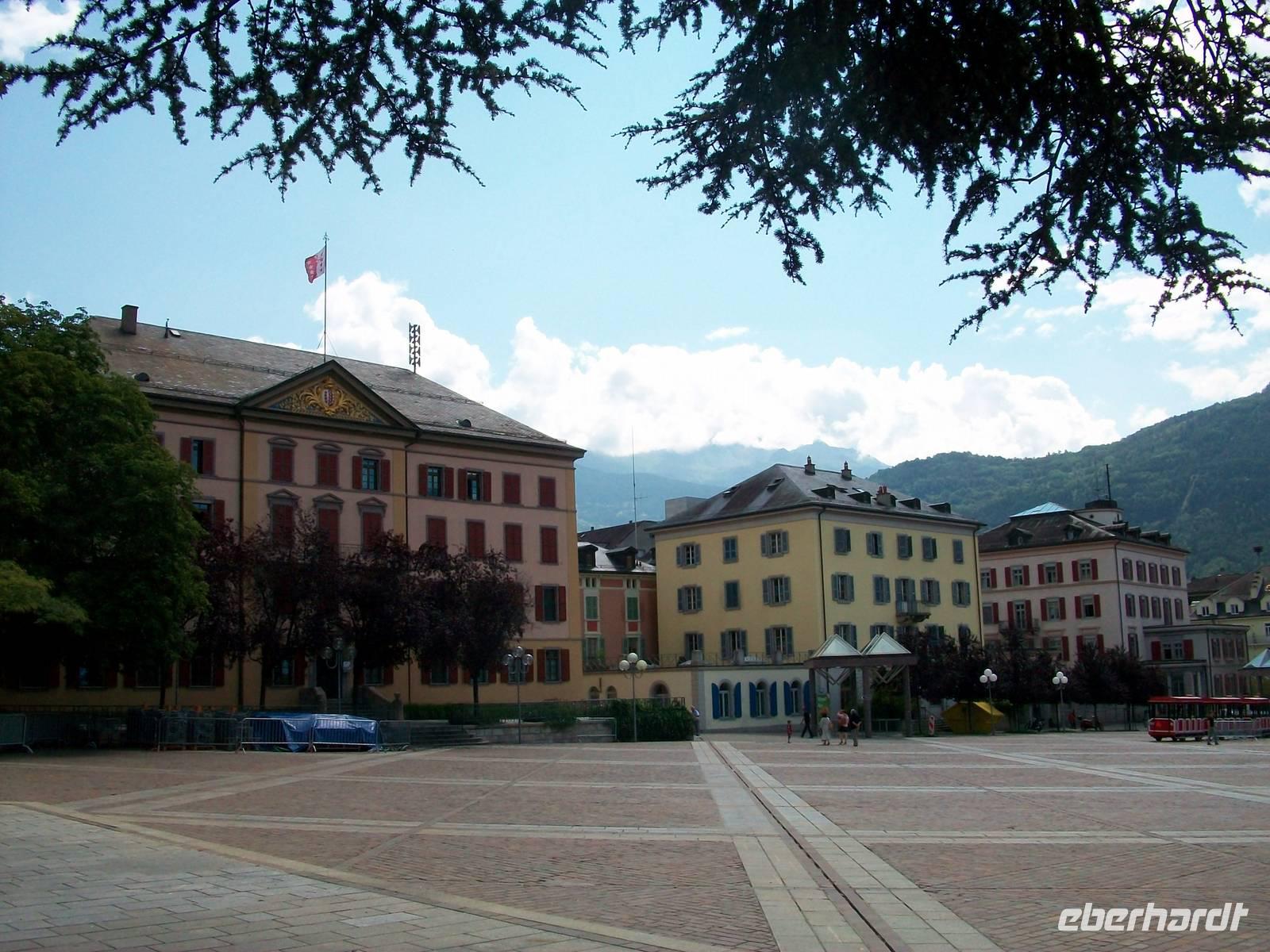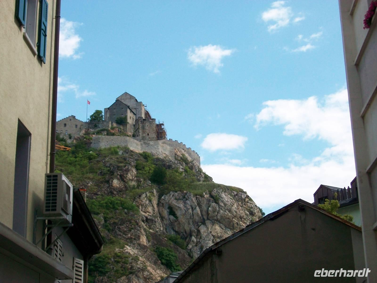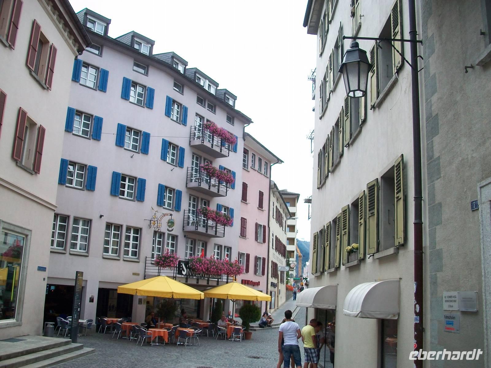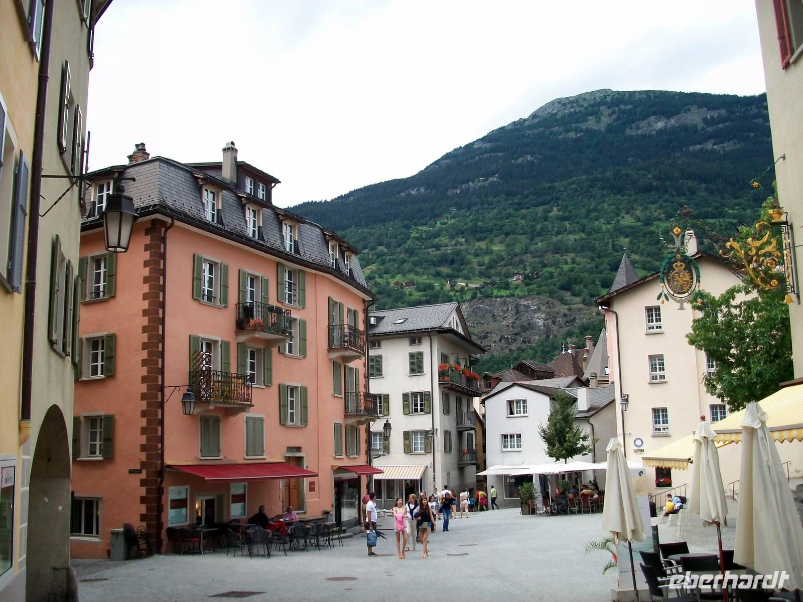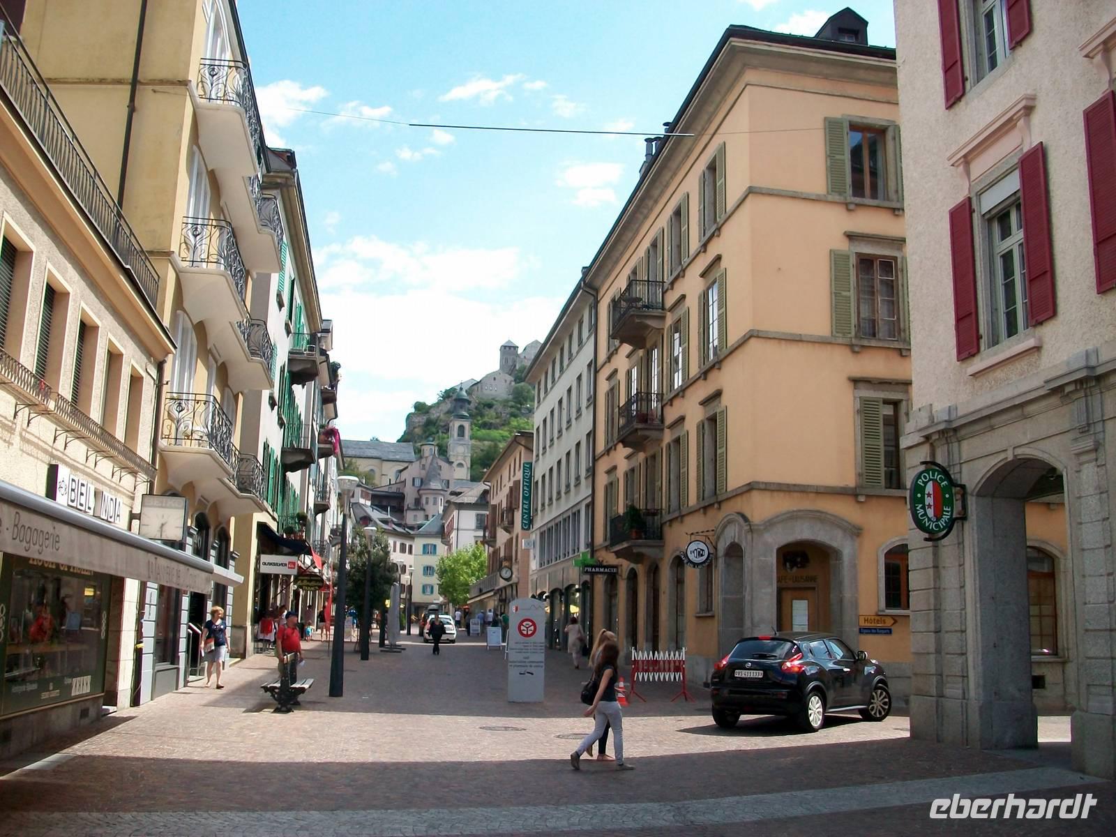 Als wir dann wieder am Tageslicht sind, verwöhnt uns warm die Sommersonne und bei weiterhin schönem Wetter erreichen wir die Walliser Kantonshauptstadt Sion. Ein kurzer Weg durch den Park und wir sind schon in der Altstadt angelangt. Der Bummel führt durch die quirlige Fußgängerzone die gesäumt ist von schönen und gepflegten Häusern.