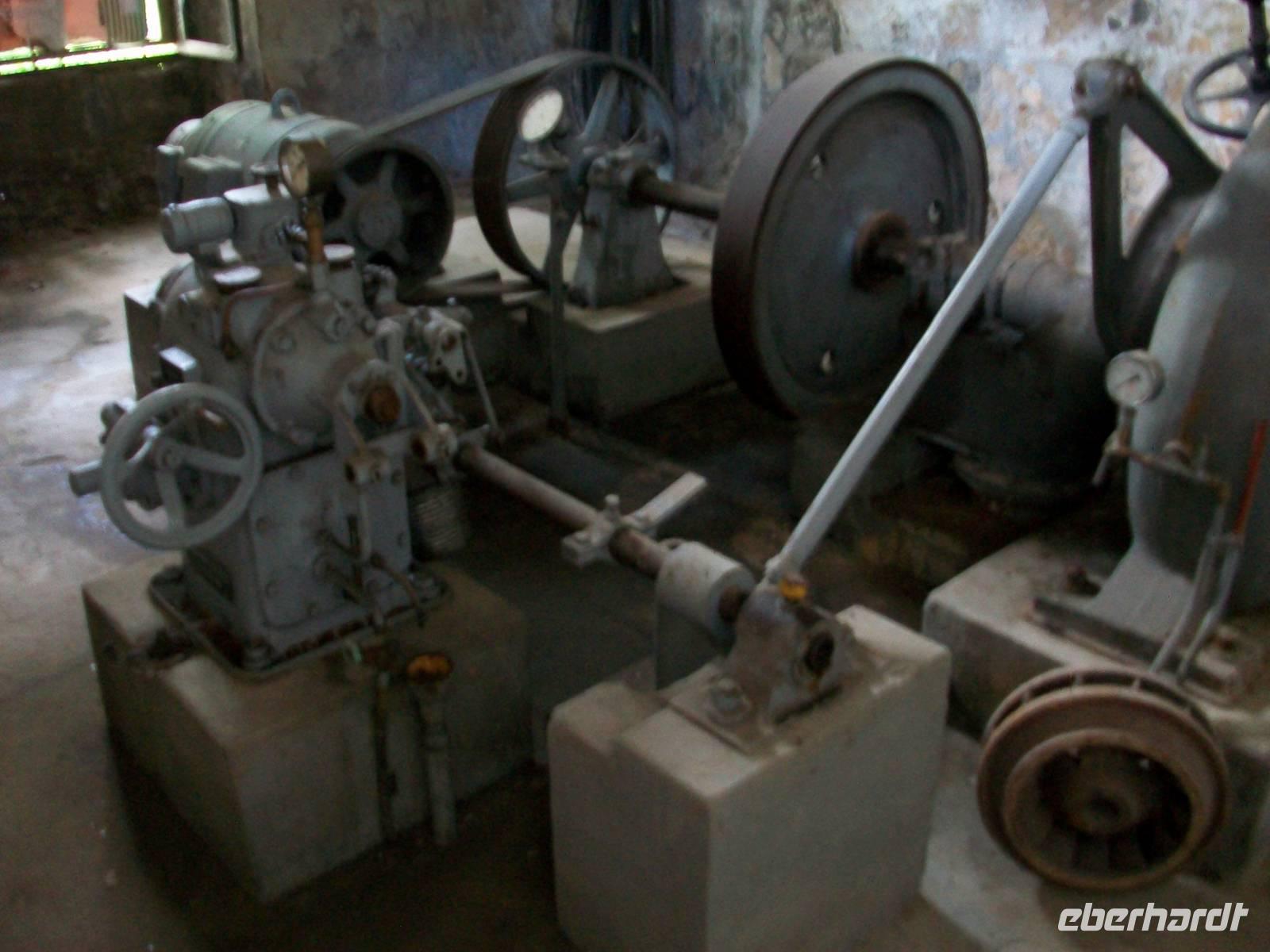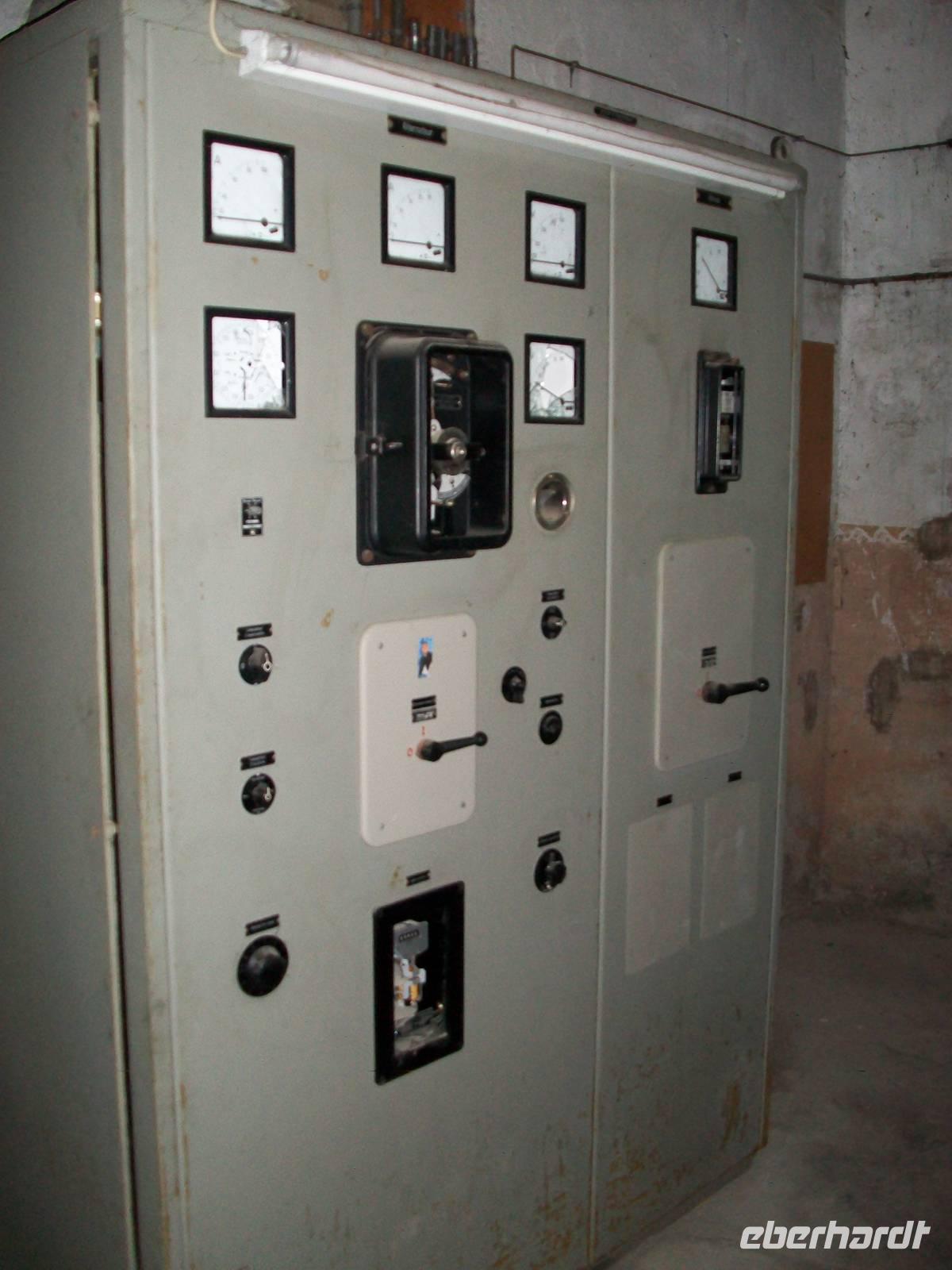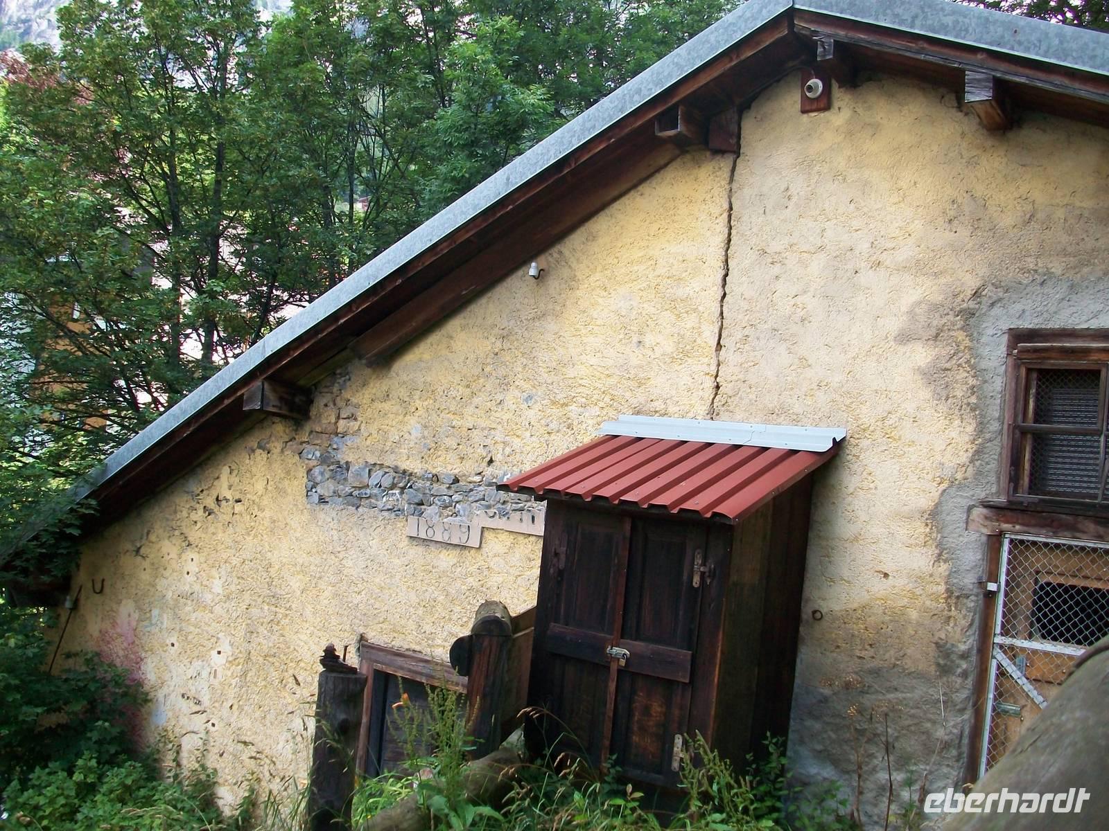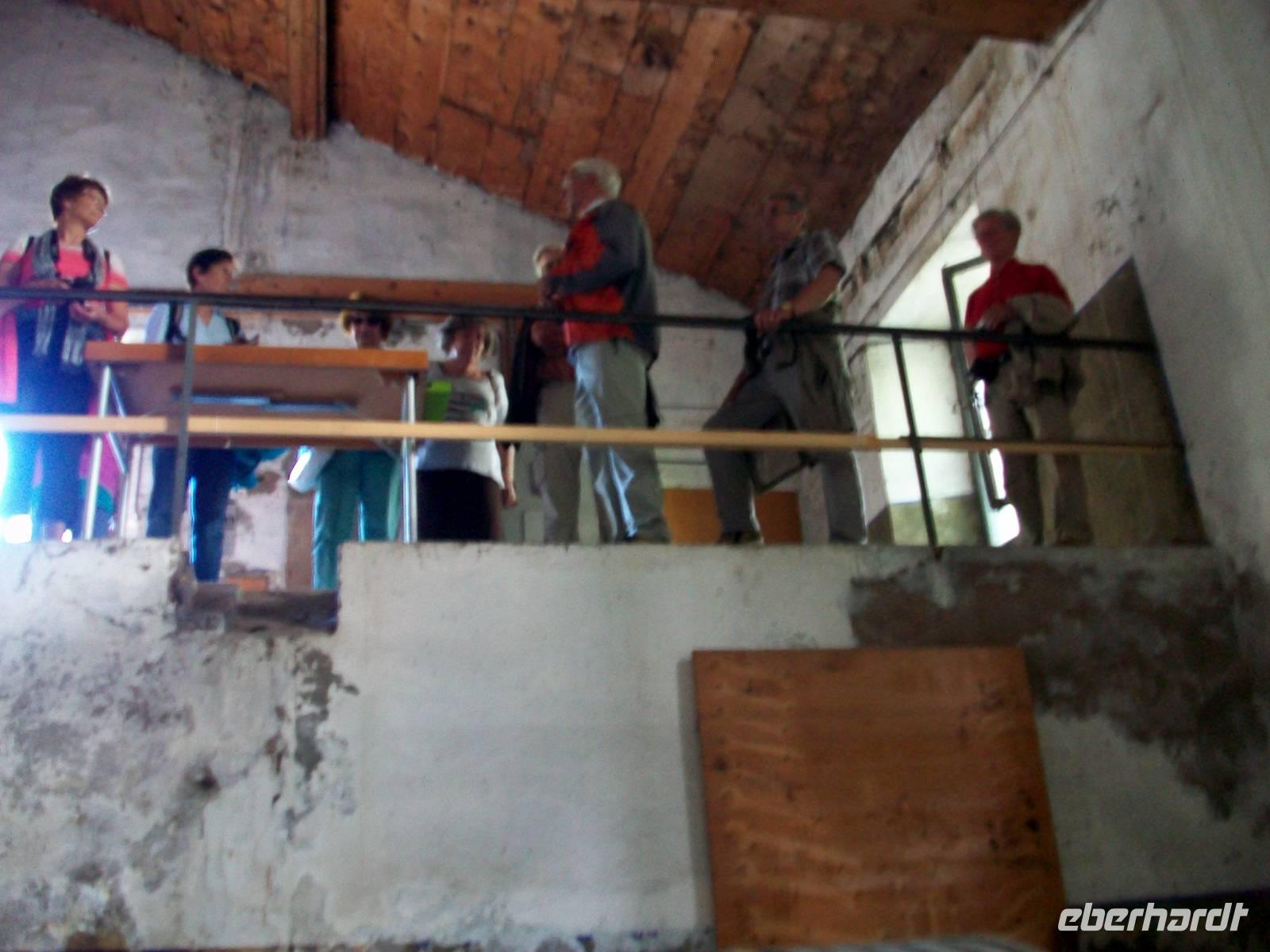Dann hat Herr Tschopp noch eine besondere Überraschung parat; über eine Wiese und einem Trampelpfad gelangen wir in ein verlassenes Haus. Wir sehen unten eine Turbine und an der Seite einen Schaltschrank mit verschiedenen Messinstrumenten. Es war einmal ein Wasserkraftwerk und es ist das Älteste im Wallis, also ein technisches Denkmal, allerdings in einem recht traurigen Zustand.