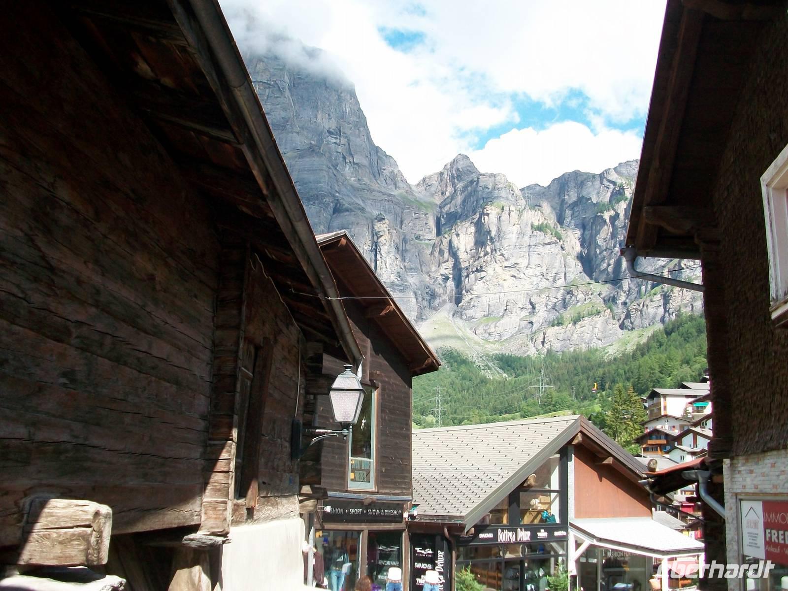 Die steil aufsteigenden Felsen kommen uns bedrohlich nahe und die Straße schlängelt sich durch die schmale Schlucht die sich aber bald zu einem gigantischen Talkessel öffnet in dem der Ort Leukerbad liegt- das ist unser Ziel.