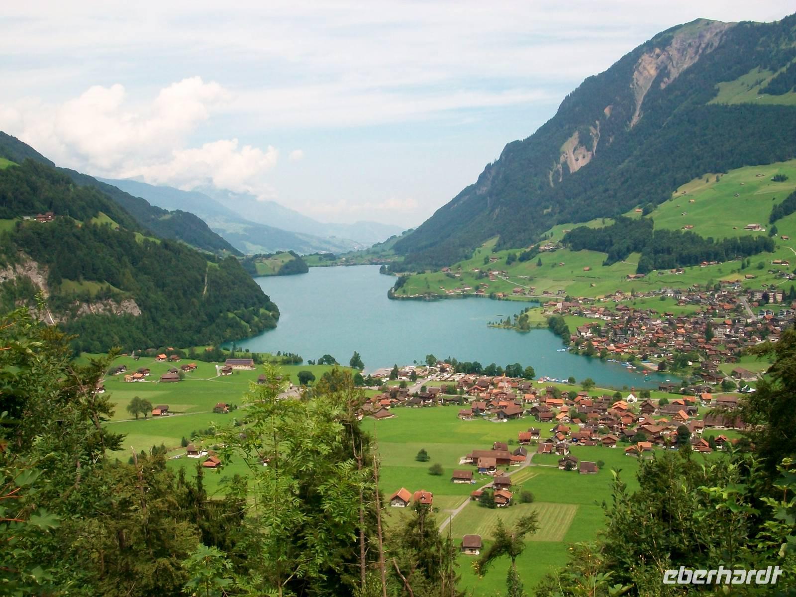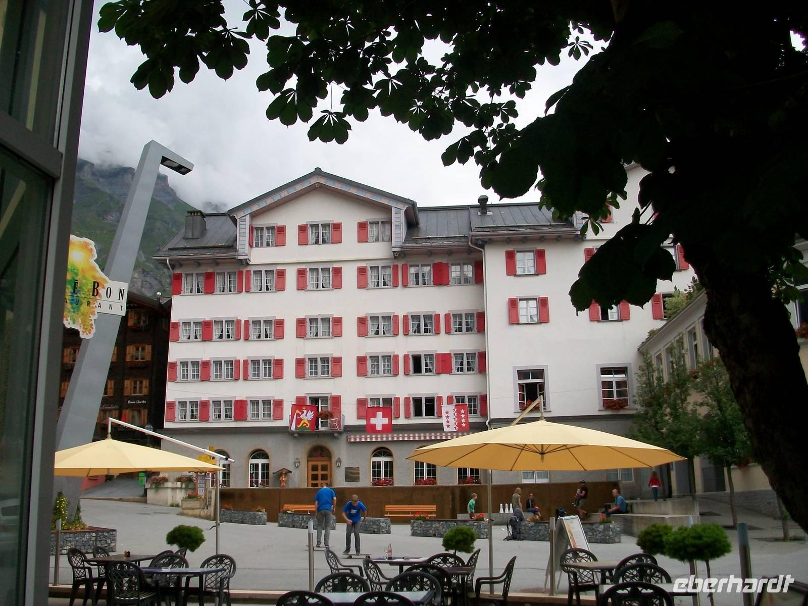 Aber wissenswert war es dennoch; wir besuchen noch die Kirche und beenden dann die Führung. Mit diesen Informationen versehen, beginnt nun die ausgiebige Freizeit im reizvollen Ort. Das Wetter ist an diesem Vormittag recht schön, die Berge die vom Talkessel steil aufsteigen sind nahezu frei und so lohnt die Auffahrt zum Gemmi- Stock mit der Seilbahn. Von oben wird der Betrachter mit einem wirklich grandiosen Ausblick belohnt der wirklich unvergesslich ist.