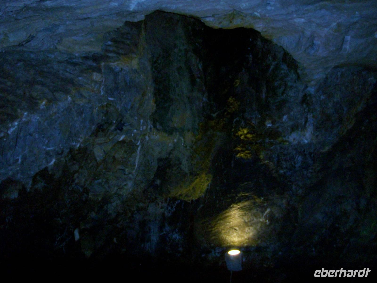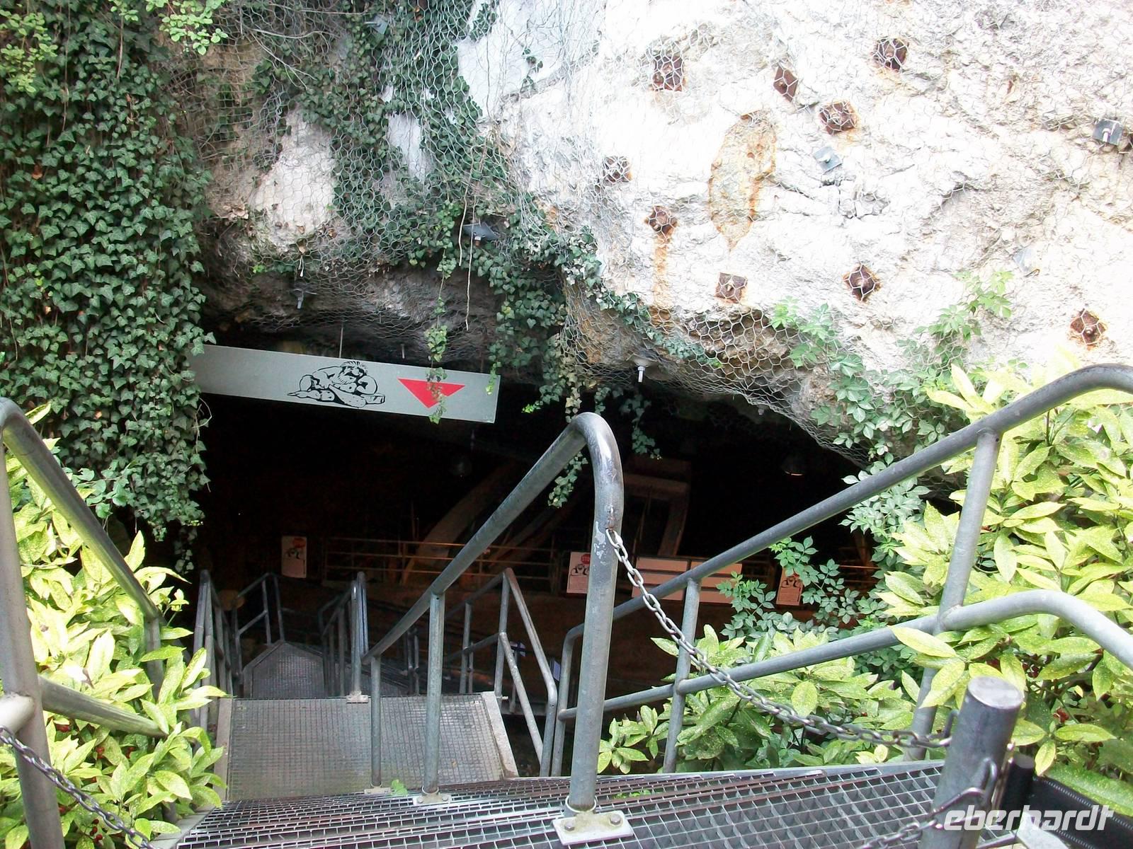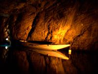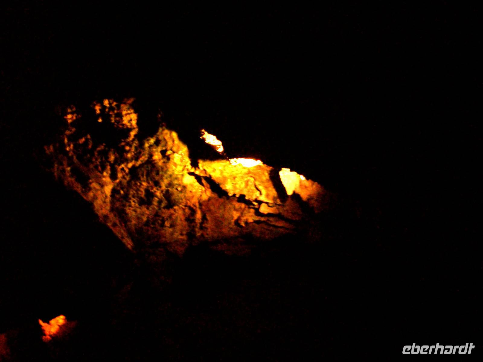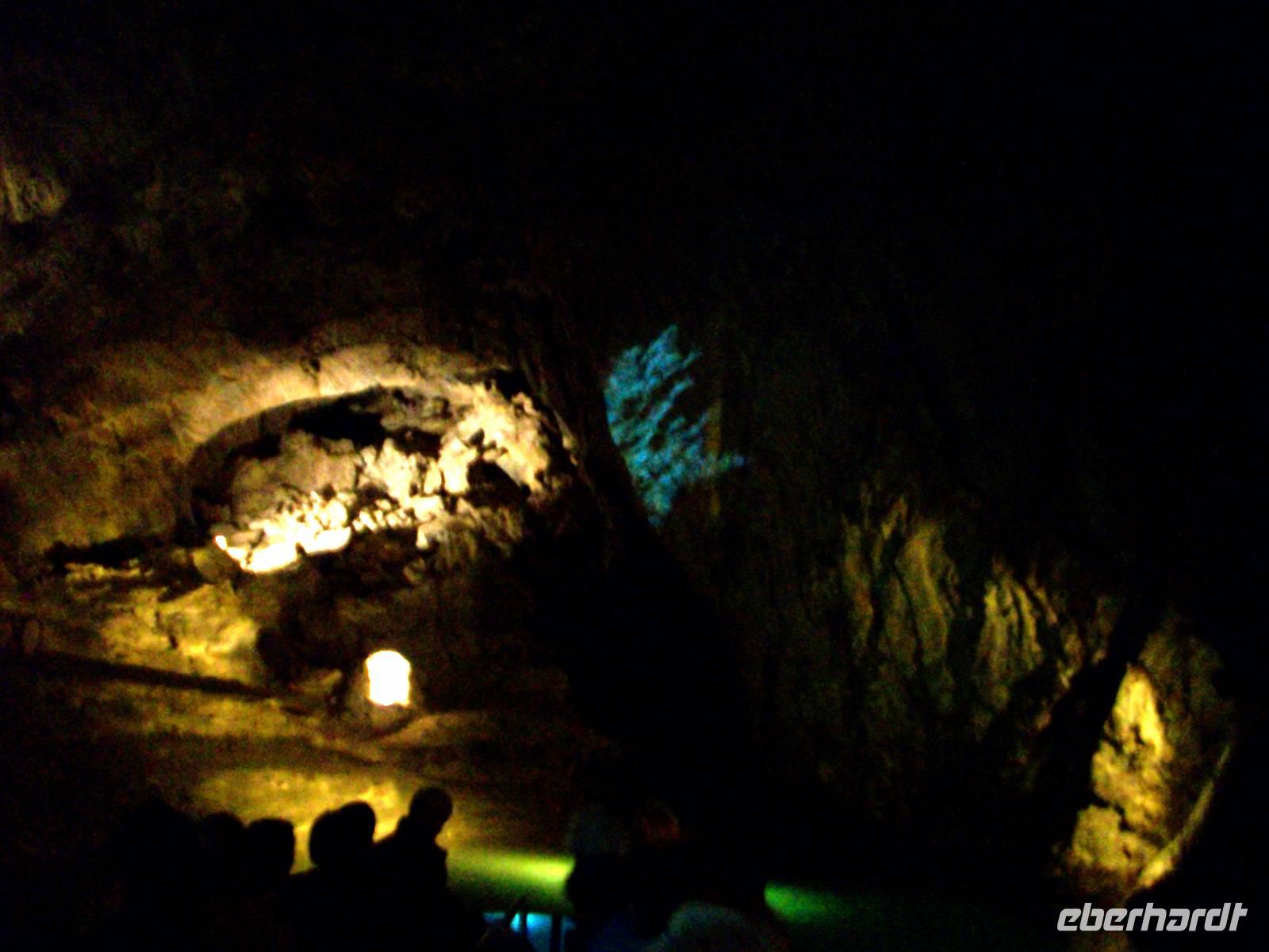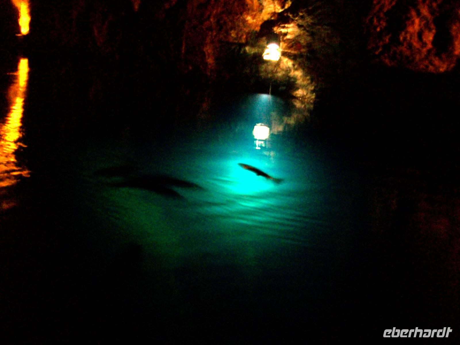 Dann geht es wenige Stufen hinauf und wir erreichen den Eingang zum Lac Souterrain, dem unterirdischen See. Bald werden wir von einem jungen Mann abgeholt, er wird uns nun mit dem Boot in diese geheimnisvolle Höhle hineinrudern. Nachdem wir alle Platz gefunden haben geht es los; hier in dieser Höhle sind es konstant 15° Celsius. Wenige Ruderschläge bringen uns hinein, wir können in dem glasklaren Waser bis zum Grund schauen; hier unten leben Forellen die unser Boot umkreisen. Die Höhle ist in ein spärliches Licht getaucht welches die Wände und das Wasser mystisch beleuchtet. Dabei erfahren wir wissenswertes über die Flora und Fauna dieses unterirdischen Sees, die Geologie bringt uns Erkenntnisse über die Entstehung dieses Phänomens.