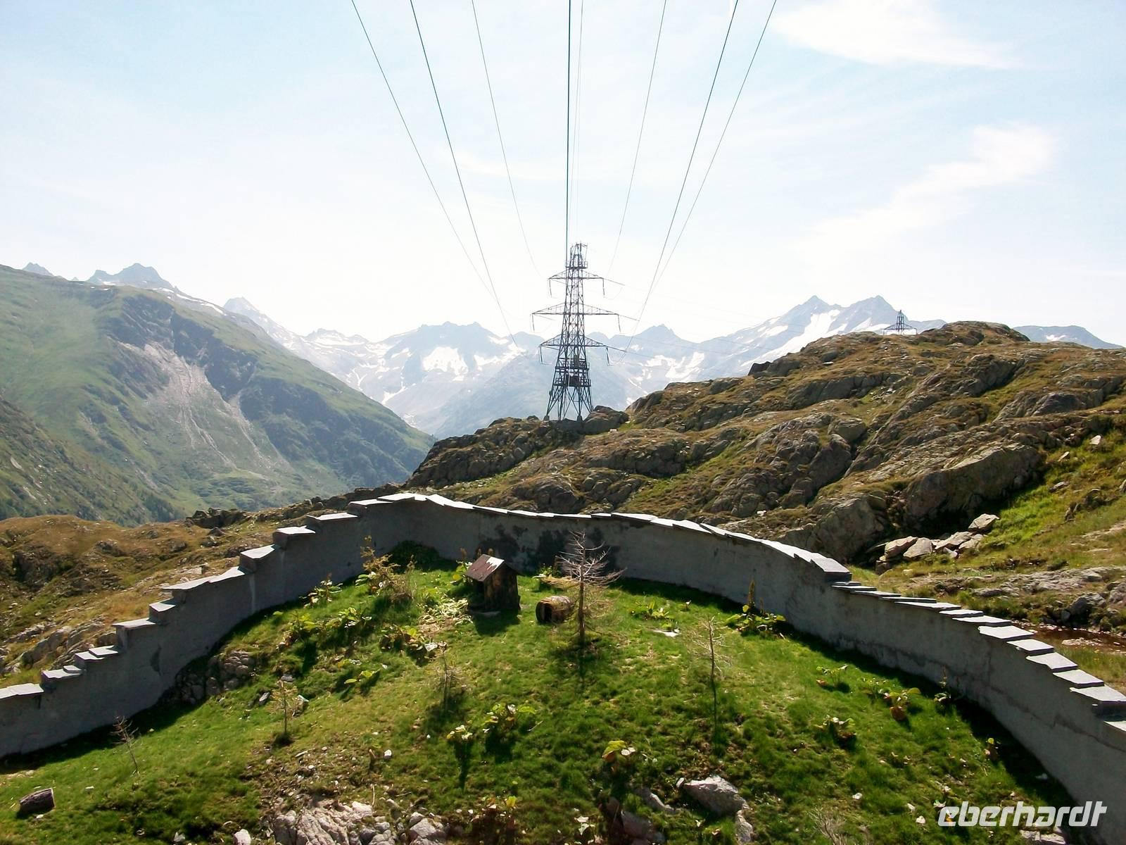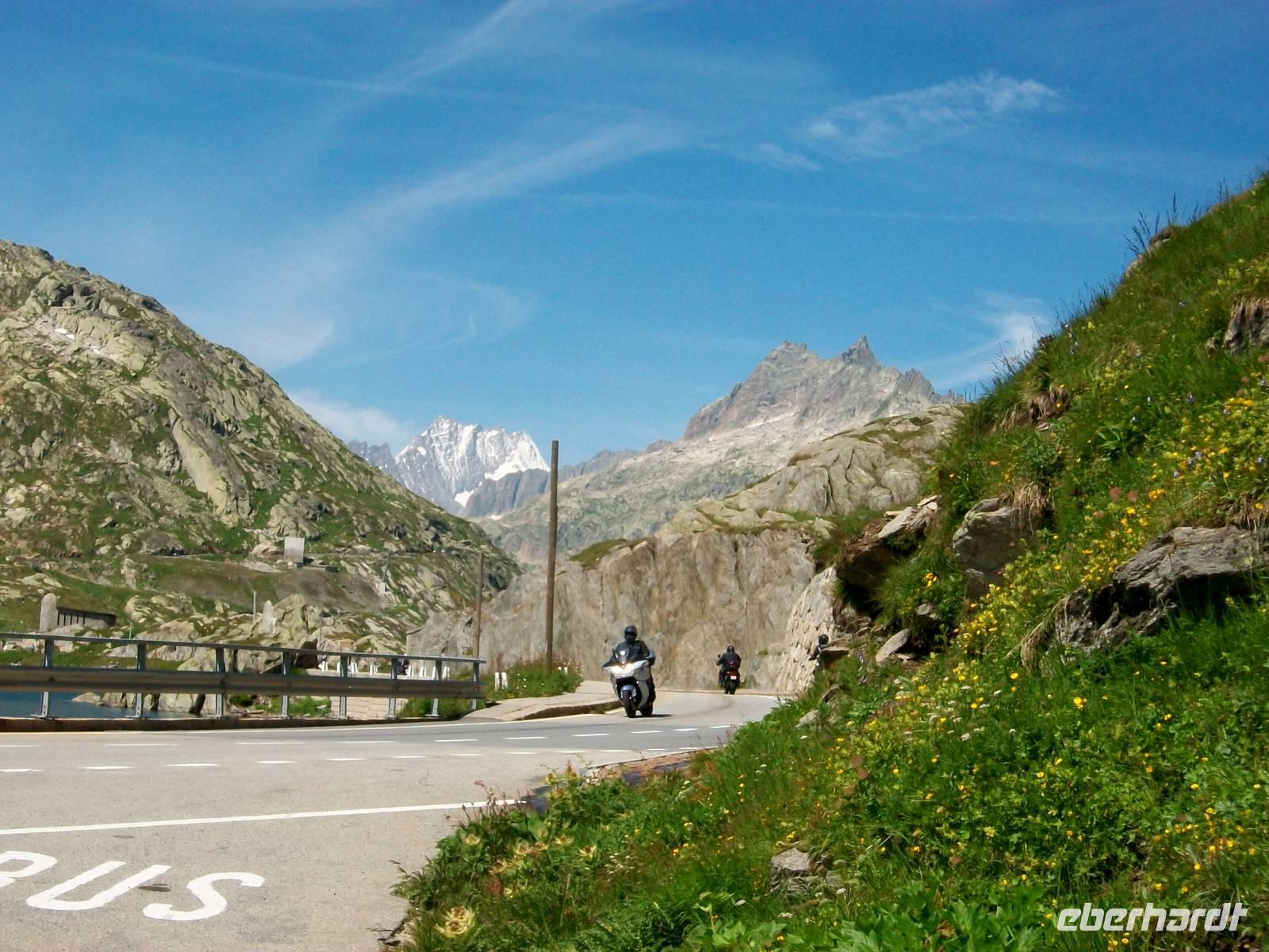 Wir gelangen zum Ort Gletsch und an die Kreuzung die wir schon passiert haben als wir am zweiten Tag vom Furka- Pass heruntergekommen sind. Nicht minder spektakulär ist die Fahrt heute hinauf zum Grimselpass. Vor uns sind die atemberaubenden Serpentinen aufgetaucht die uns noch einmal auf die Höhe von über 2 200 Meter bringen werden. Im Süden sind die schneebedeckten Berge zu sehen die das Wallis vom Tessin trennen, der Sonnenstube der Schweiz.